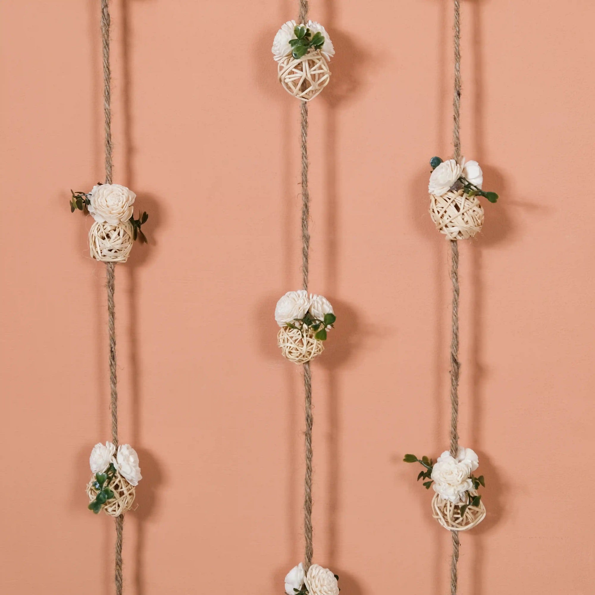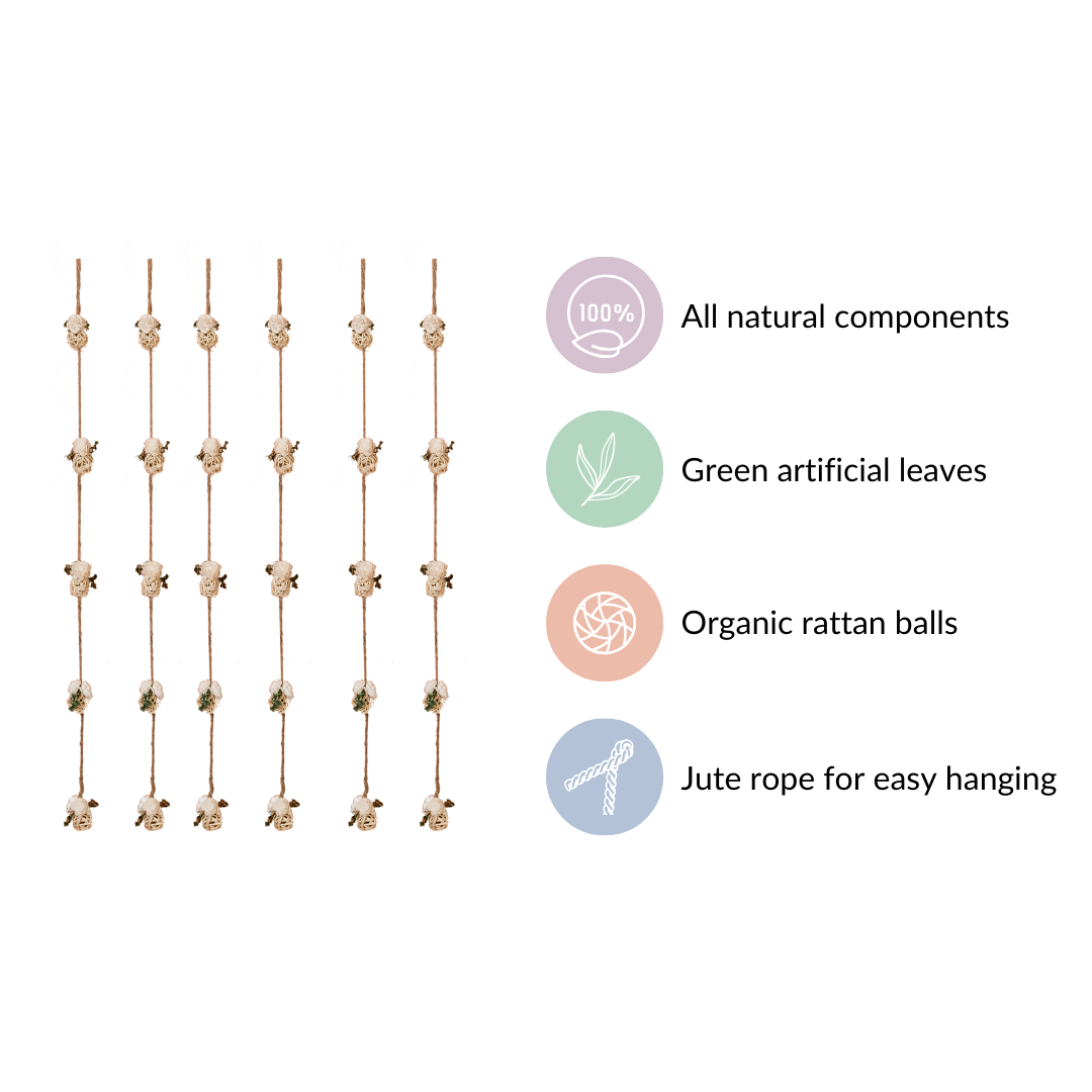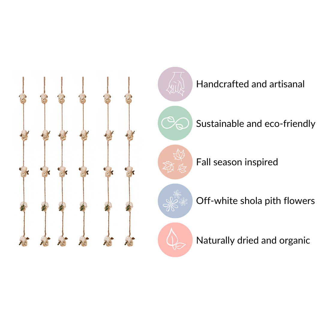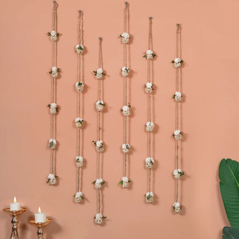 These wall hanging sets are intended especially for indoor use, where they may adorn your living area with their unmatched beauty and seasonal charm. They have been carefully designed for indoor situations with their delicate white shola pith blossoms, naturally dried organic materials, artistically entwined green foliage, and rattan balls. To utilize them outdoors, though, you can place them on display in covered outdoor areas like a screened porch or veranda.