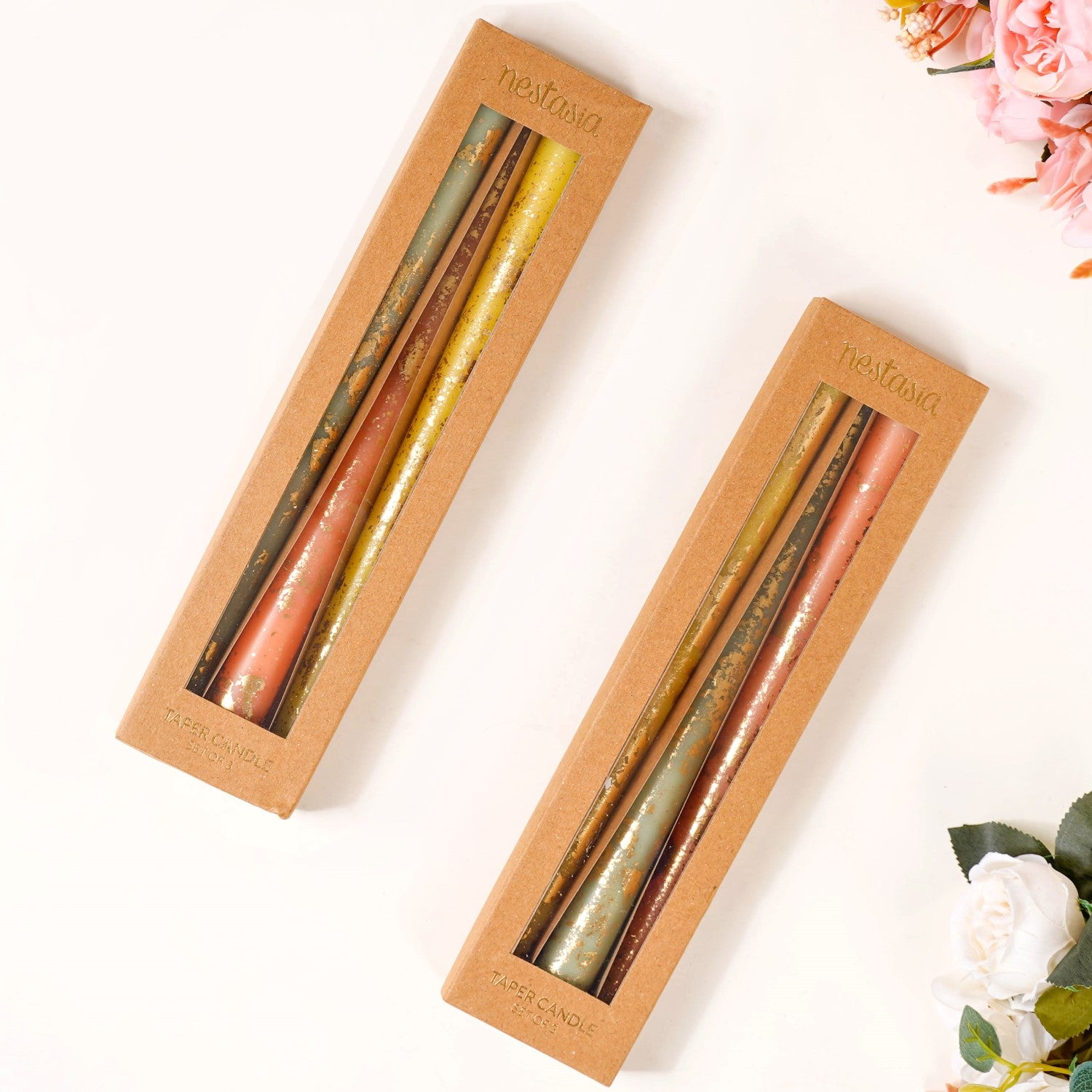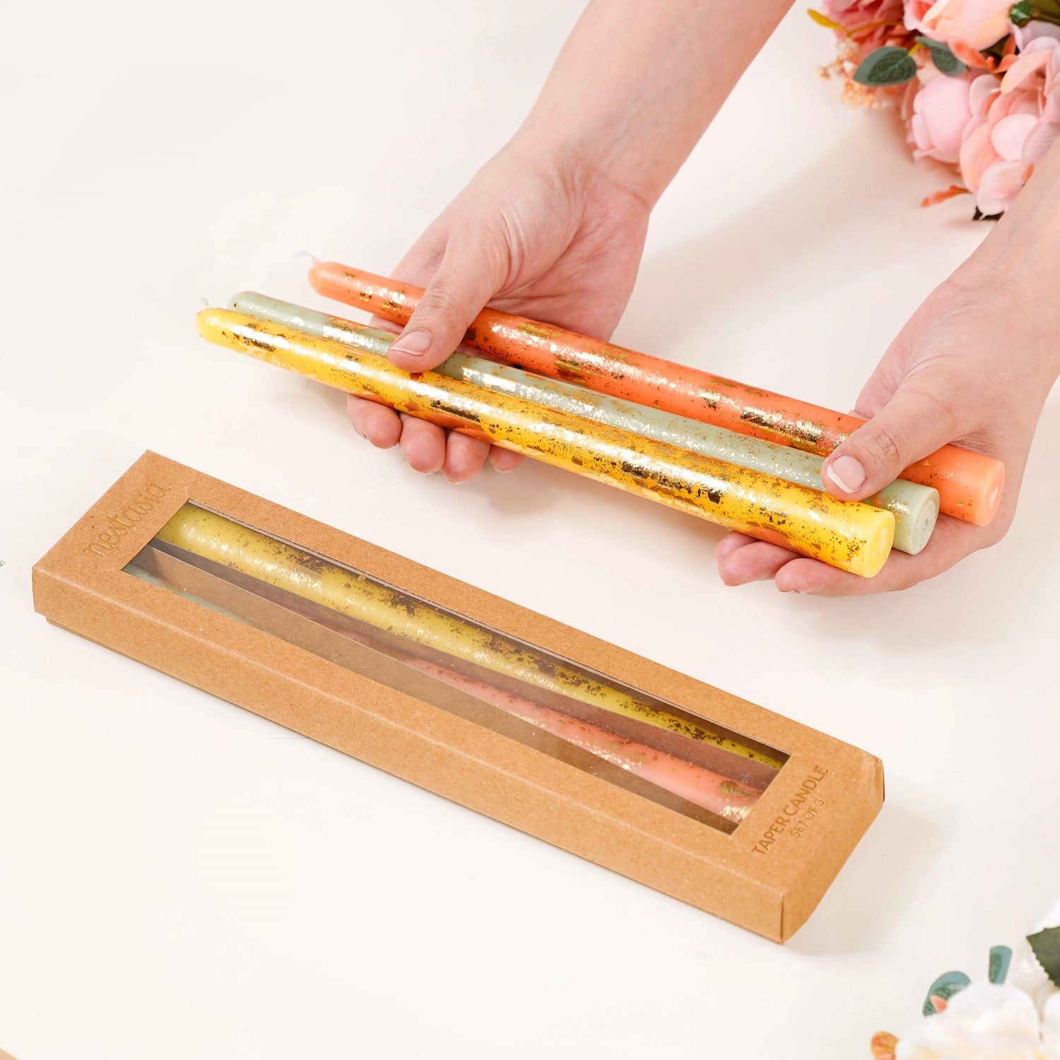 The taper candles come neatly tucked within a box, which is where we recommend storing them when they're not in use. It is also essential to keep them away from direct sunlight and excessive moisture to retain their aesthetics and burn quality.