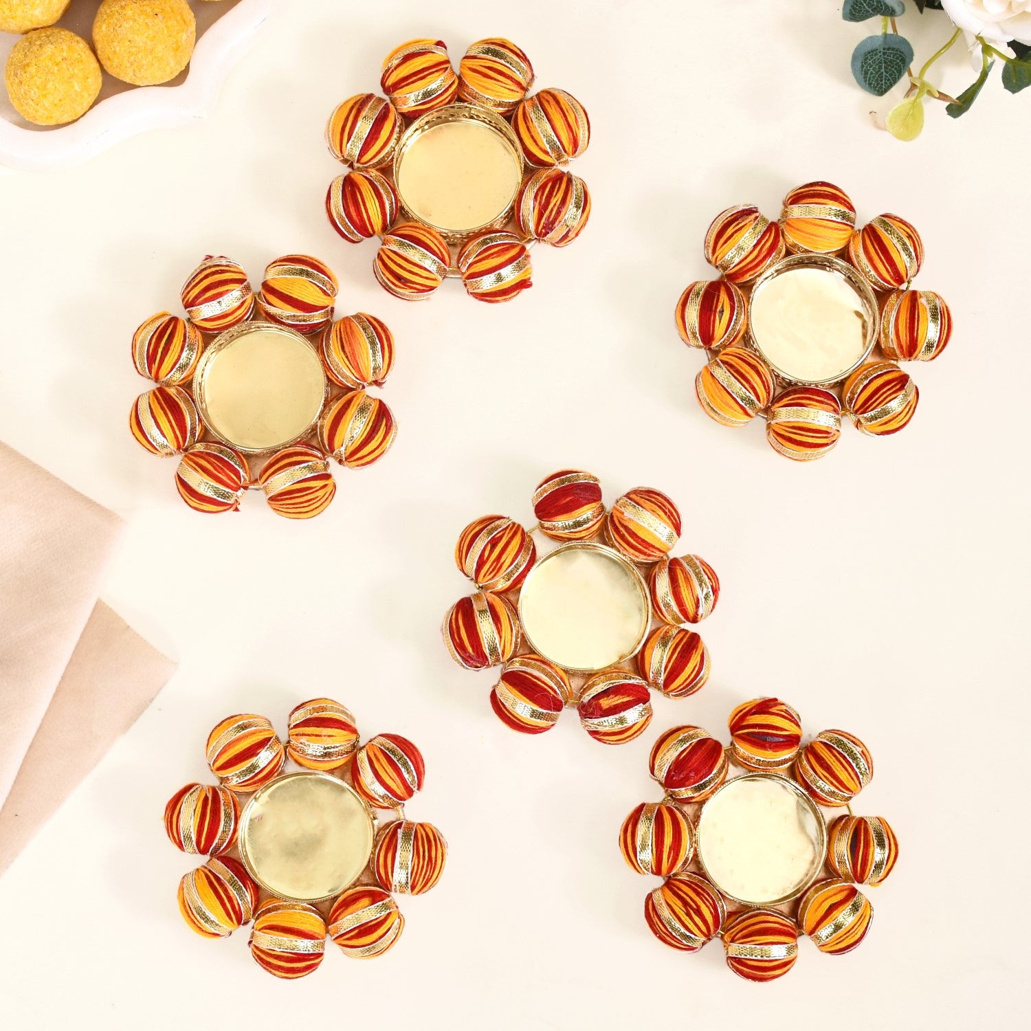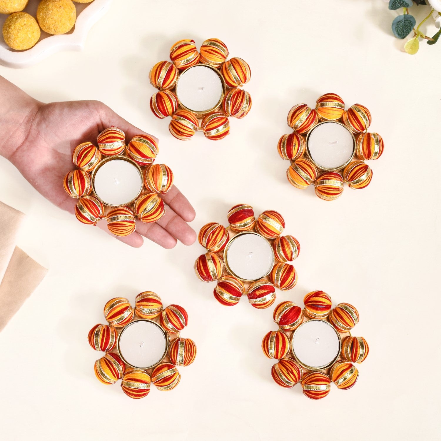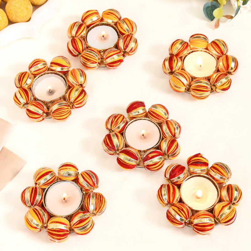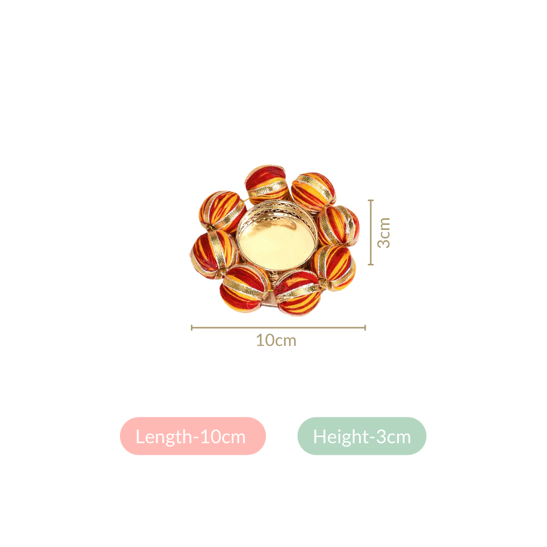 Design: Resting amid large moti balls covered in red-yellow threadwork and glimmering gold lace are thin metal cups with intricate cutwork for a touch of refinement. These meticulously crafted tealights are perfect for adding a pop of colour to every setting.