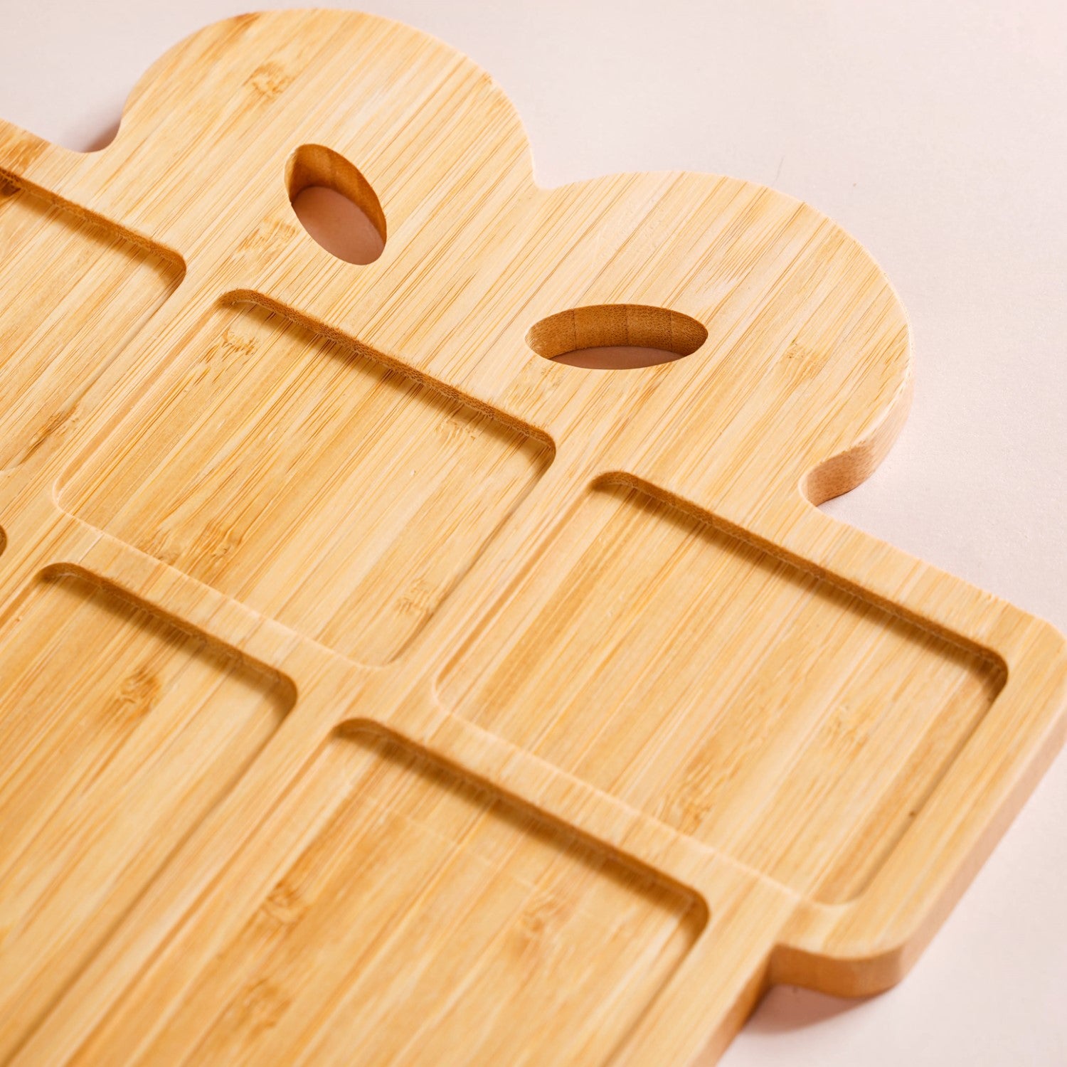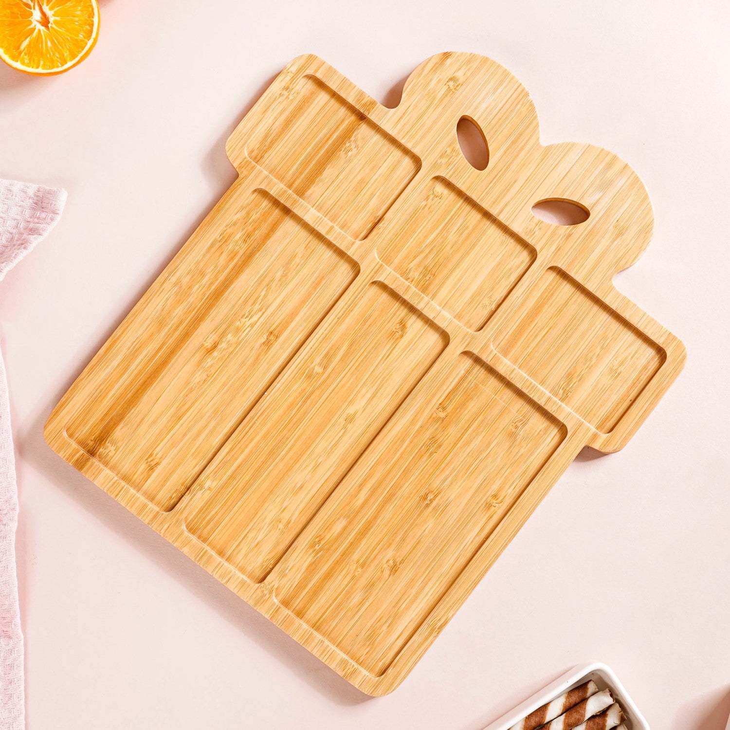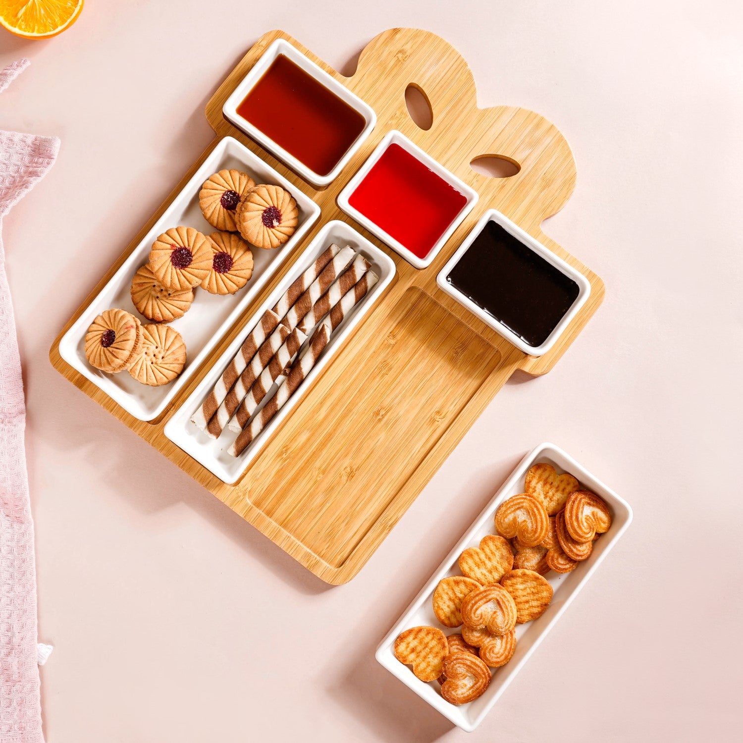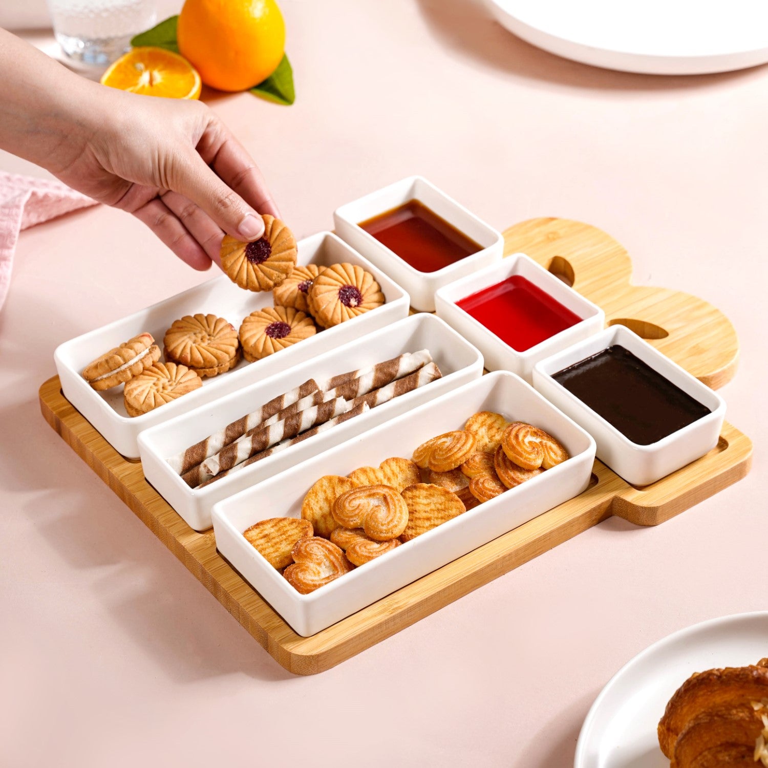 Design: Our platter set showcases a sophisticated minimalist modern design, perfect for regular use and for enhancing any dining experience. Made from premium quality ceramic, each dip bowl and platter exudes durability and elegance. The set's standout feature is its unique gift box shape, which adds a distinctive charm and makes it an eye-catching centerpiece on any table. Complementing the ceramic pieces is a beautifully crafted bamboo wood tray, offering a warm, natural touch that enhances the overall aesthetic.