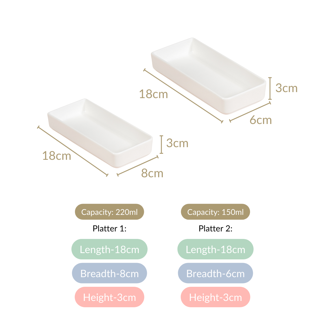 Utility: Our platter set, featuring 3 dip bowls and 3 elongated rectangular platters, offers remarkable utility and versatility for a variety of dining experiences. The premium-quality ceramic dip bowls are perfect for an assortment of sauces, salsas, dressings, and spreads, allowing you to elevate your appetizers and enhance the flavor of your dishes. The elongated rectangular platters are ideal for showcasing an array of culinary delights, from fresh vegetables and finger foods to gourmet cheeses, meats, and sushi.