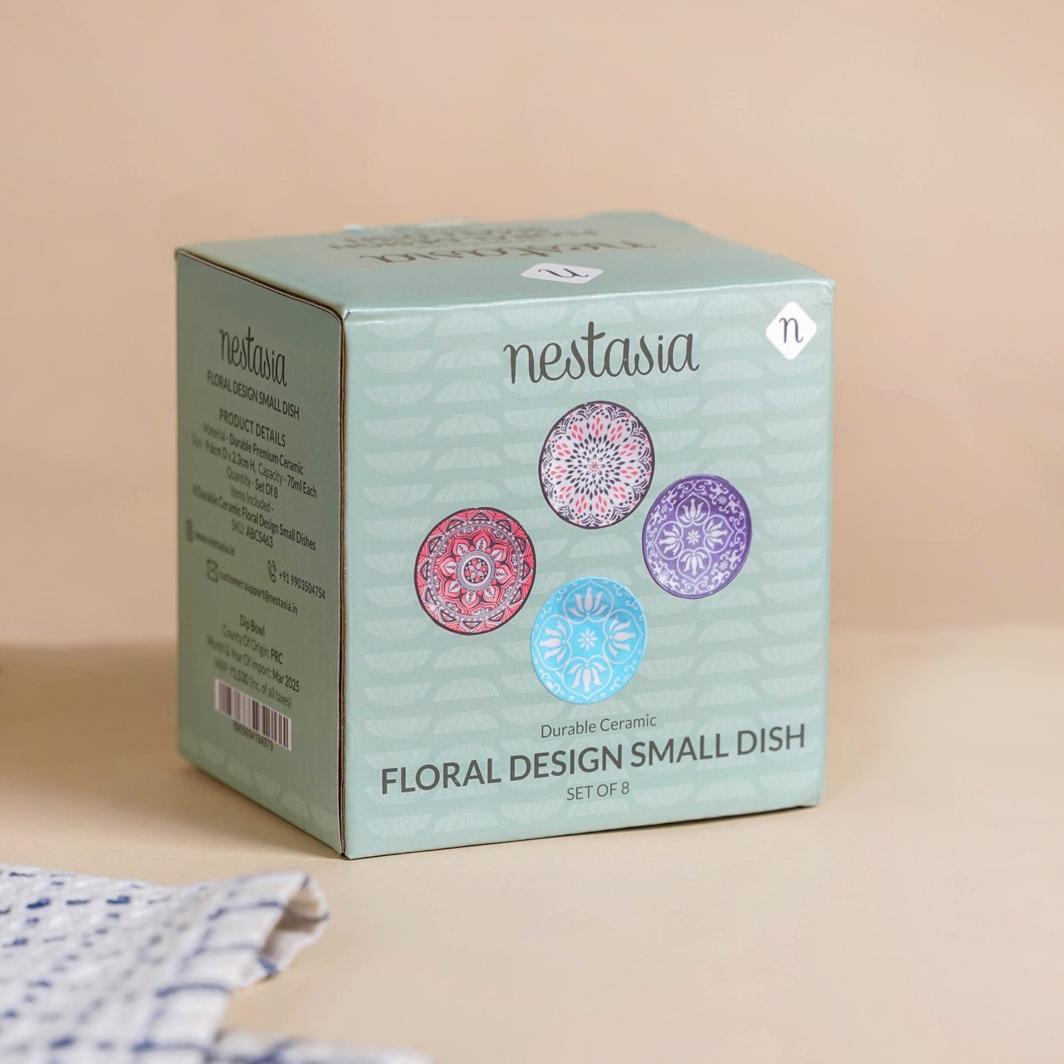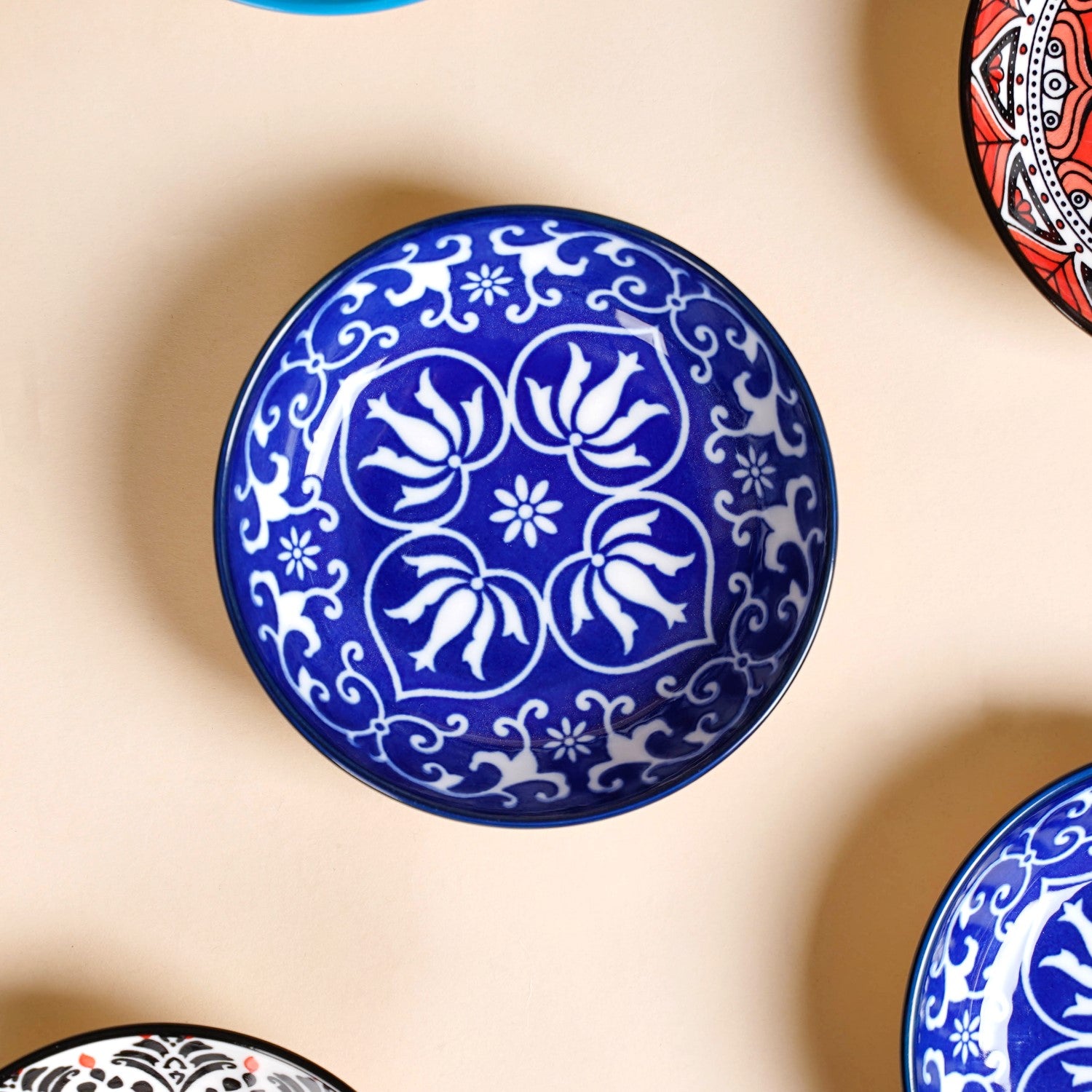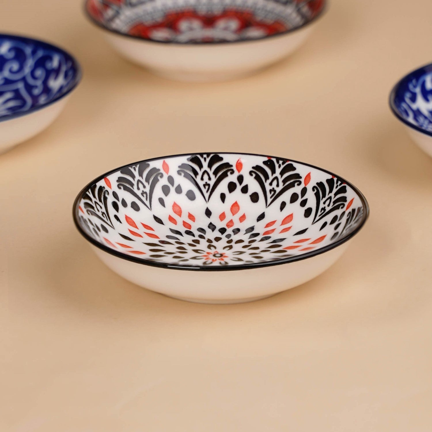 Design: This set of dip bowls comes in four different base colours as well as designs. The set has a pair of each design, making it eight pieces and four pairs. One of the pairs has an ink blue base with symmetrical floral designs in white, while the other pair is light blue with white symmetrical floral designs. The other two pairs have interesting patterns, in which one of the pairs has an ivory background with black and red accents. The fourth pair is primarily red and has a beautiful black and white mandala design.