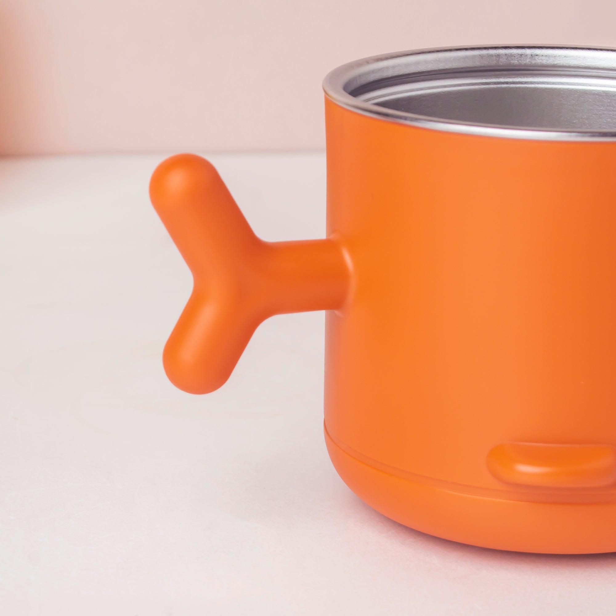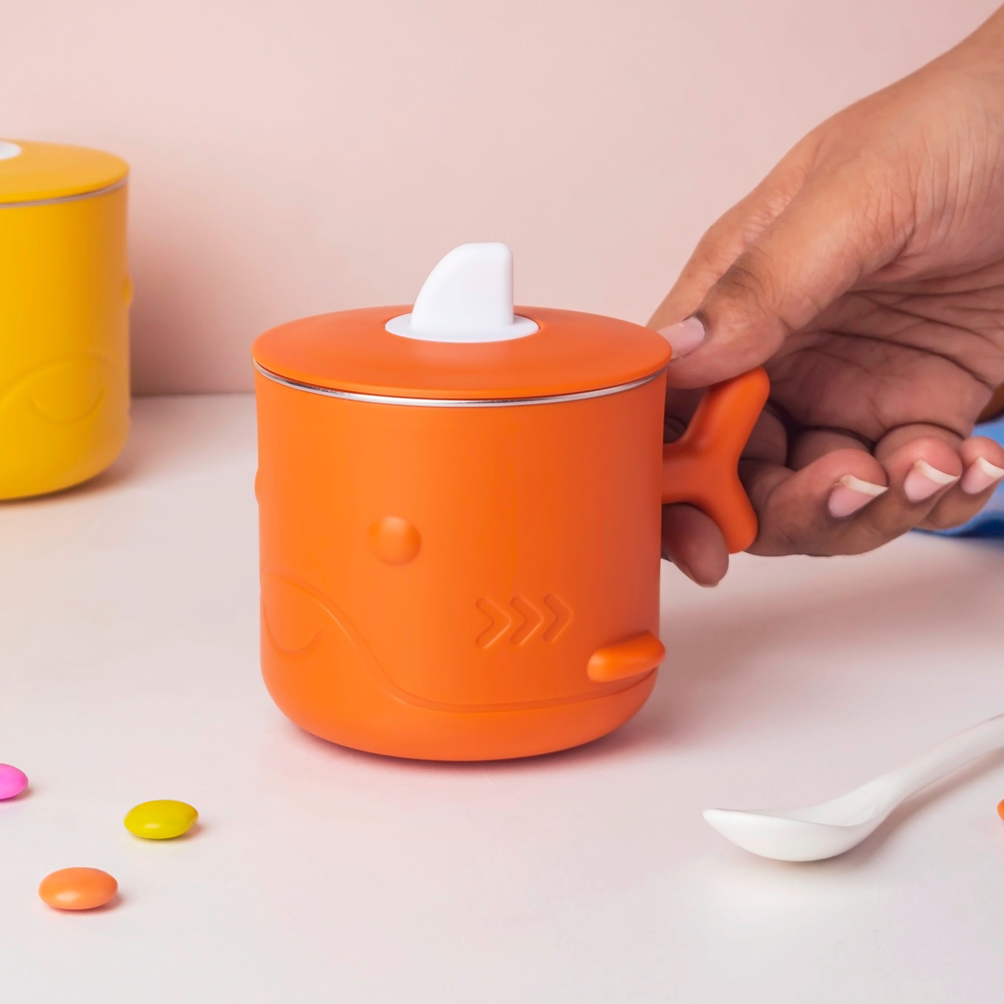 Feeding toddlers and little kids can be a real task at times. But worry not! The orange stainless steel cup with a lid not only looks striking but is a great utilitarian object. From baby food to warm milk- the cup is just the perfect one to serve an array of meals and beverages to the munchkin. Crafted in 304 food-grade stainless steel, the orange cup with a handle and a contrasting white knob is the best serve ware for serving porridge, cereals, or boiled veggies.