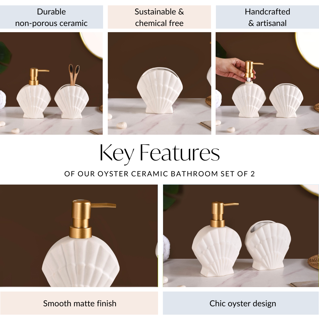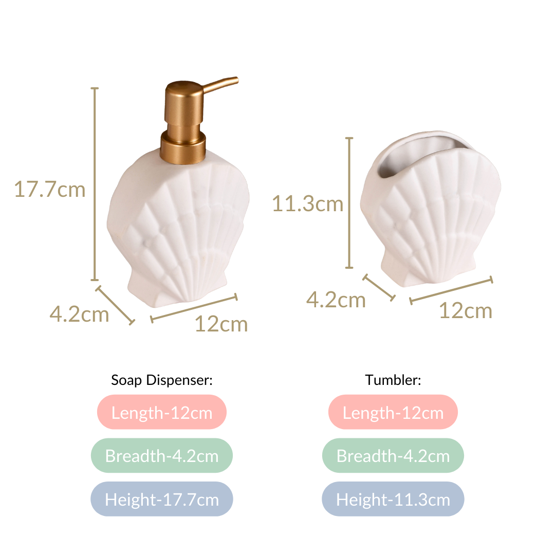 If you have been waiting to bring a touch of coastal chicness to your bathroom aesthetic, well, then we're here with some exciting news. A harmonious blend of timeless elegance and seaside charm, this bath set has been crafted from high-quality, sustainable non-porous ceramic, ensuring durability and reflecting our commitment to offering homes quality, eco-conscious products. The set includes a refillable soap dispenser with a pumpable nozzle that easily dispenses soap in a controlled manner, along with a versatile tumbler to hold toothbrushes or bathroom accessories. The smooth matte finish adds a touch of sophistication to your bathroom decor, while the chic oyster design, reminiscent of leisurely walks along the shore, brings the tranquillity of the sea to your bathroom. Now that you know everything about this exquisite set, what are you waiting for? Get shopping to turn your bathroom into a blissful seaside escape.
