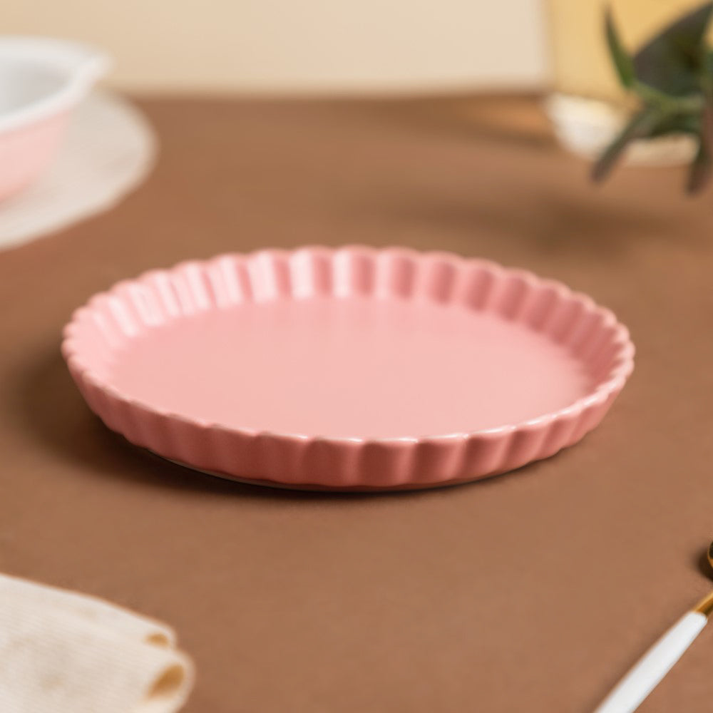 The subtle pink dish with fluted edges adds a vintage feel to the tablescape. The tart dish can be used as bakeware for various cuisines. Available in three variant shades of white, blue, and pink- this ceramic tart dish is a brilliant addition to one's crockery collection.