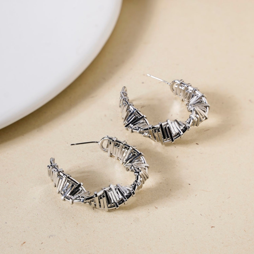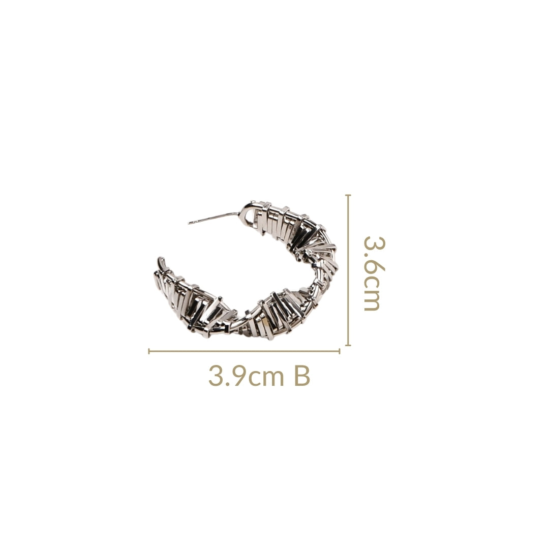 Timeless elegance meets modern artistry in these J hoop earrings. Inspired by the beauty of balance and asymmetry, these earrings distort the structural anatomy of minimalist design, transforming rigidity into fluid sophistication. The silver-toned silhouette mimics the stacked rhythm of uniform elements, subtly twisted to create depth and movement. Bold yet refined, they offer a contemporary take on classic form.