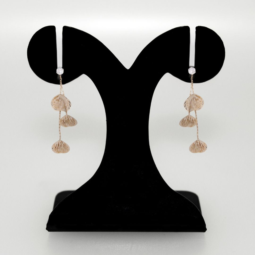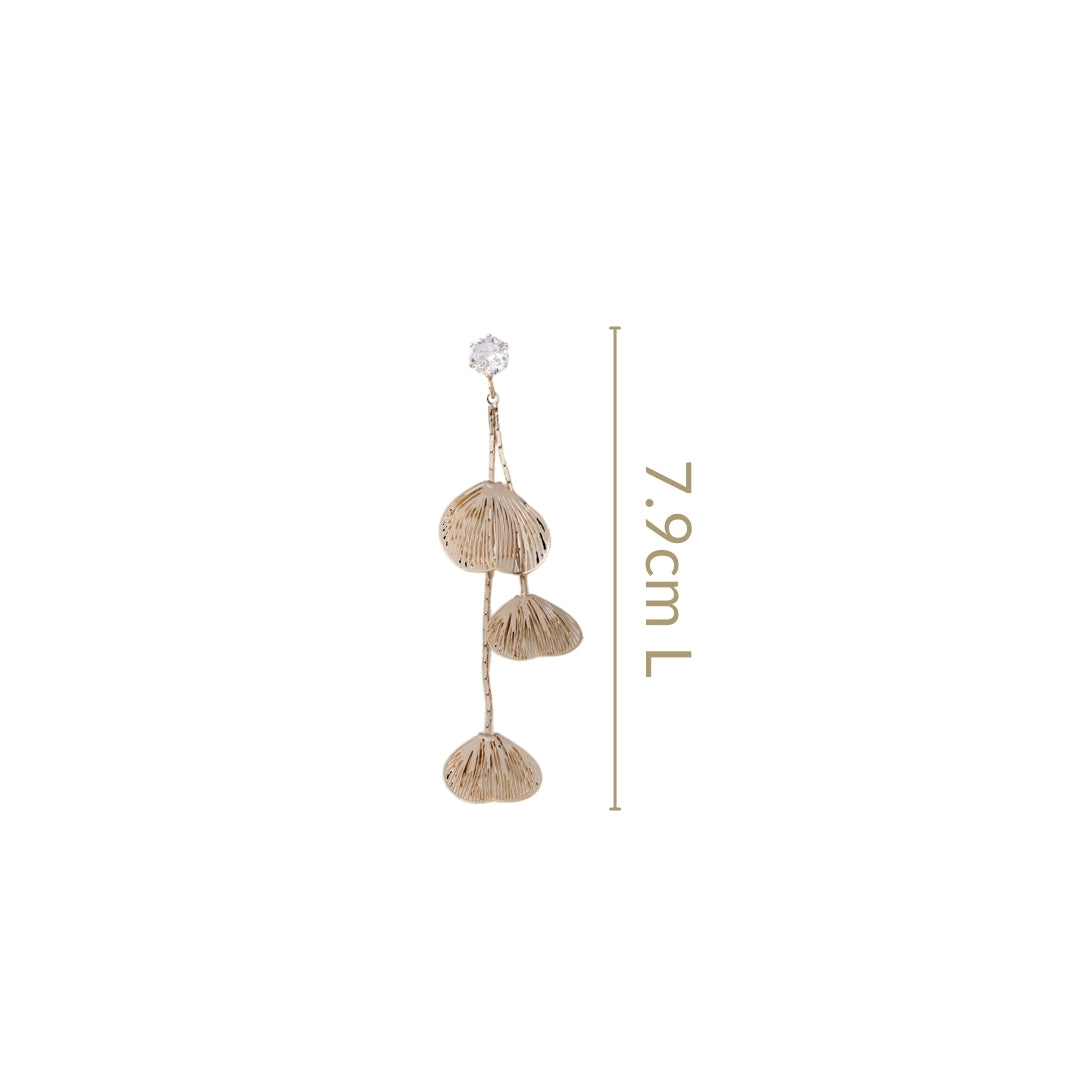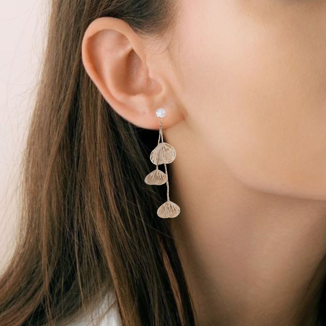 Elegance meets ethereal beauty in these dainty gold earrings. At the top, an iridescent stone catches the light with a soft glow, complemented by delicate golden metallic threads cascading below. One short and one long thread dangle gracefully, each adorned with tiny metallic leaf-like structures that add a touch of nature-inspired charm.
