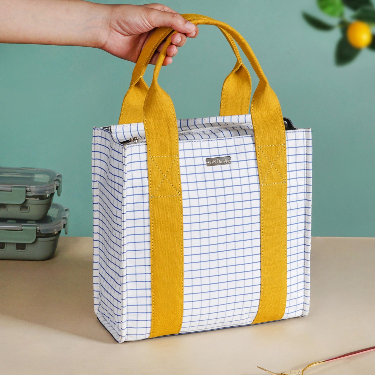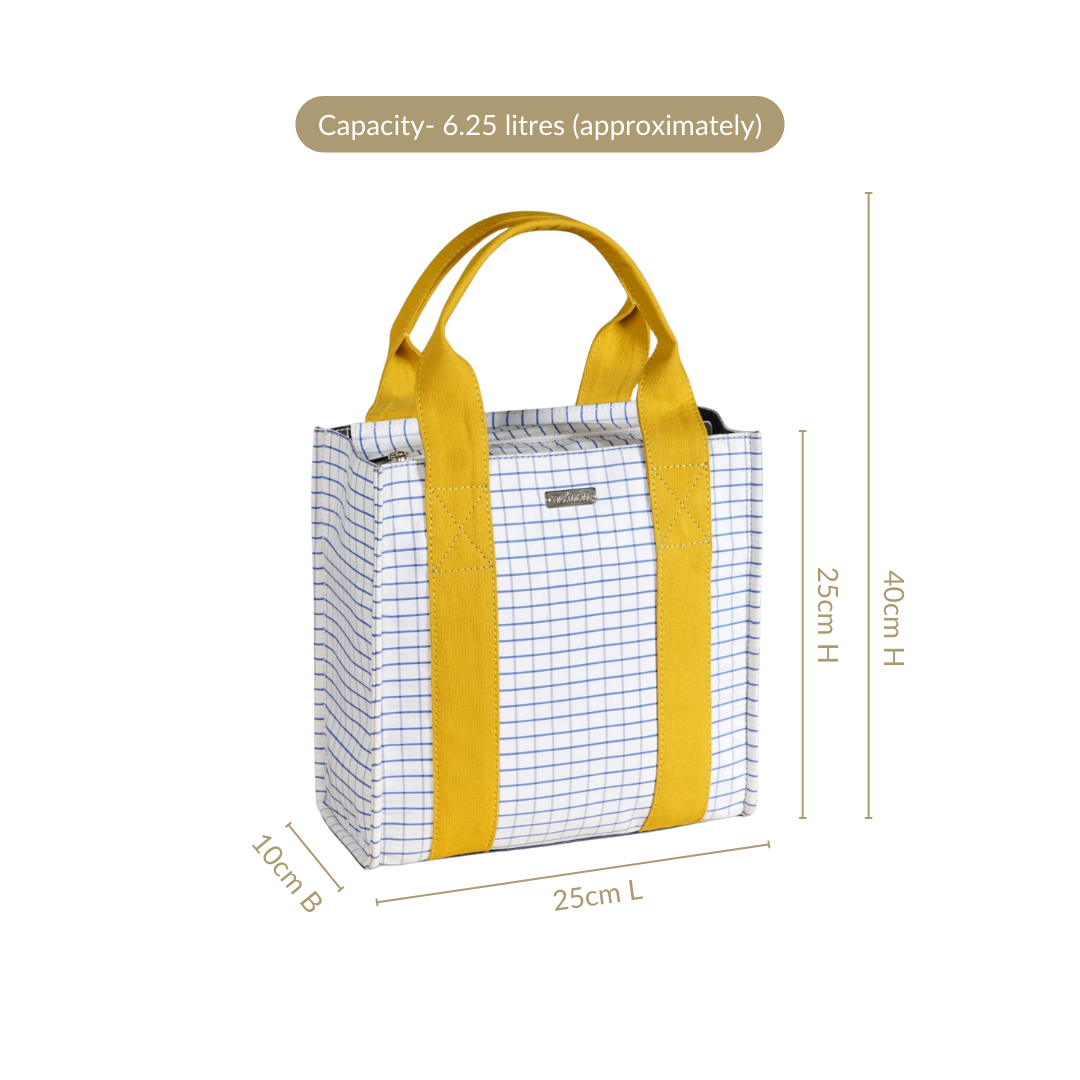 Design: This rectangular lunch bag features a vibrant design with blue checks against a crisp white background, complemented by sturdy mustard yellow canvas handles and matching accent patches. The bag's smooth opening reveals a spacious interior, complete with an inner mesh pocket to neatly organise your cutlery. For added convenience, a small outer pocket at the back provides easy access to essentials like napkins or small snacks.