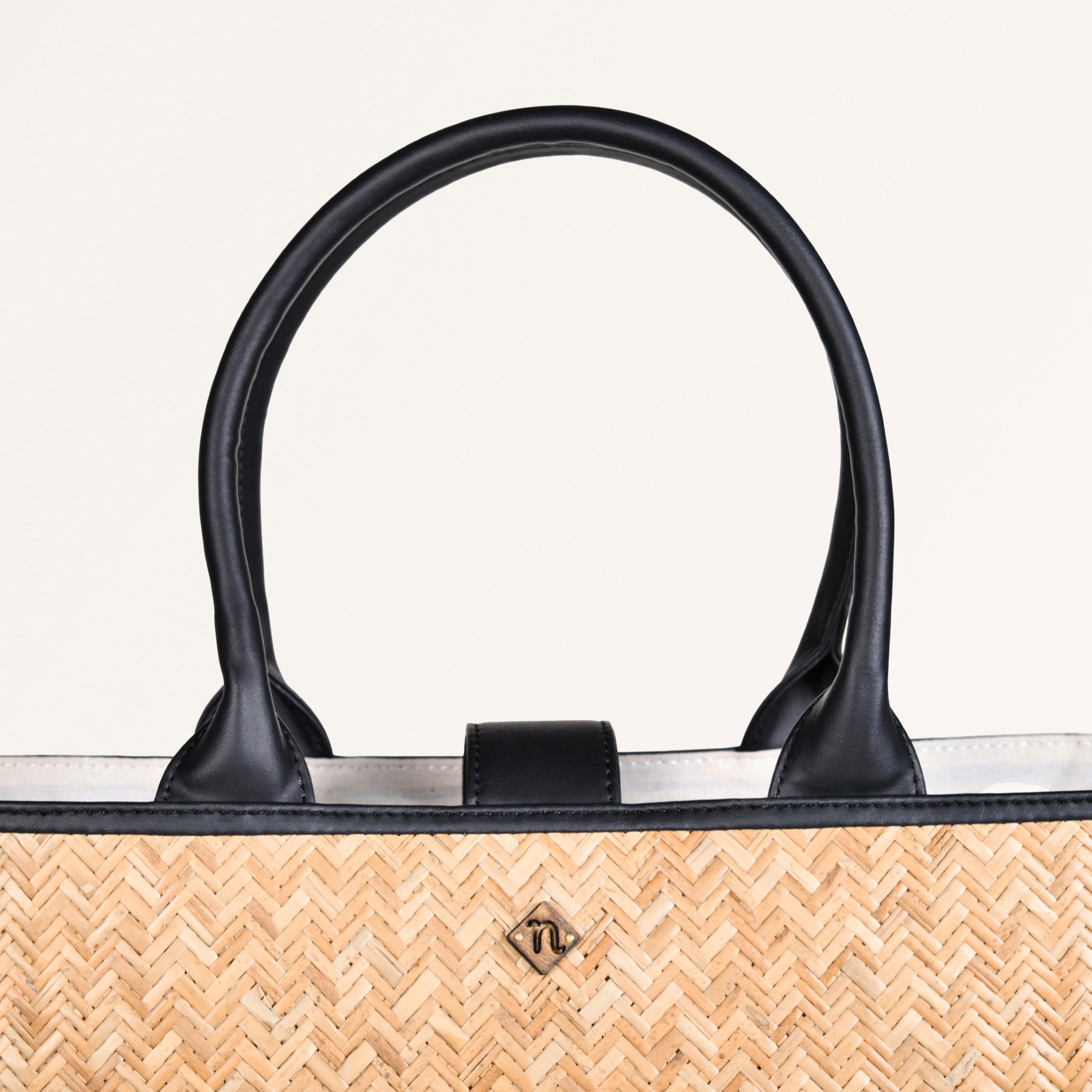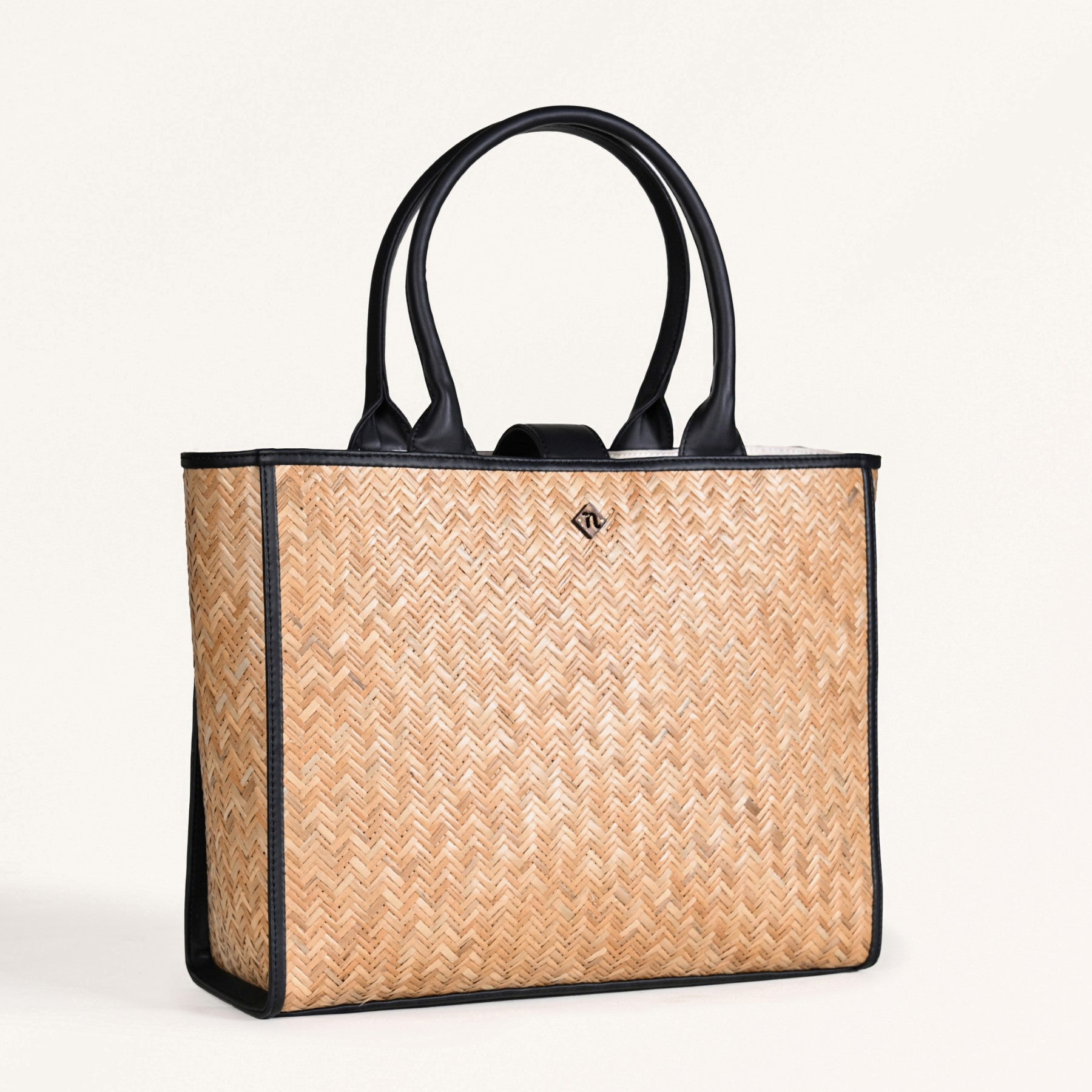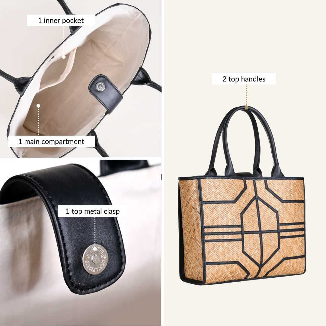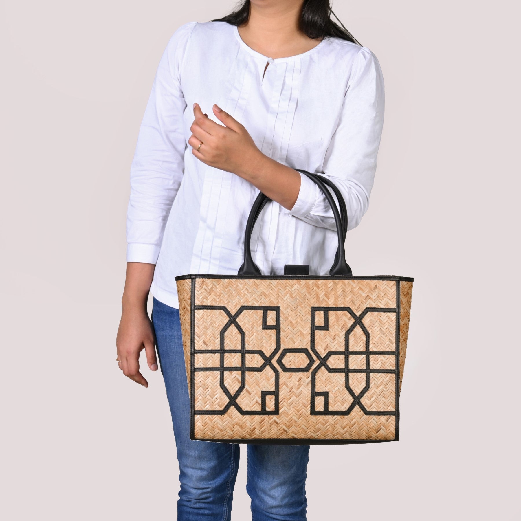 Design: This bag is woven from murta (patipata) by artisans, it's naturally breathable and beautiful. Its foundation is a rich, warm brown, providing an authentic, earthy backdrop. Overlaid onto this, bold black vegan leather trims forge an arresting geometric pattern, creating a captivating architectural framework of lines across the surface. This powerful interplay of organic texture and sharp, modern lines defines the bag's unique aesthetic. Complementing this dramatic design, the twin top handles are crafted from sleek black PU leather, offering a cohesive and undeniably chic appeal.