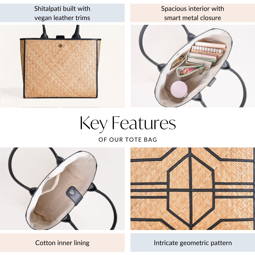 Old craft, new mood. Handwoven by skilled artisans, this Shitalpati tote ("Shital" meaning cool, "Pati" meaning mat) blends heritage with modern flair, your everyday statement-maker with a story.