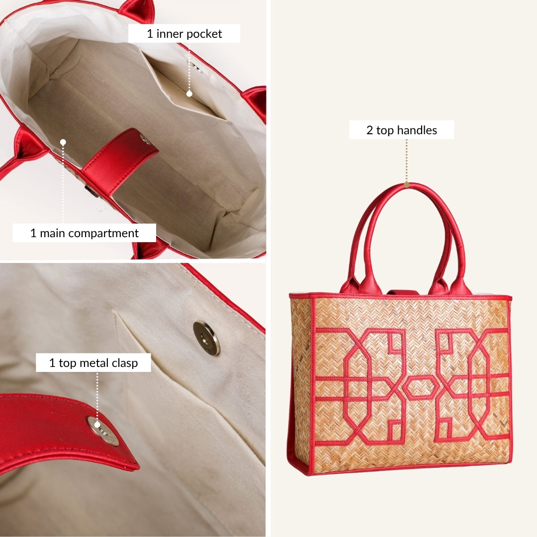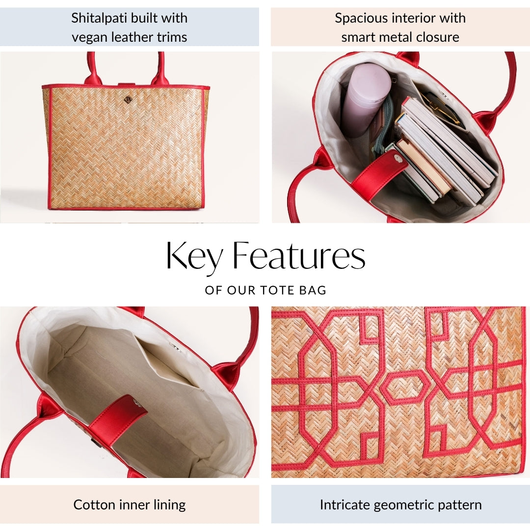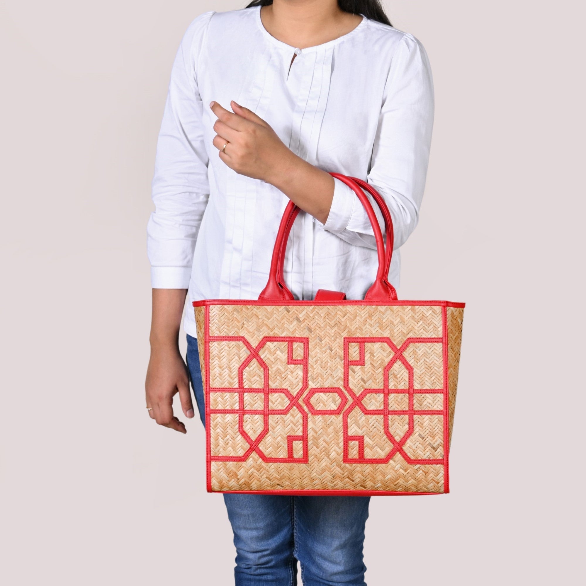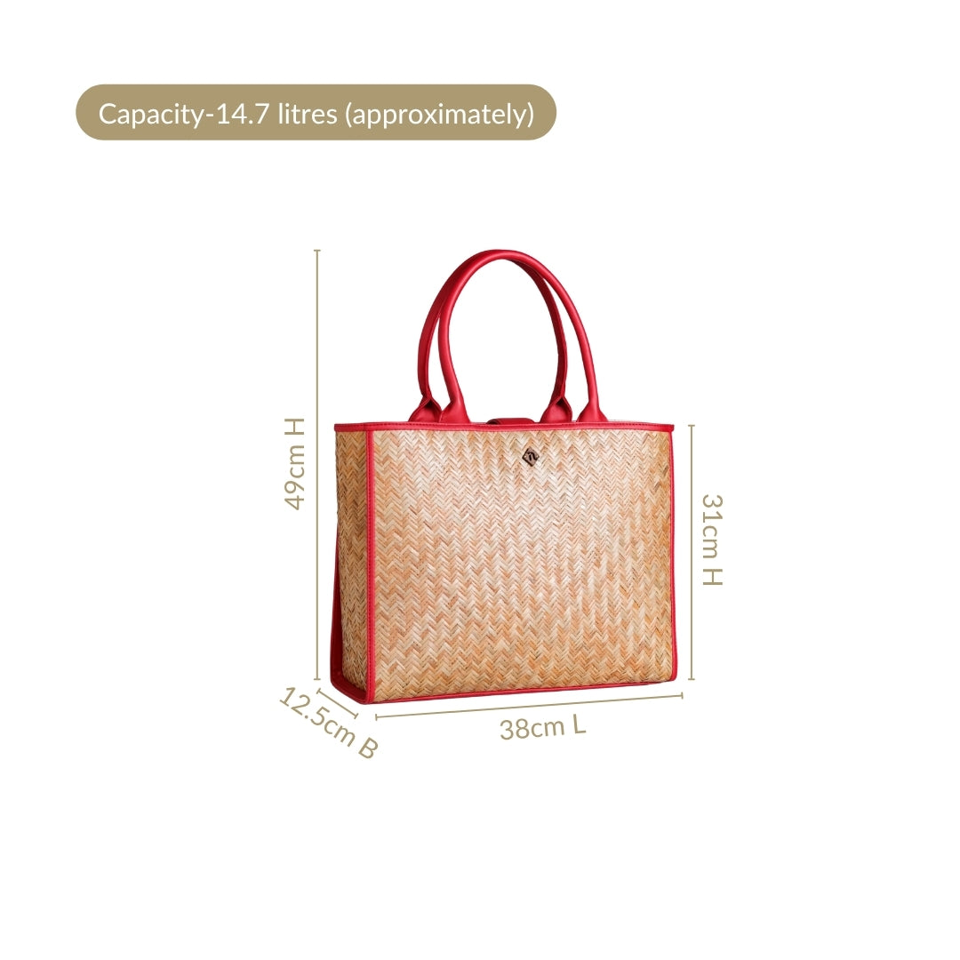 Design: This beautiful bag is made from murta (or patipata) and handwoven using smooth, thin strips by skilled artisans. Upon this canvas, striking red vegan leather trims orchestrate an elaborate geometric design, forming an intricate line pattern across the body. These dynamic lines not only define sophisticated shapes but also imbue the bag with undeniable character. This powerful fusion of traditional weaving and vibrant contemporary hues creates a compelling narrative. The aesthetic is completed by twin top handles crafted from matching red PU leather, ensuring a cohesive and undeniably captivating presence.