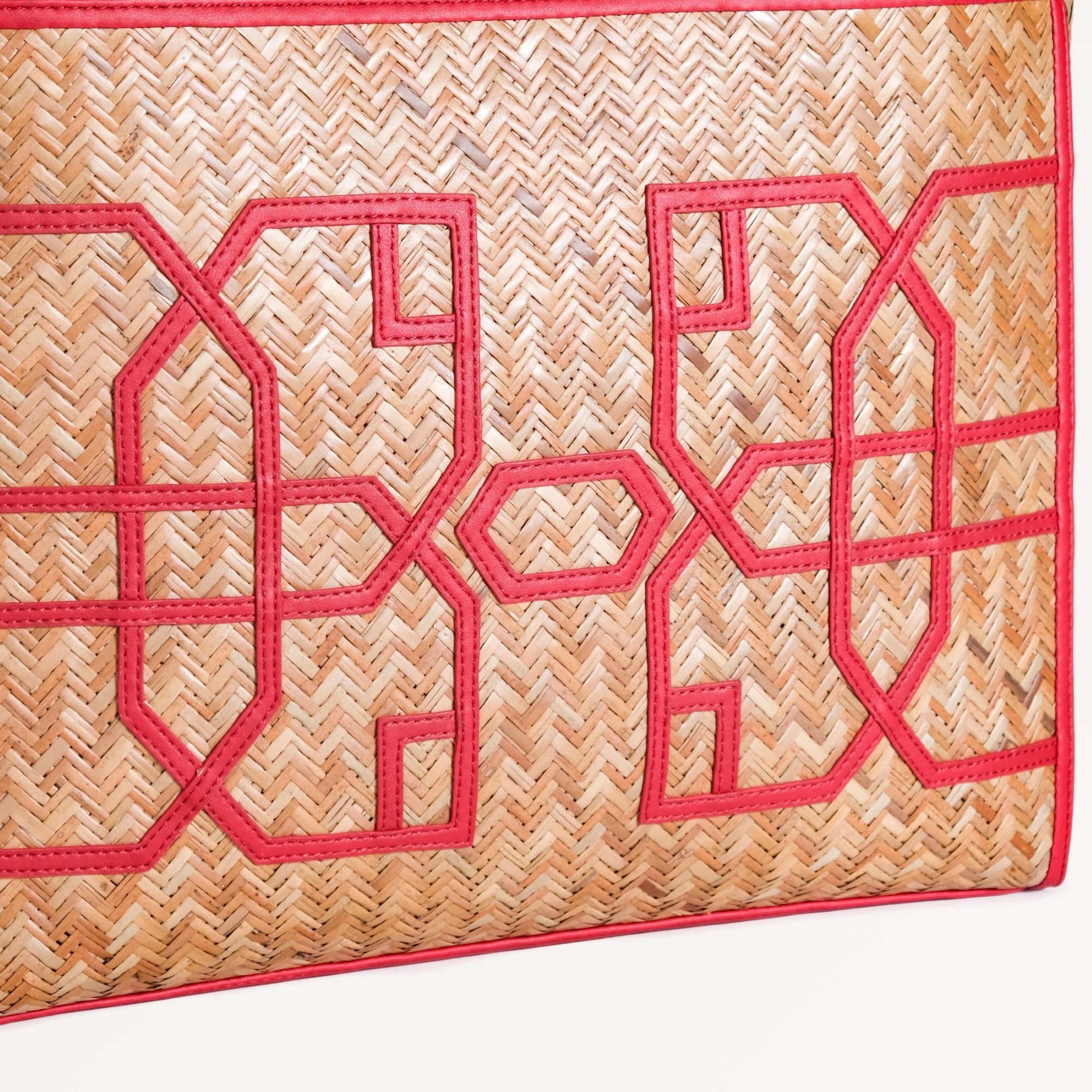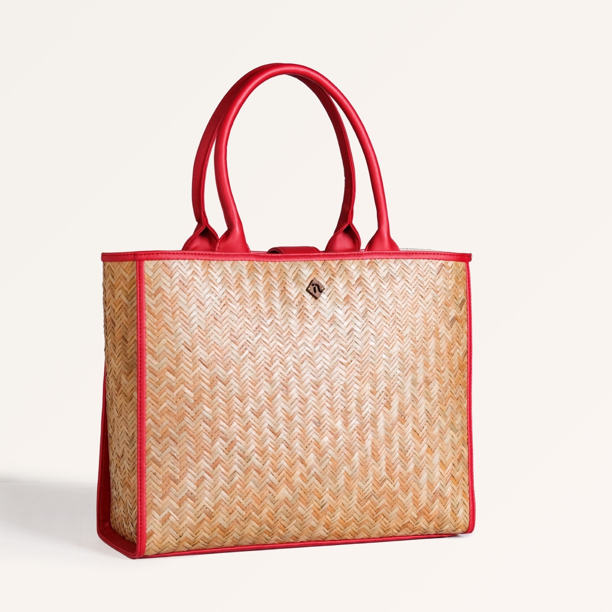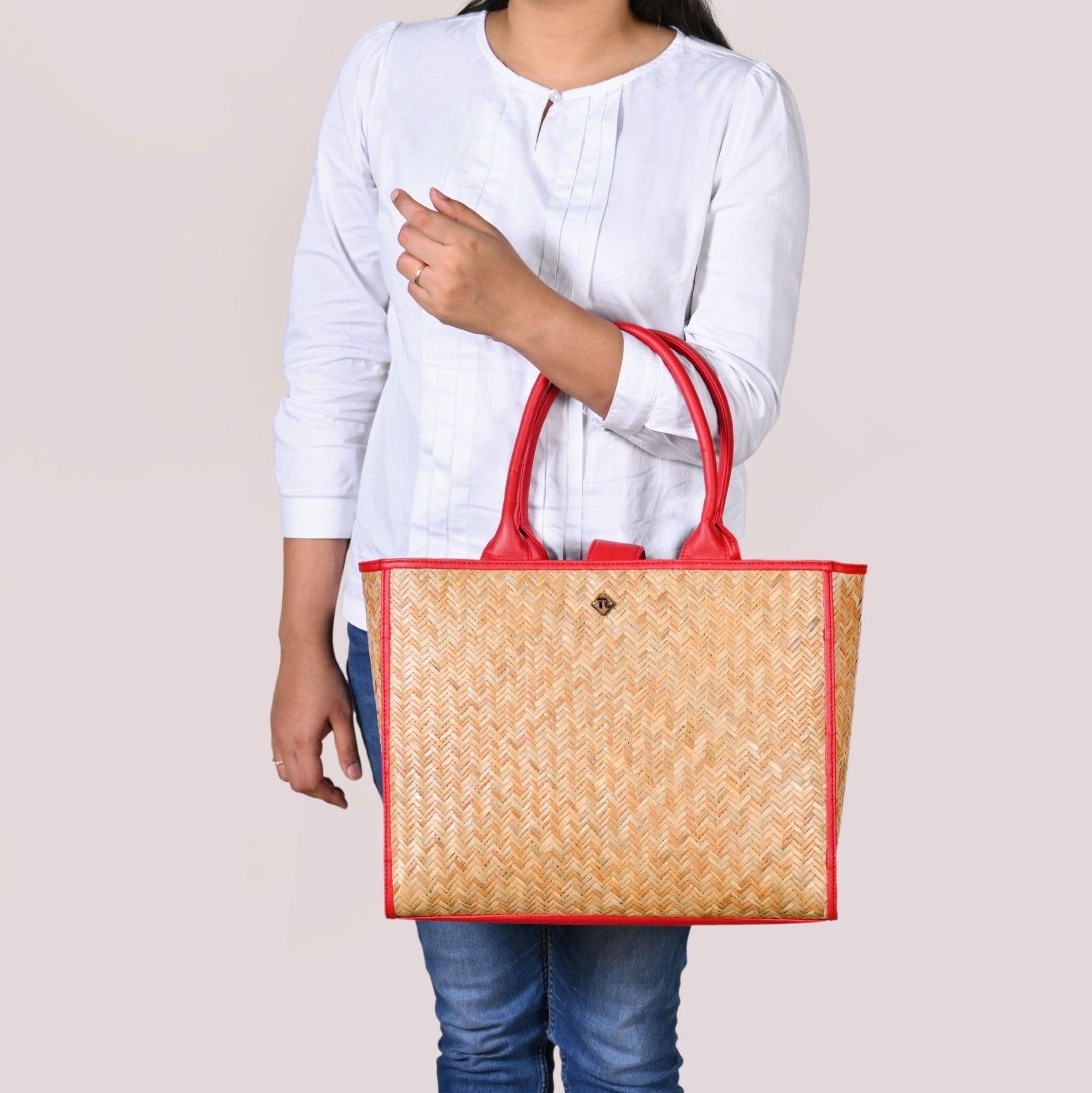 Design: This beautiful bag is made from murta (or patipata) and handwoven using smooth, thin strips by skilled artisans. Upon this canvas, striking red vegan leather trims orchestrate an elaborate geometric design, forming an intricate line pattern across the body. These dynamic lines not only define sophisticated shapes but also imbue the bag with undeniable character. This powerful fusion of traditional weaving and vibrant contemporary hues creates a compelling narrative. The aesthetic is completed by twin top handles crafted from matching red PU leather, ensuring a cohesive and undeniably captivating presence.