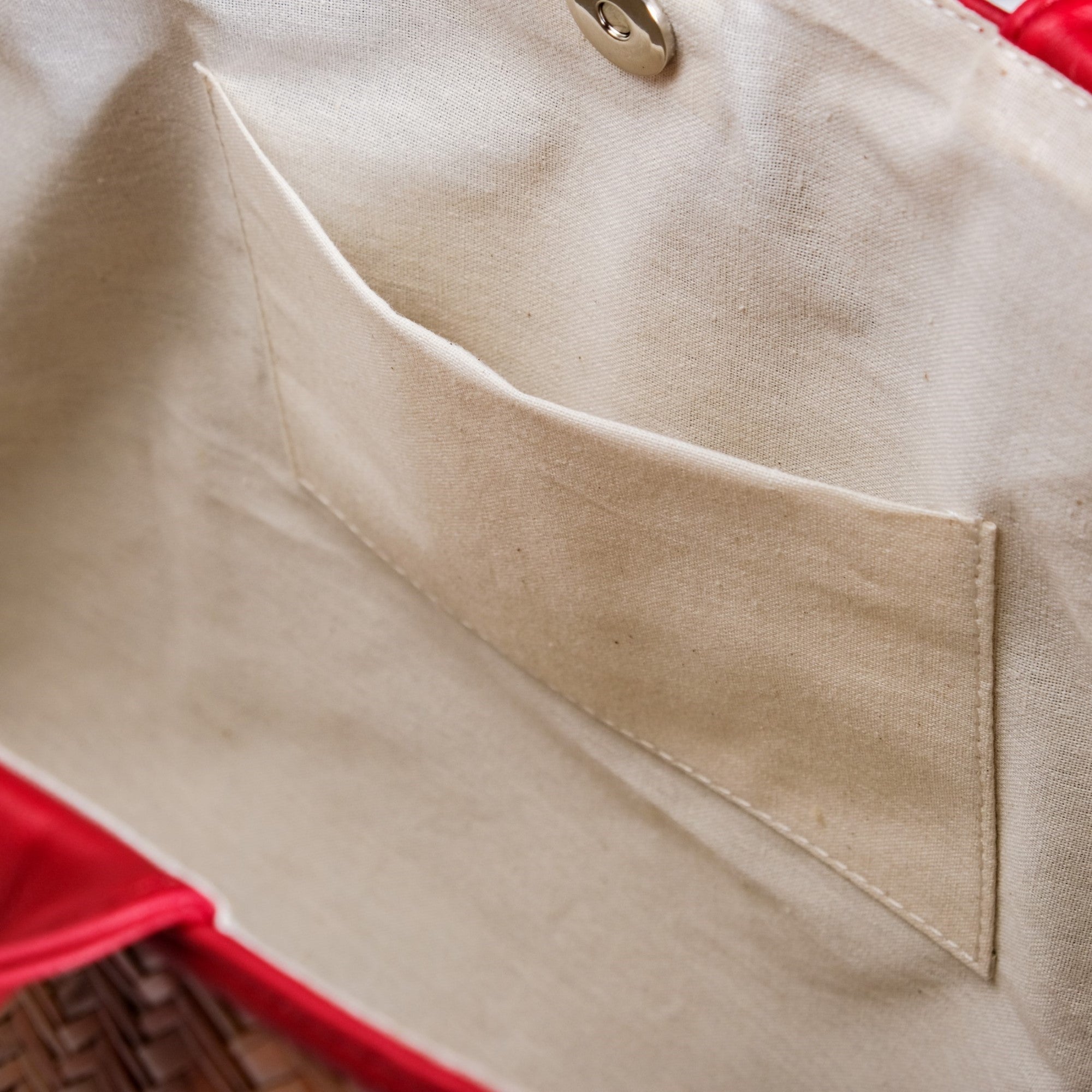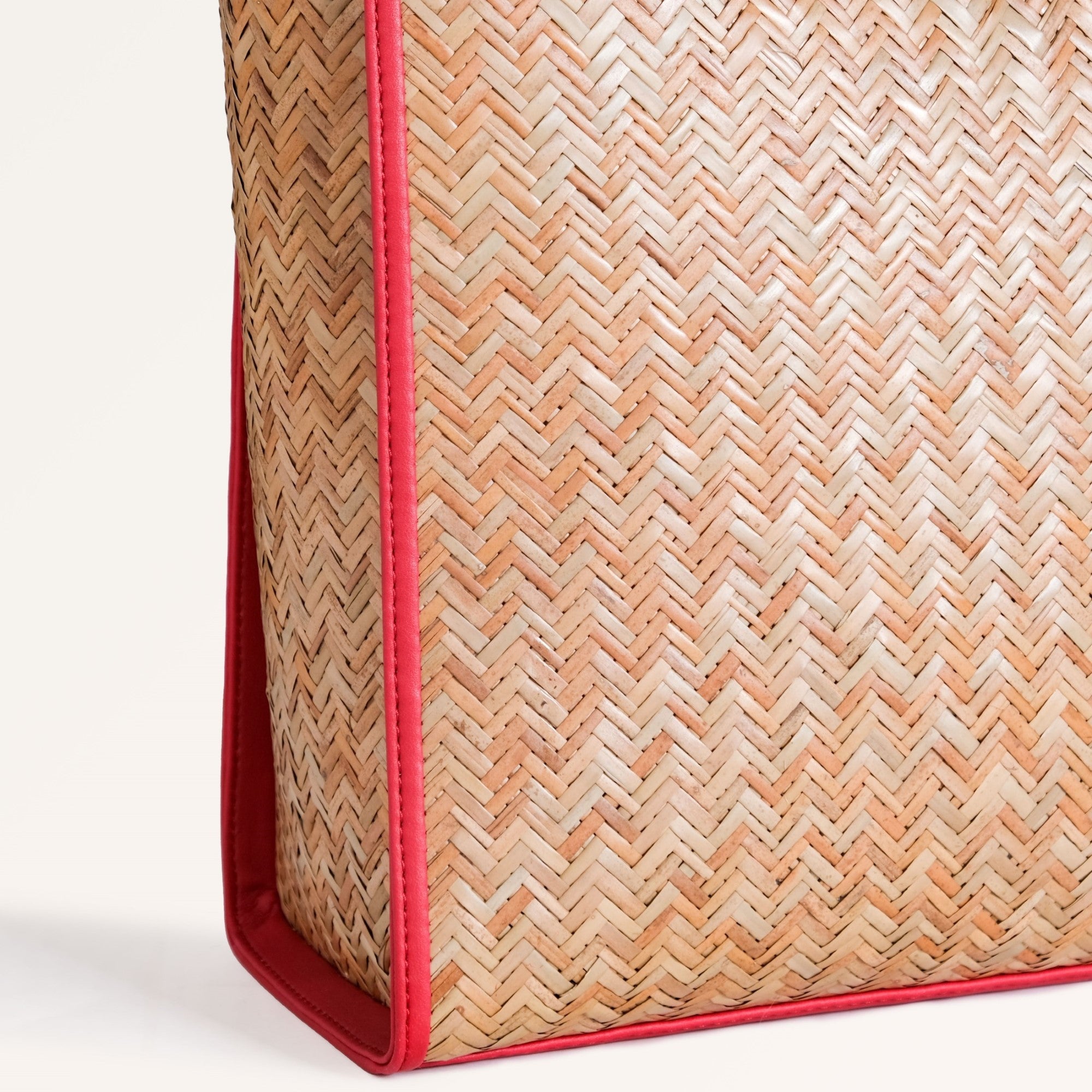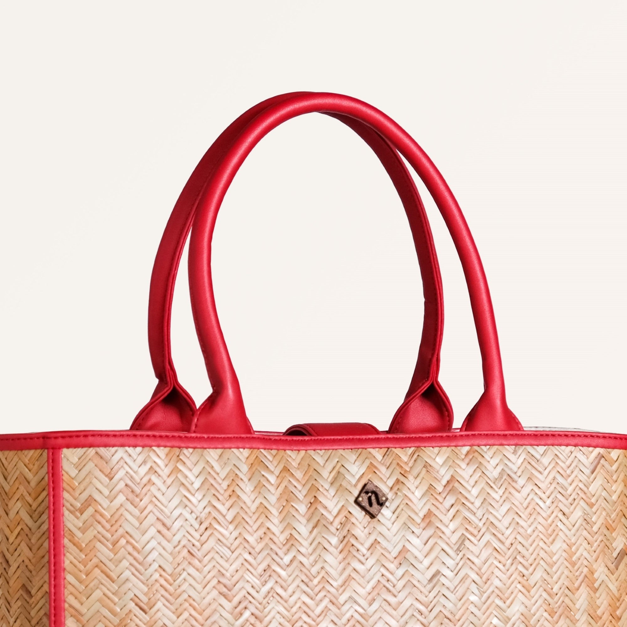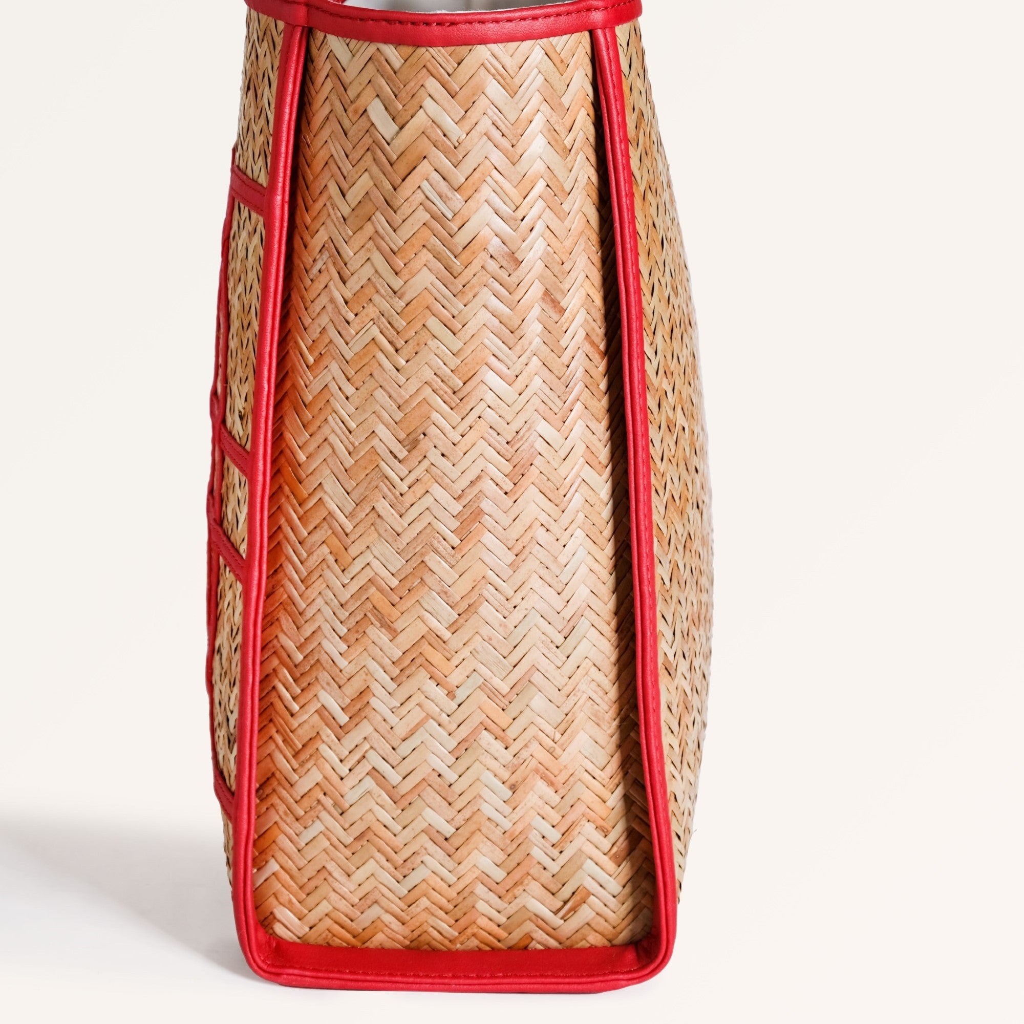 Design: This beautiful bag is made from murta (or patipata) and handwoven using smooth, thin strips by skilled artisans. Upon this canvas, striking red vegan leather trims orchestrate an elaborate geometric design, forming an intricate line pattern across the body. These dynamic lines not only define sophisticated shapes but also imbue the bag with undeniable character. This powerful fusion of traditional weaving and vibrant contemporary hues creates a compelling narrative. The aesthetic is completed by twin top handles crafted from matching red PU leather, ensuring a cohesive and undeniably captivating presence.
