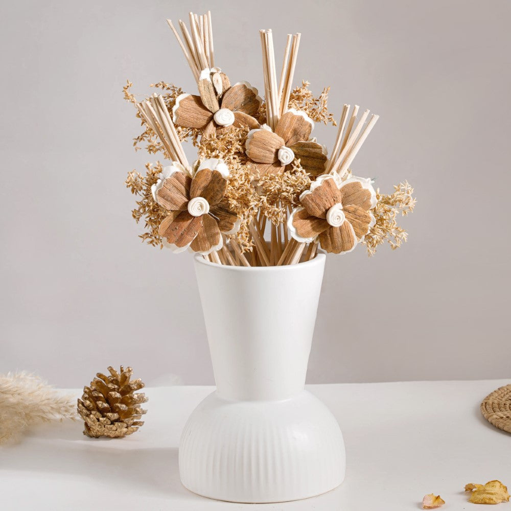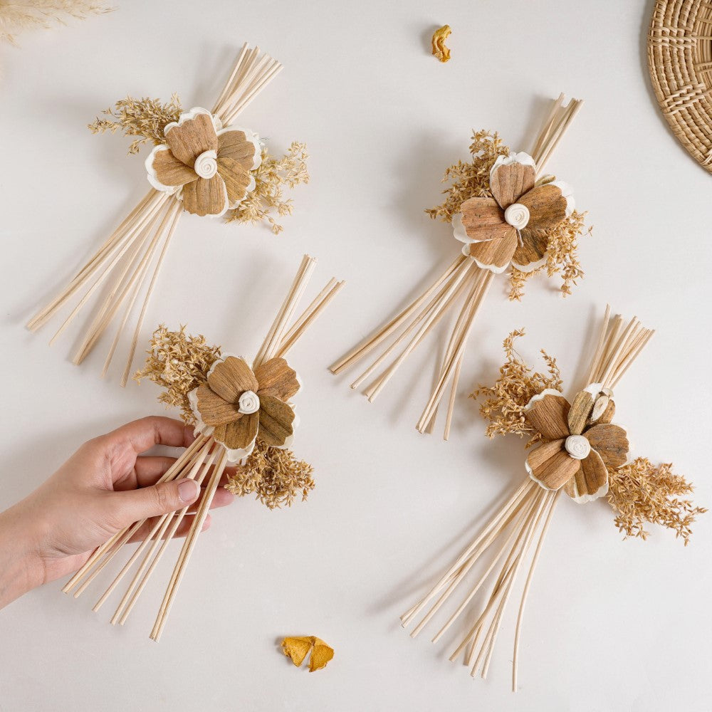 The mini floral bouquet has been handcrafted with dried shola and dried reed sticks. The dried botanicals have been bound together to create an eye-pleasing display. The dried flower bouquet comprises Reed sticks that can be placed in a bottle of essential oil to act as an essential oil diffuser. Our mini floral bouquets are designed to be elegant but the best part is, they are low maintenance. One can simply wipe off the dust with a dusting cloth which requires almost very little or no maintenance. The dried mini flowers are the perfect addition to a hamper. Designed to last several years, dried flowers are a great alternative to fresh flowers.