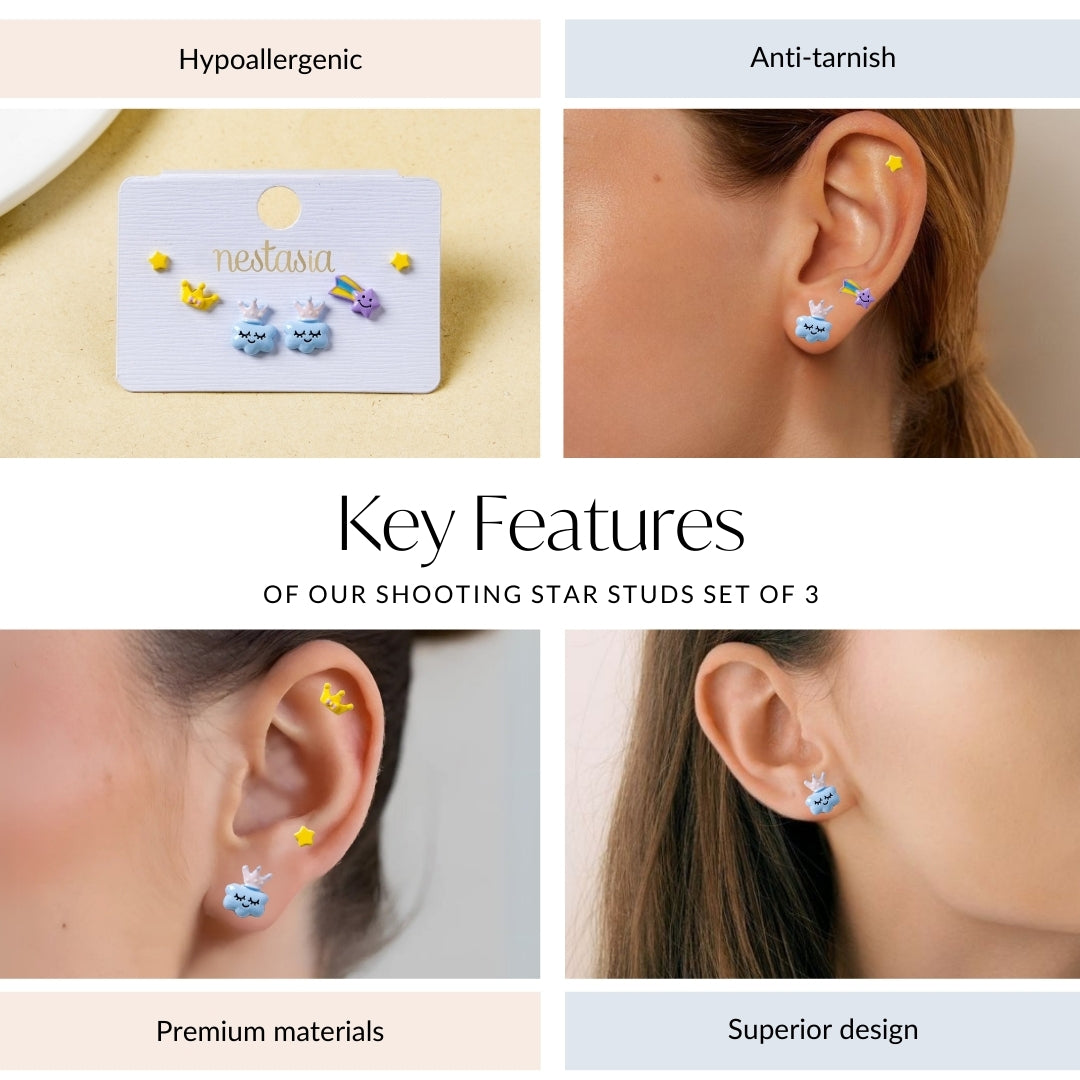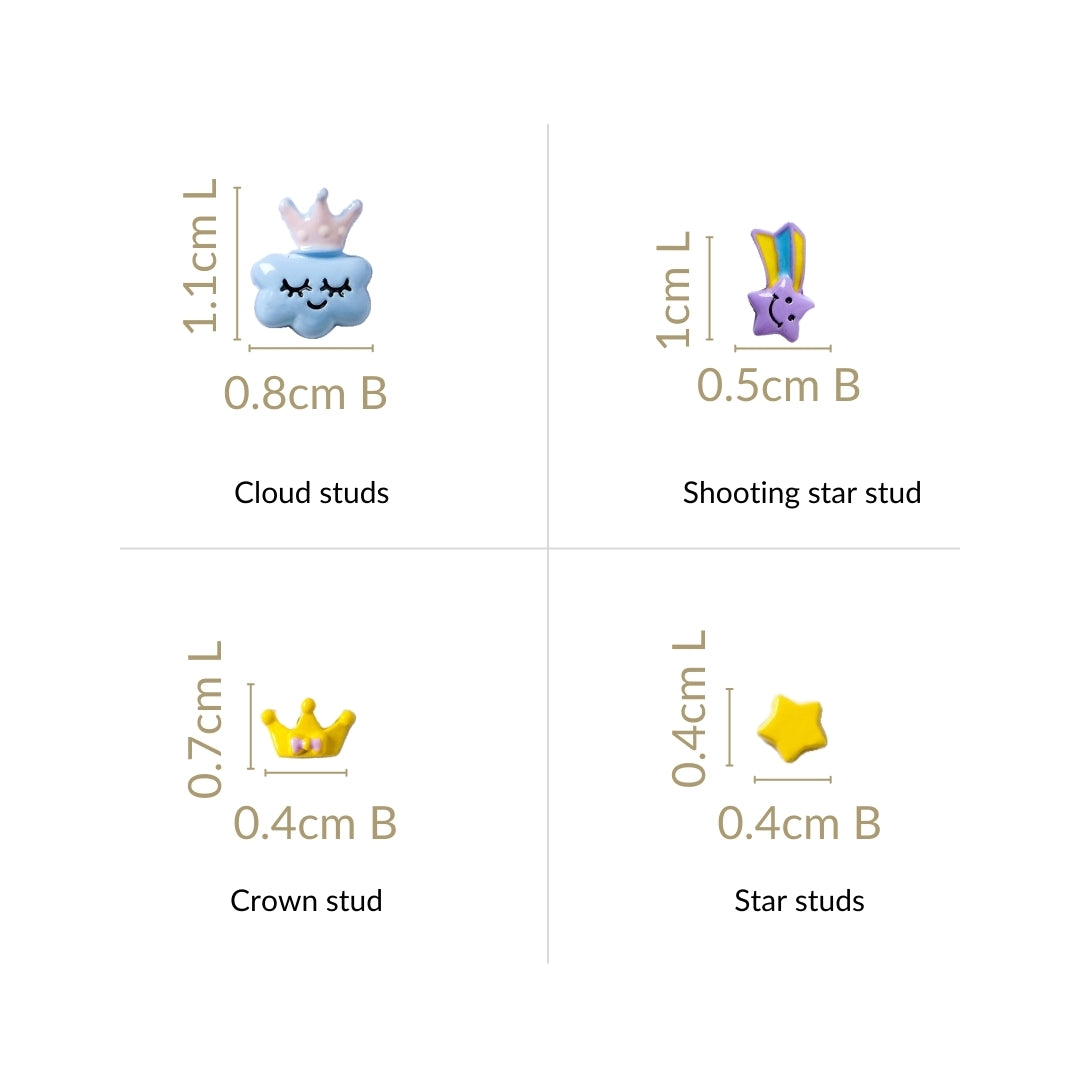A little charm goes a long way, and this set of three stud earrings is proof of that. Inspired by dreamy nights and celestial wonders, each pair tells a tiny story of whimsy and magic. The first set features an adorable sleeping blue cloud with a delicate white crown, radiating sweet serenity. The second pair balances a shooting star and a dainty crown, while the final duo of petite yellow studs adds a touch of subtle sparkle. This set of earrings is perfect for mixing, matching, and embracing your inner starry dreamer.