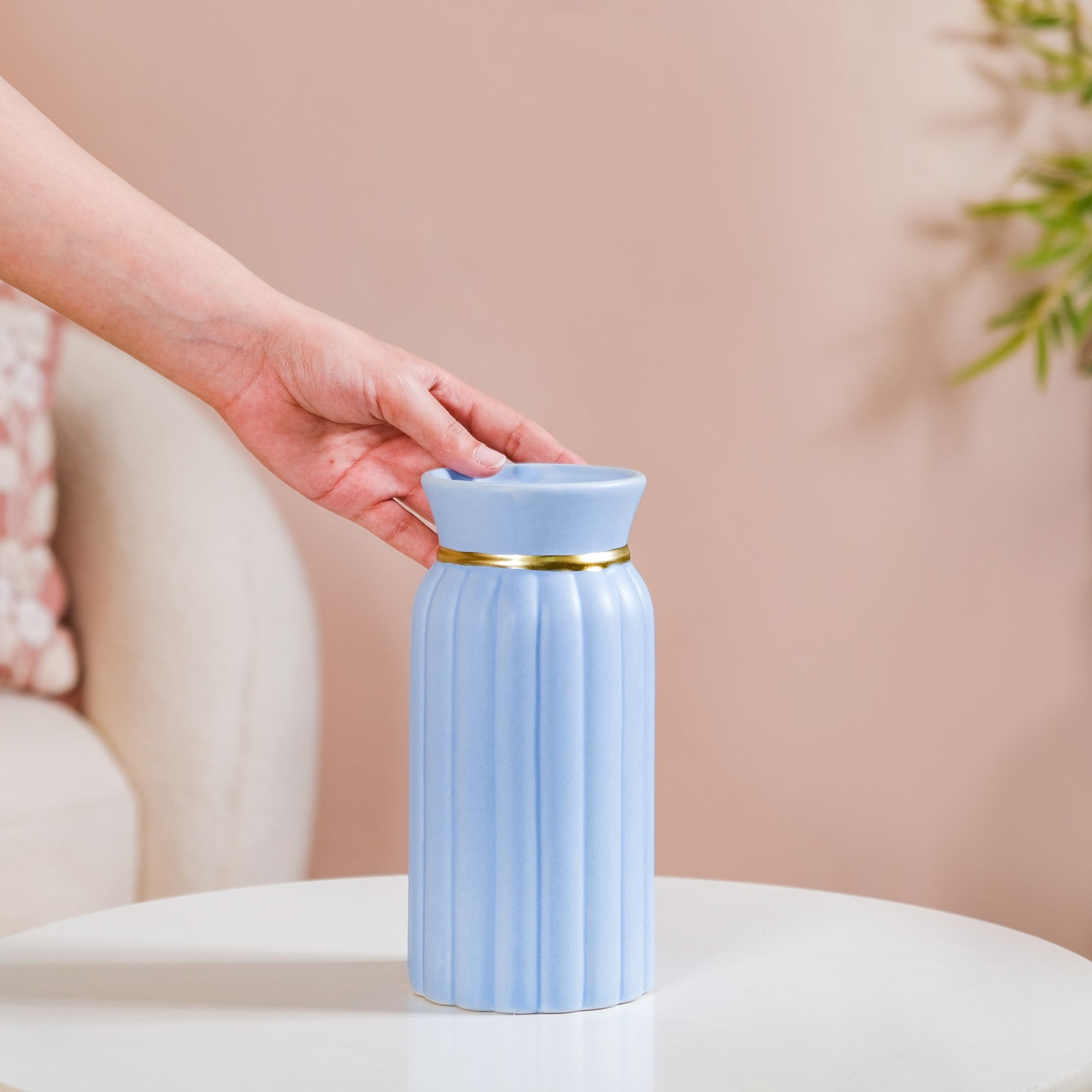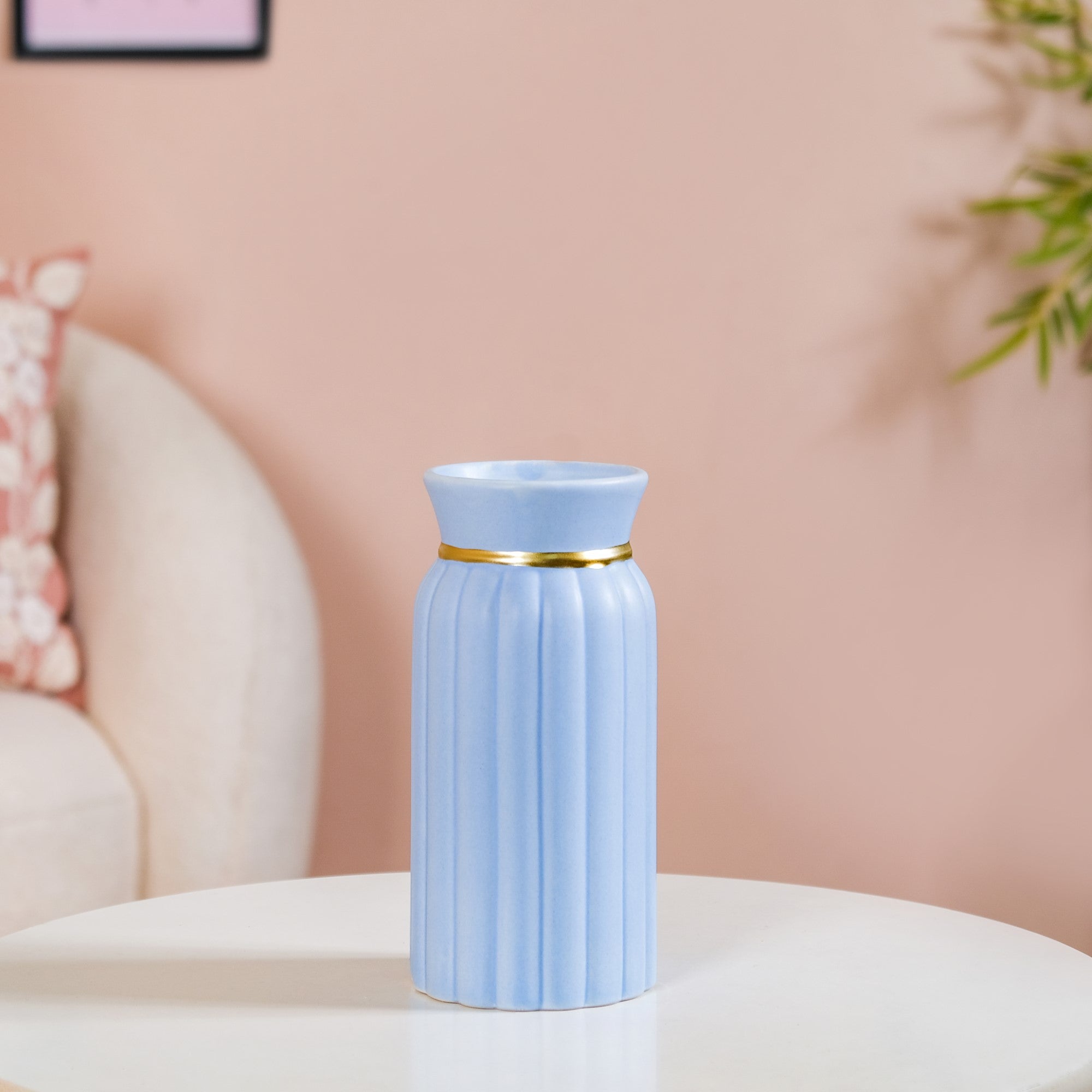 Crafted with precision from premium ceramic material, our short ceramic vase in a subtle blue hue seamlessly blends modern sophistication with practical utility. Featuring a textured exterior and a ring-like golden decoration around its neck, this opulent flower vase enhances the aesthetic of any space.