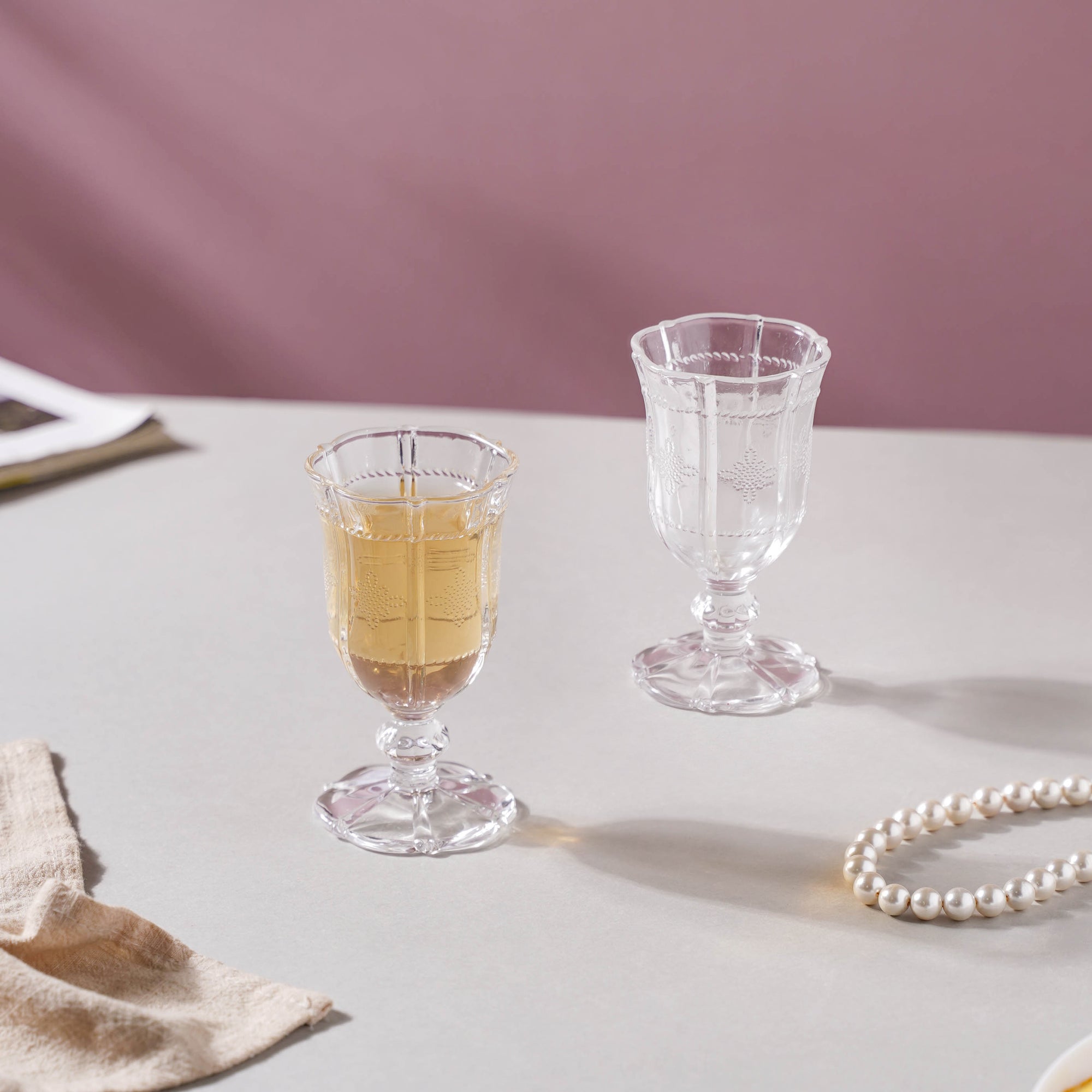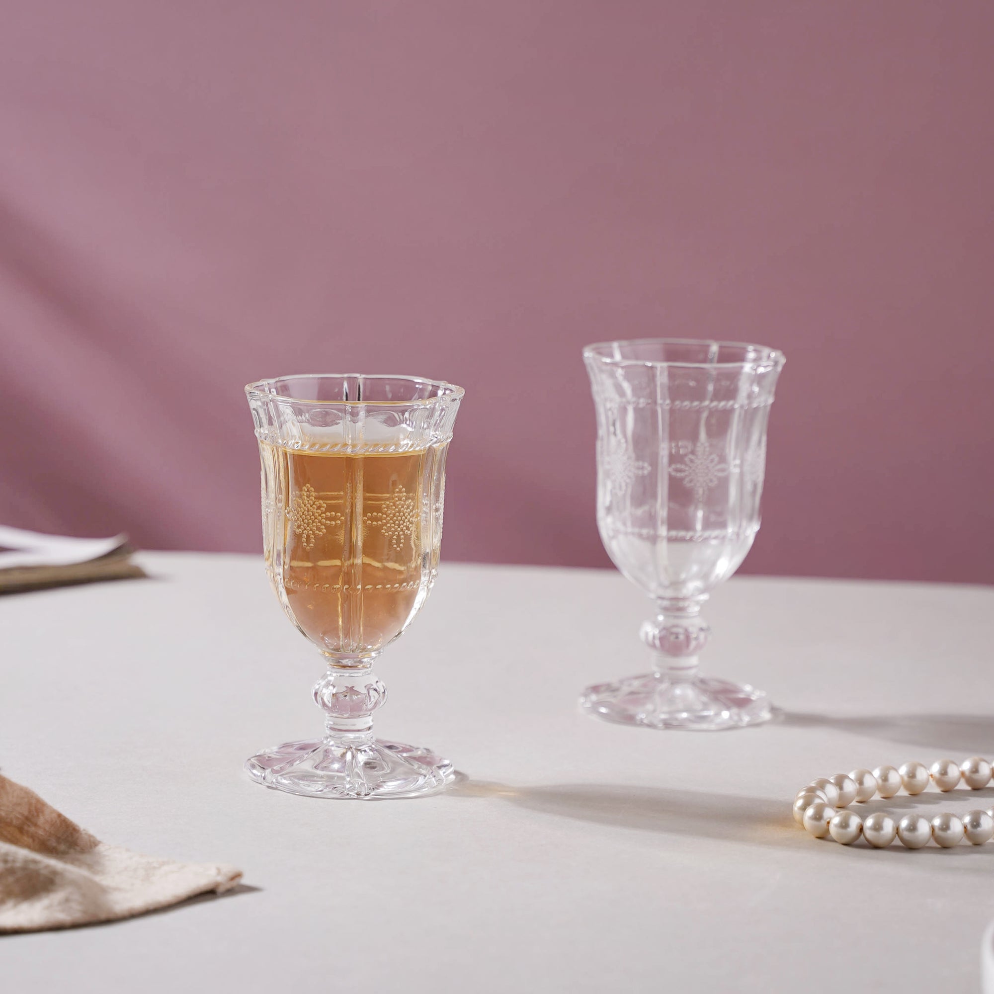 Very beautifully etched dessert wine glasses! Did not disappoint! Dainty Stemmed Dessert Wine Glass Set of 2
