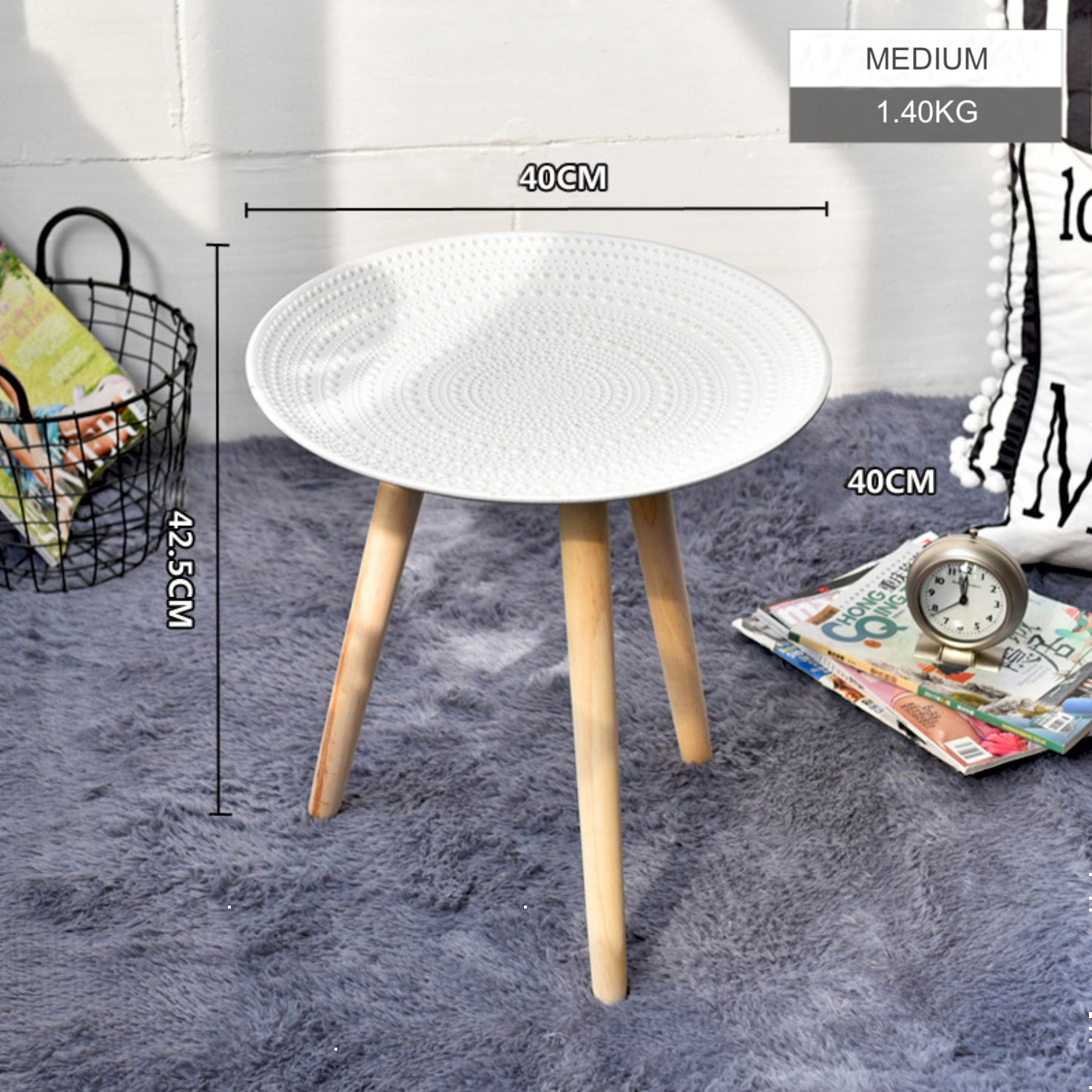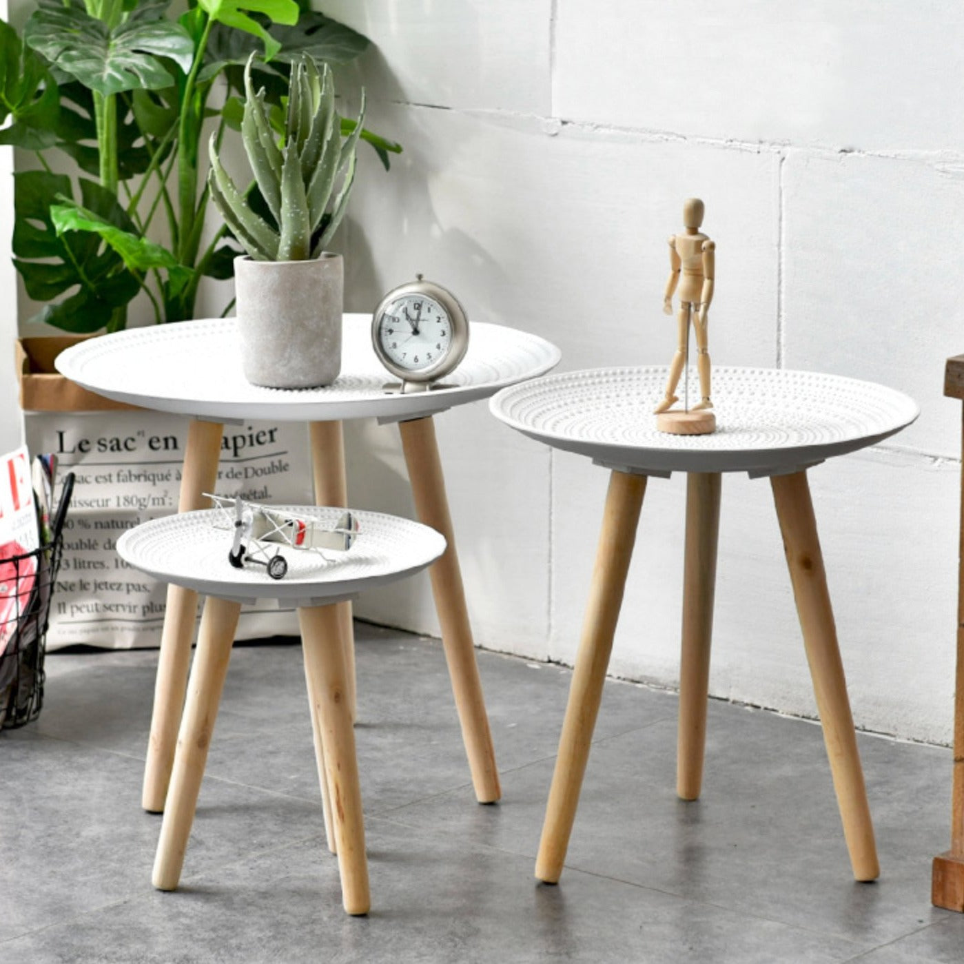 The corner table has a white textured finish that adds a chic vibe to the living room. The medium coffee table can be paired with two more tables to create a set. The light material and easy assembly allow for moving it around the house and easy storage.