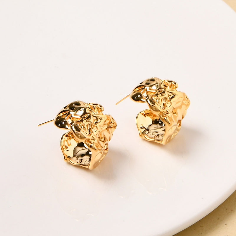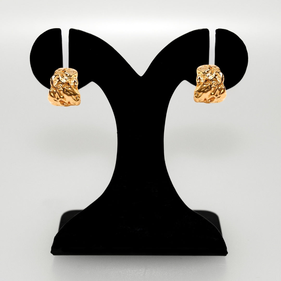 A captivating reflection of nature's raw beauty, these J hoop earrings exude sculptural elegance and an organic charm. Inspired by the rugged textures of stone, the earrings feature a rich gold hue enhanced by a hammered, stone-like surface that adds depth and character. The blend of colour and texture creates an effortlessly luxurious piece that radiates timeless appeal.