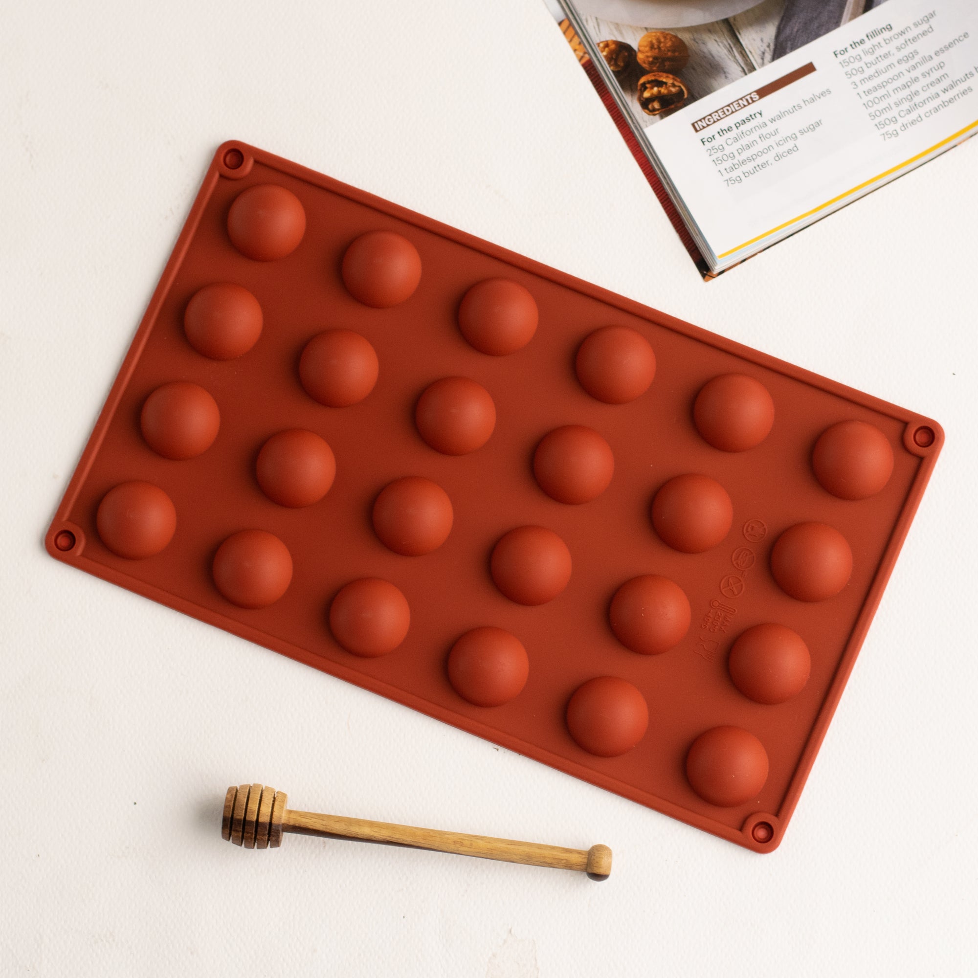 Silicone sphere mould for chocolate, cake decoration and more. Make chocolate balls with the silicone mold by filling molten chocolate ganache, caramel and more. The half sphere silicone mold can make chocolates that look great even as cake toppers or decoration. Make a choco-jelly topping for cupcakes to surprise loved ones with a unique twist in their cupcake or pastry toppings.