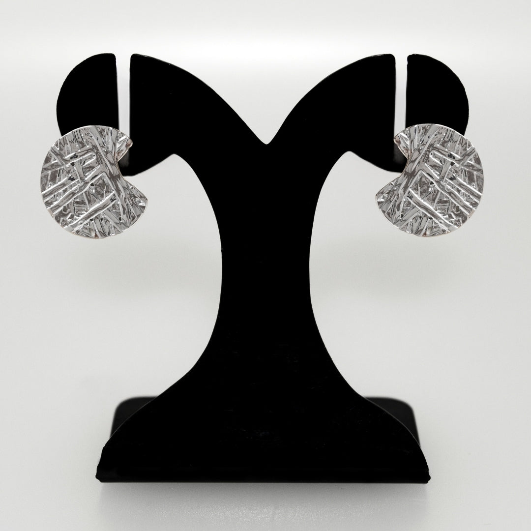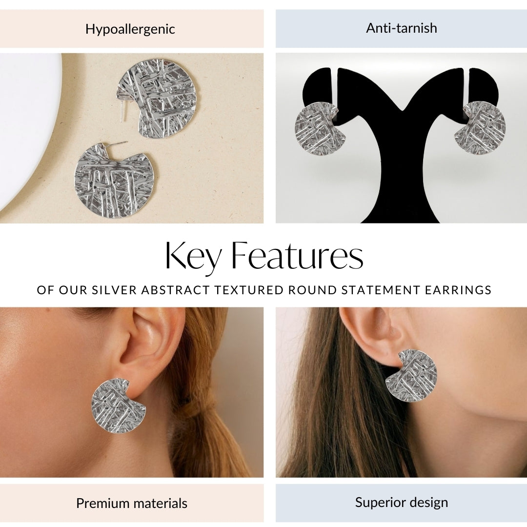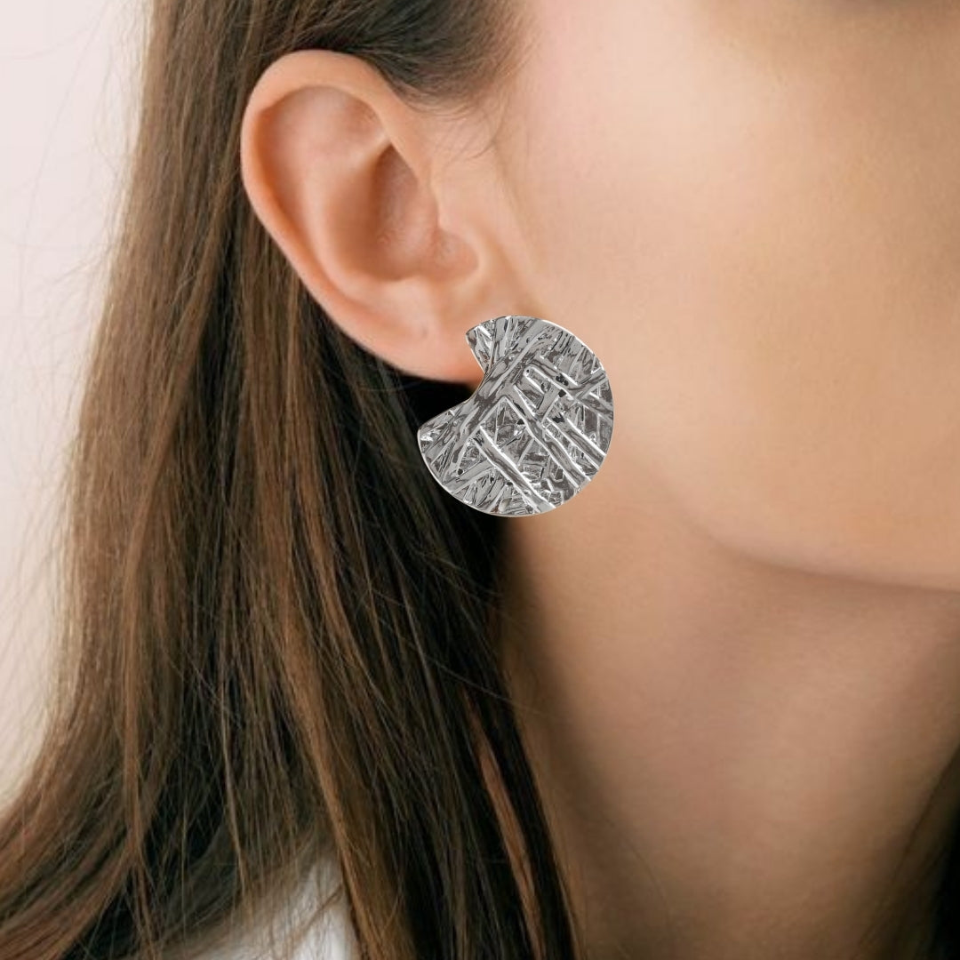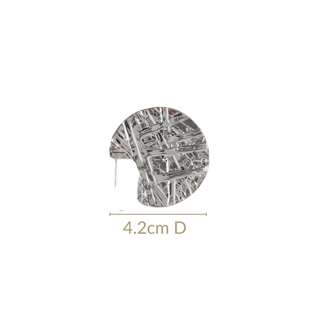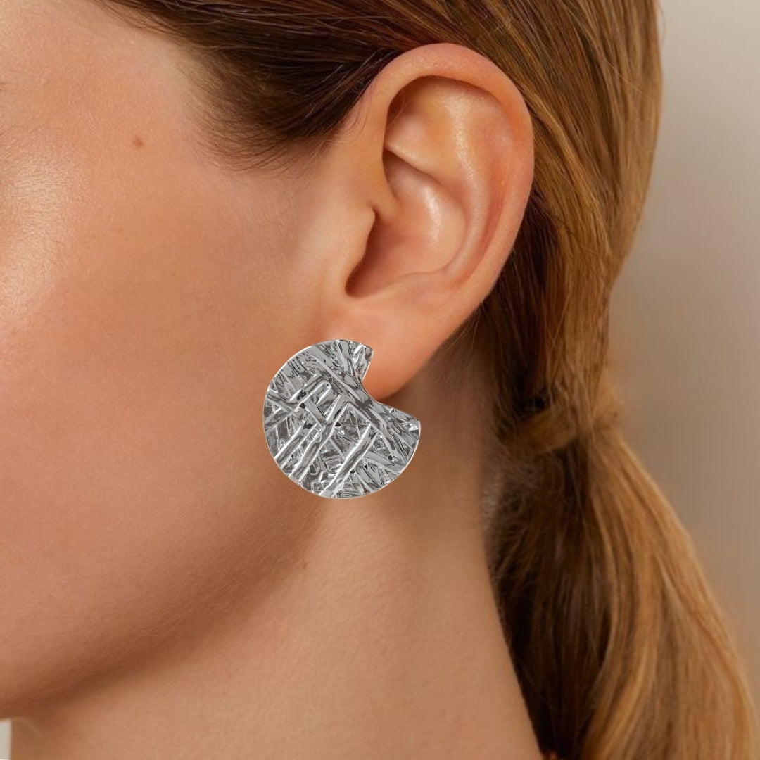 A bold fusion of geometric elegance and modern artistry, this pair of silver-toned metal statement earrings features a striking circular disc shape with an abstract textured mesh design. The intricate mesh pattern evokes a sense of woven threads, symbolising unity and connection, while the sleek metallic finish brings a contemporary edge. Perfect for those who love making a statement, these earrings effortlessly elevate any look - whether casual or formal - by adding a dynamic touch of texture and sophistication to your ensemble.