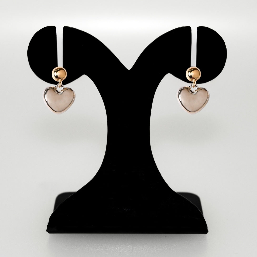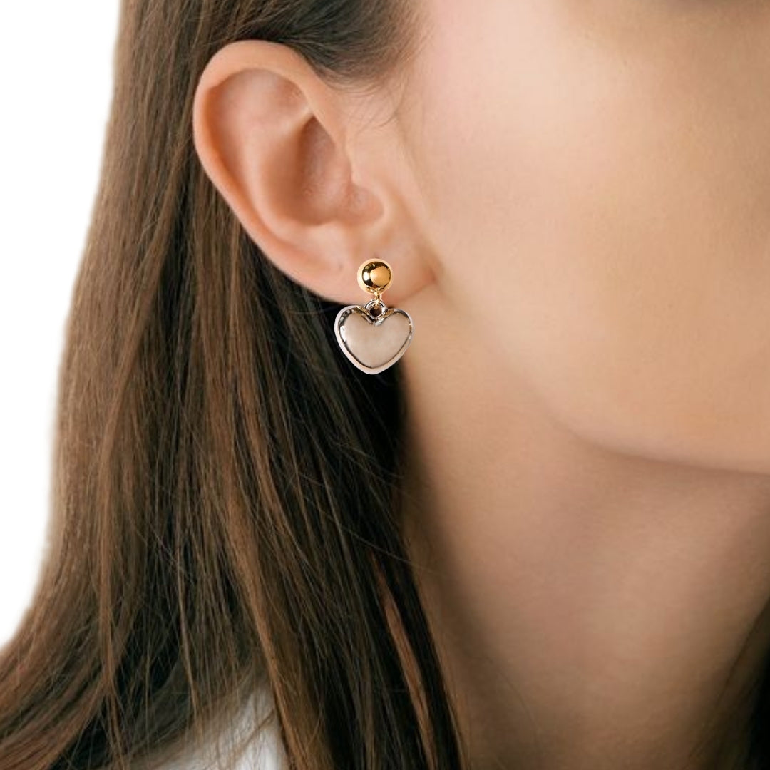 A little love, a little edge - these dangler heart earrings are the perfect mix of charm and sophistication. A sleek gold metal ball sits elegantly on the lobe, catching the light with its polished shine. Suspended below, a silver heart dangles gracefully, creating a beautiful contrast of tones that feels effortlessly chic. Whether you're dressing up for a date night or adding a romantic touch to your everyday look, these earrings bring just the right amount of shine and movement to every moment.