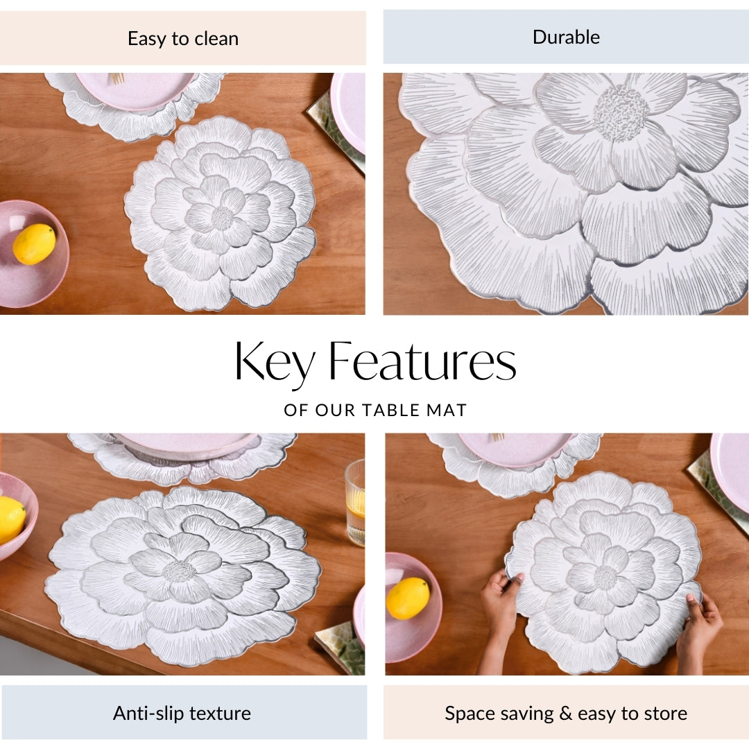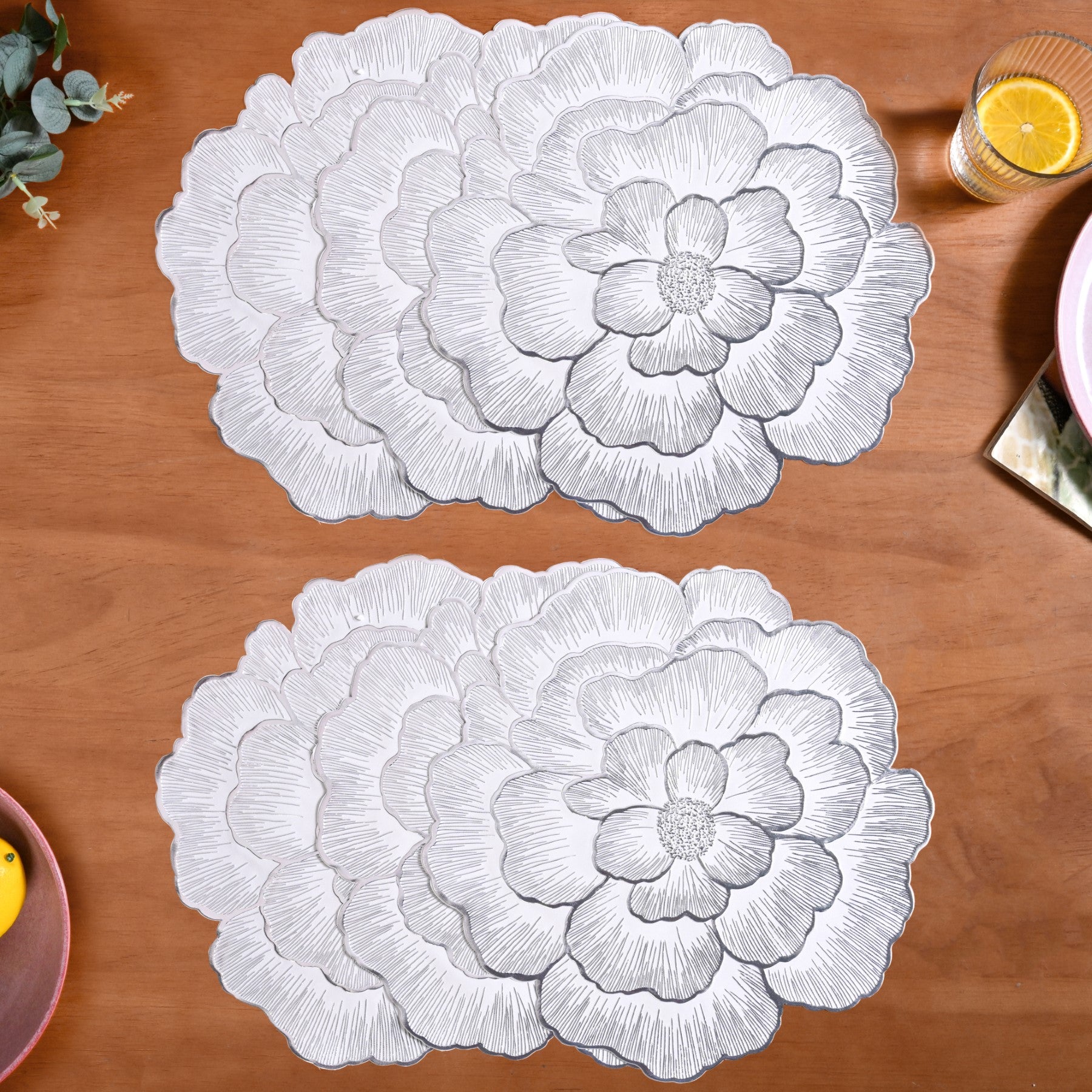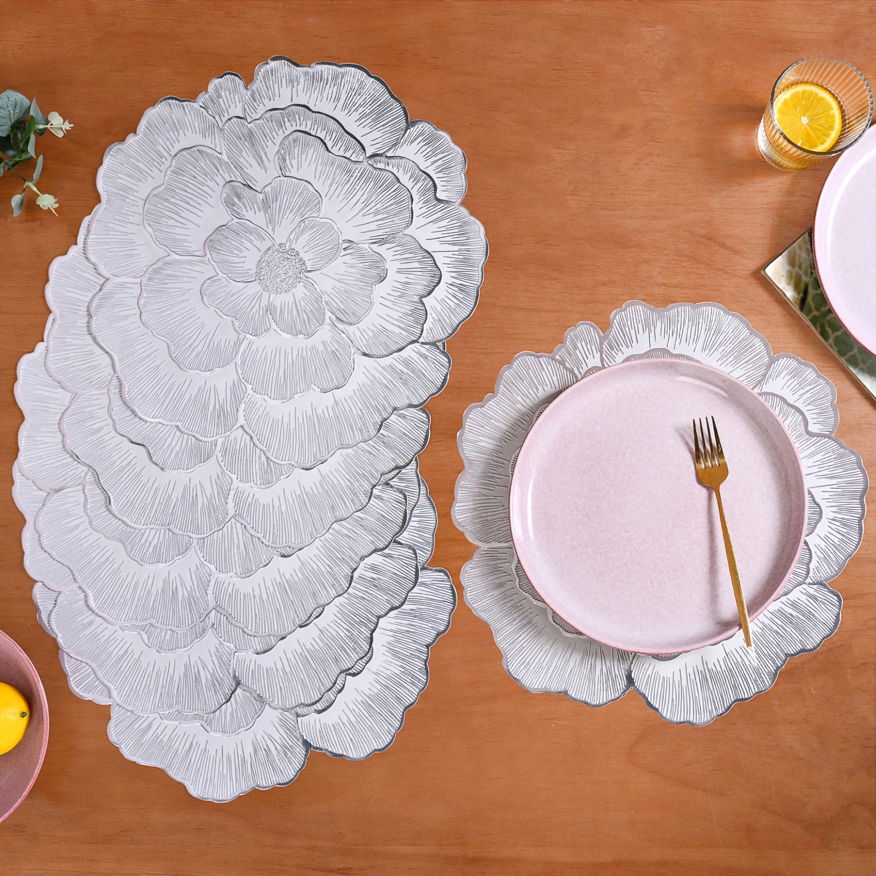 They are generously sized to hold a full place setting, including a dinner plate, cutlery, and a glass. The floral edges extend the visual space without overlapping neighbouring settings.