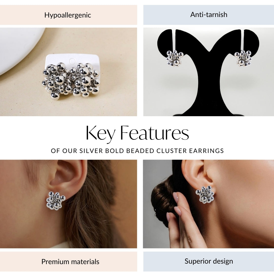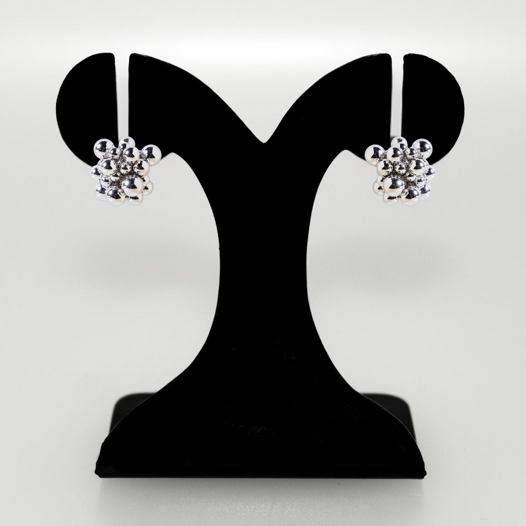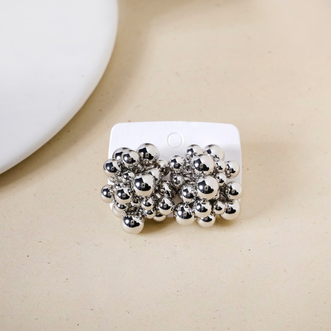 Elevate your style with these striking cluster earrings, designed with an array of silver beads that seamlessly come together to create a dynamic, textured look. Each bead is thoughtfully placed to form a bold, yet refined silhouette, offering a statement piece that effortlessly catches the light.