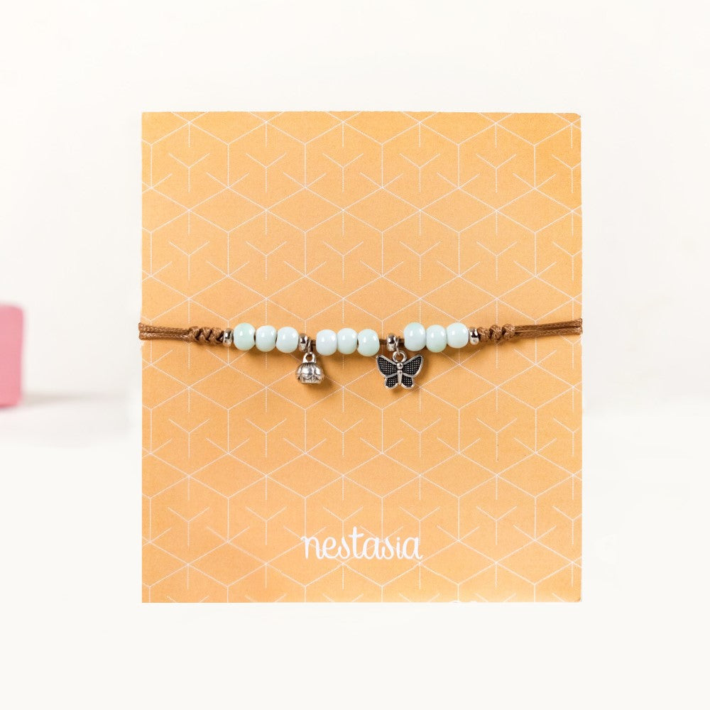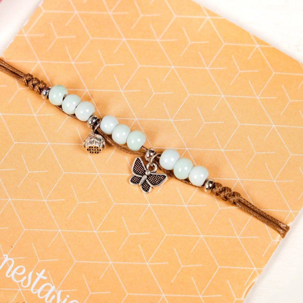 Embrace the dainty and delicate beauty of nature's winged marvel with this stylish bracelet. Featuring a silver butterfly and flower charm with a strand of pale blue beads for a subtle hint of colour, the string bracelet exudes casual sophistication. Secured by an adjustable drawstring mechanism, this beautiful bracelet complements every outfit in the book. Whether you've donned a cute sundress for a brunch date or running errands in a flowy blouse, the versatile bracelet elevates every look.