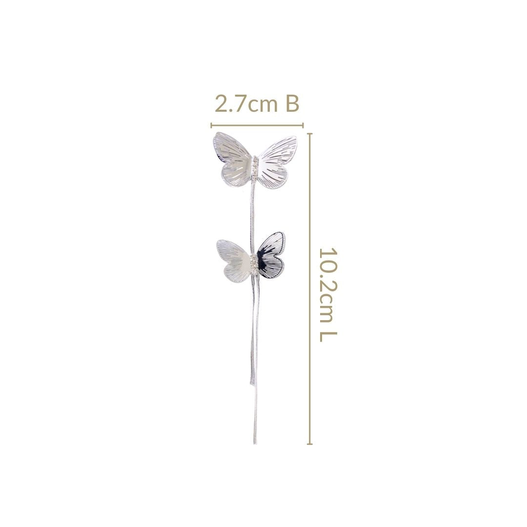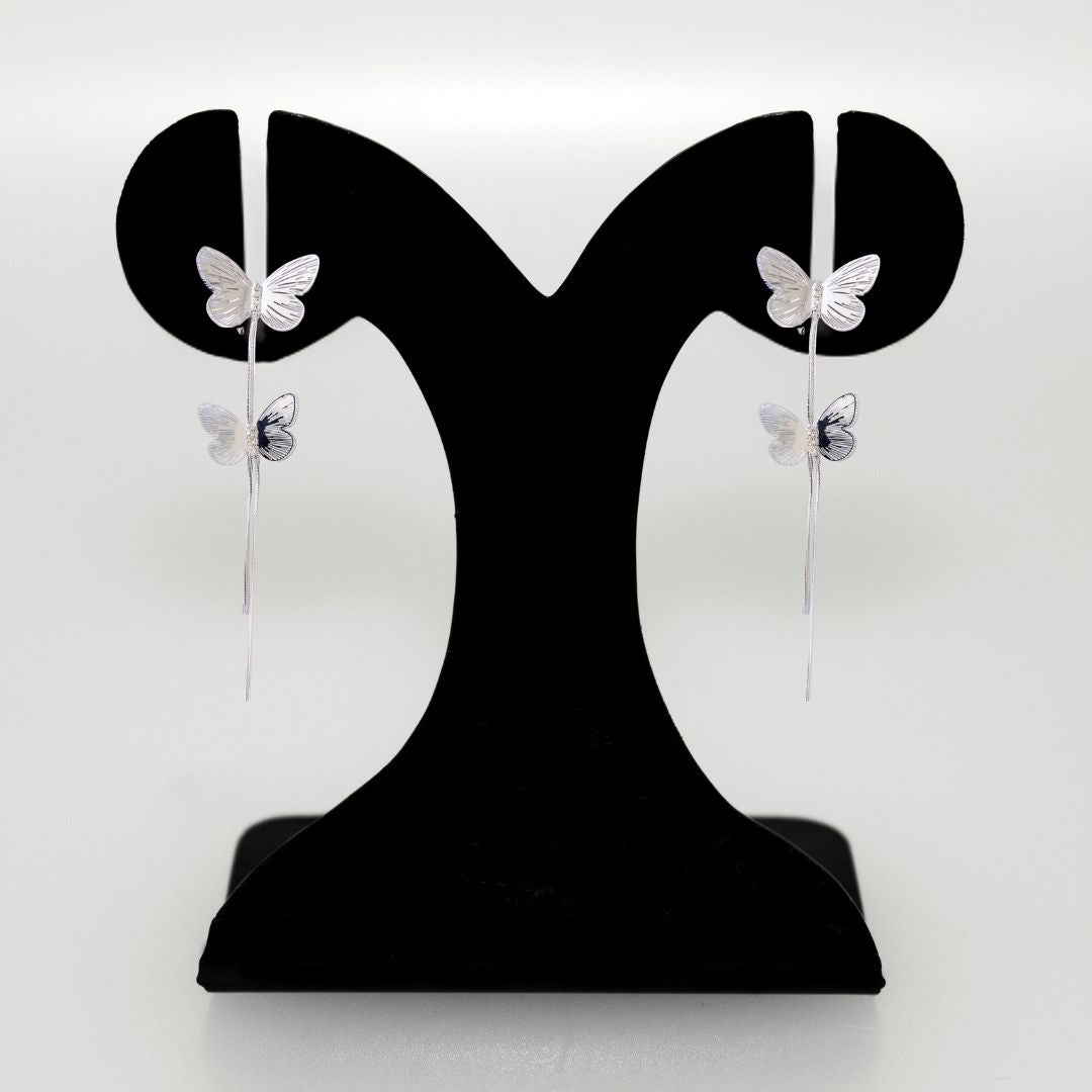Delicate and enchanting, these silver metal thread earrings combine elegance with whimsy. The top features a beautifully crafted silver butterfly adorned with shimmering stones as its body, adding a touch of sparkle. Below, a smaller butterfly dangles gracefully, suspended by a sleek silver thread that creates a subtle yet striking movement.