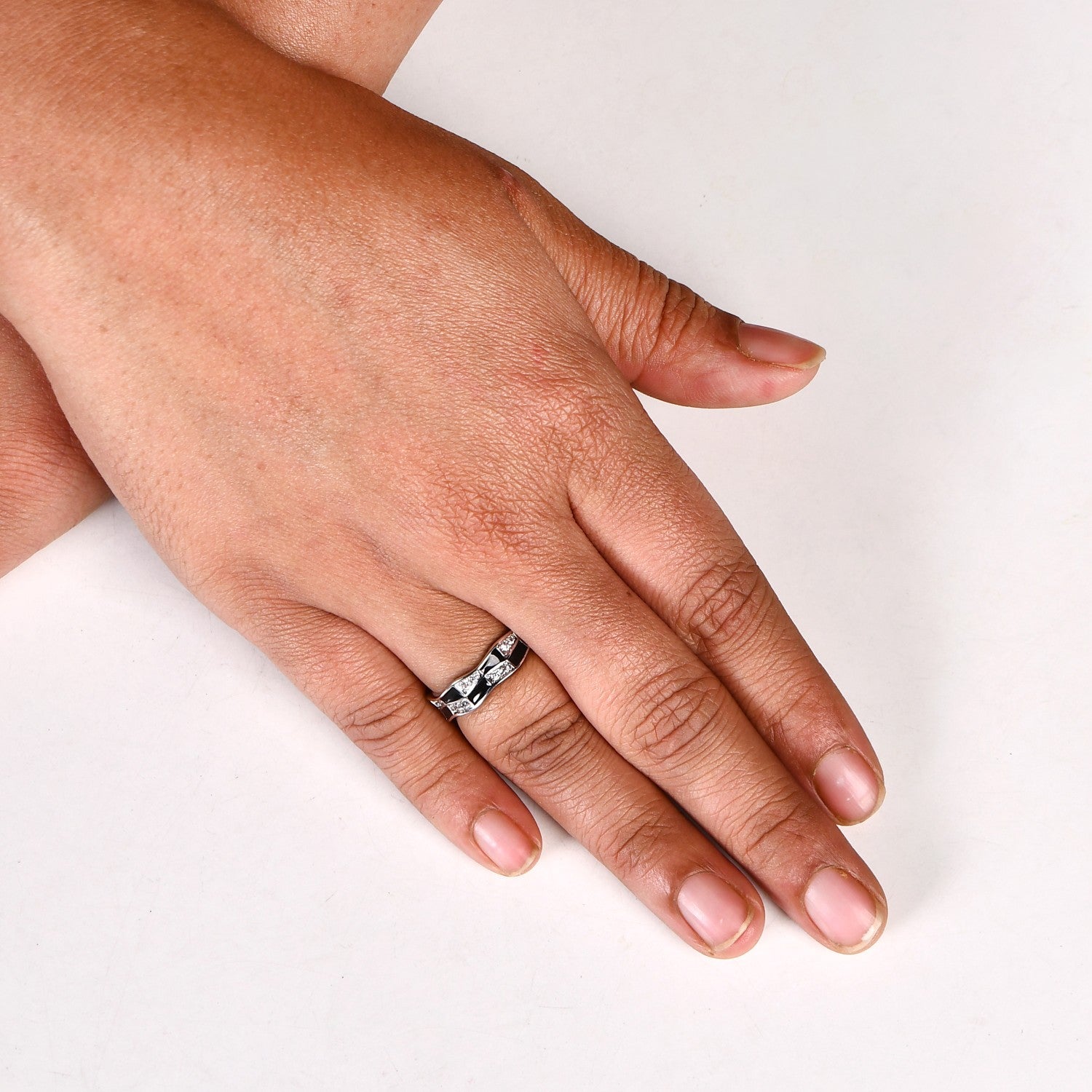 A striking blend of bold contrasts and intricate detailing, this silver-toned adjustable ring features a wavy round shape that adds a dynamic touch to its design. Inspired by the timeless appeal of classic checkerboard patterns, the ring seamlessly combines solid black segments with shimmering stone-studded sections, creating a mesmerising interplay of textures and light. The fluid, undulating shape enhances its contemporary charm, while the adjustable band ensures a comfortable fit. A statement piece that bridges vintage elegance with modern artistry, this ring is perfect for those who love distinctive and versatile accessories.