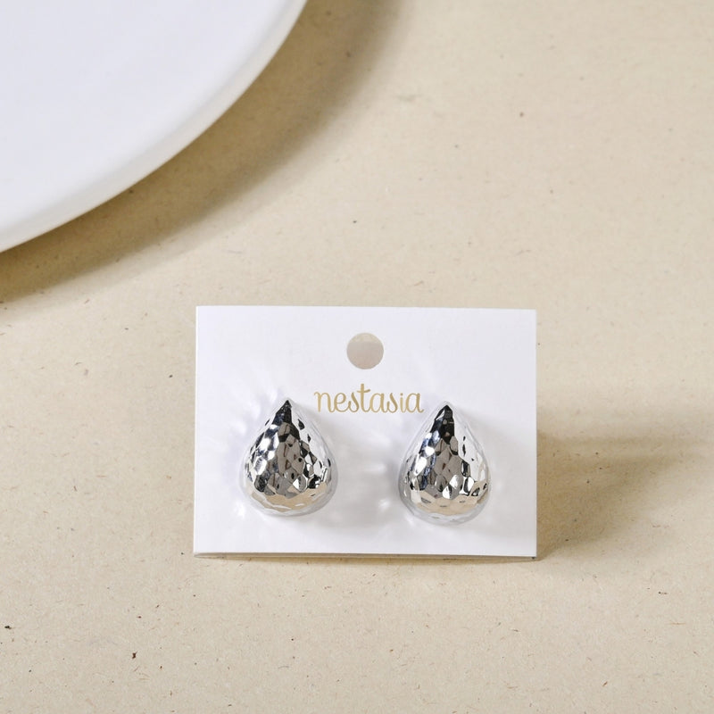 Nestyle: Let these textured silver drop studs be the highlight by pairing them with a sleek, minimalist outfit—think a black turtleneck or a structured blazer.
