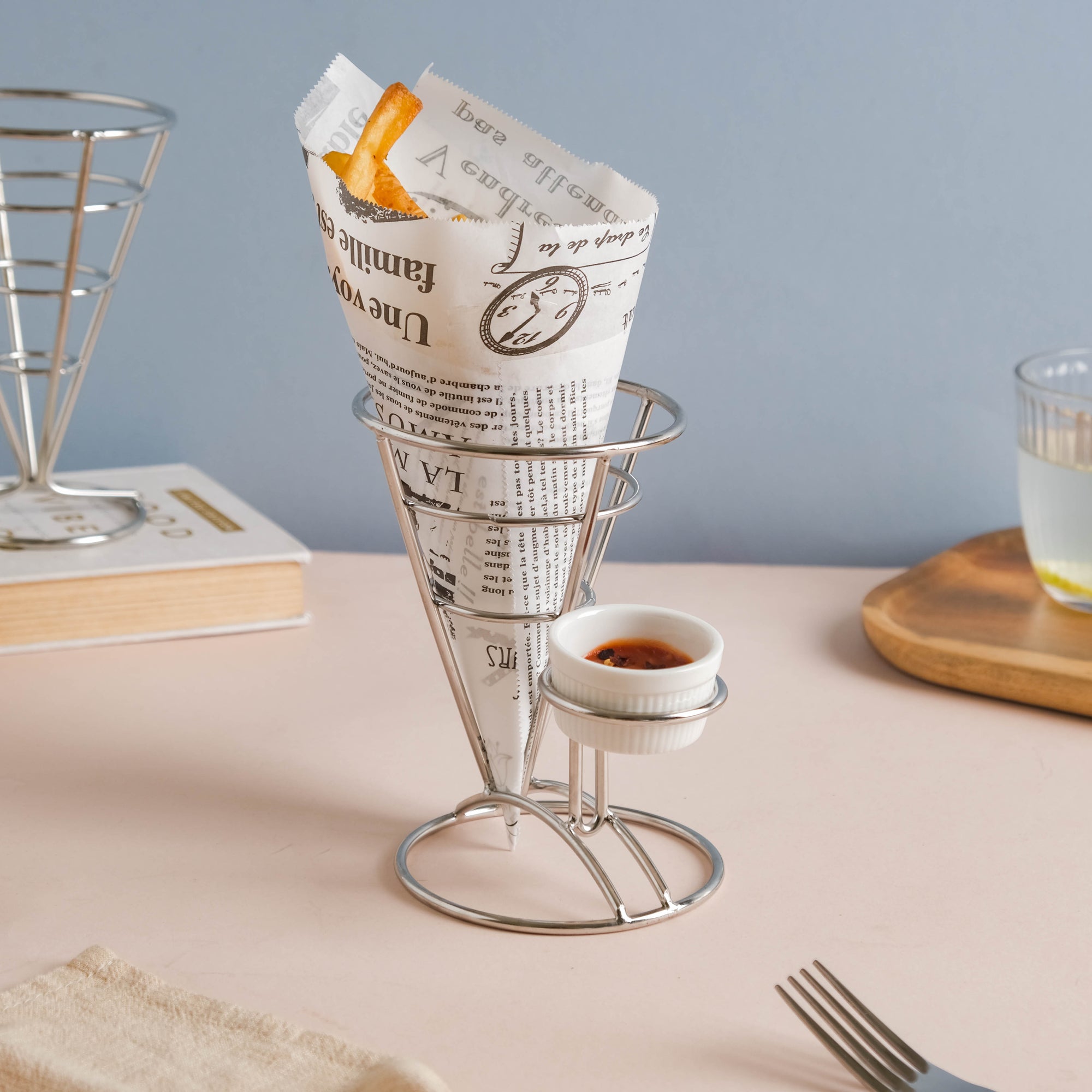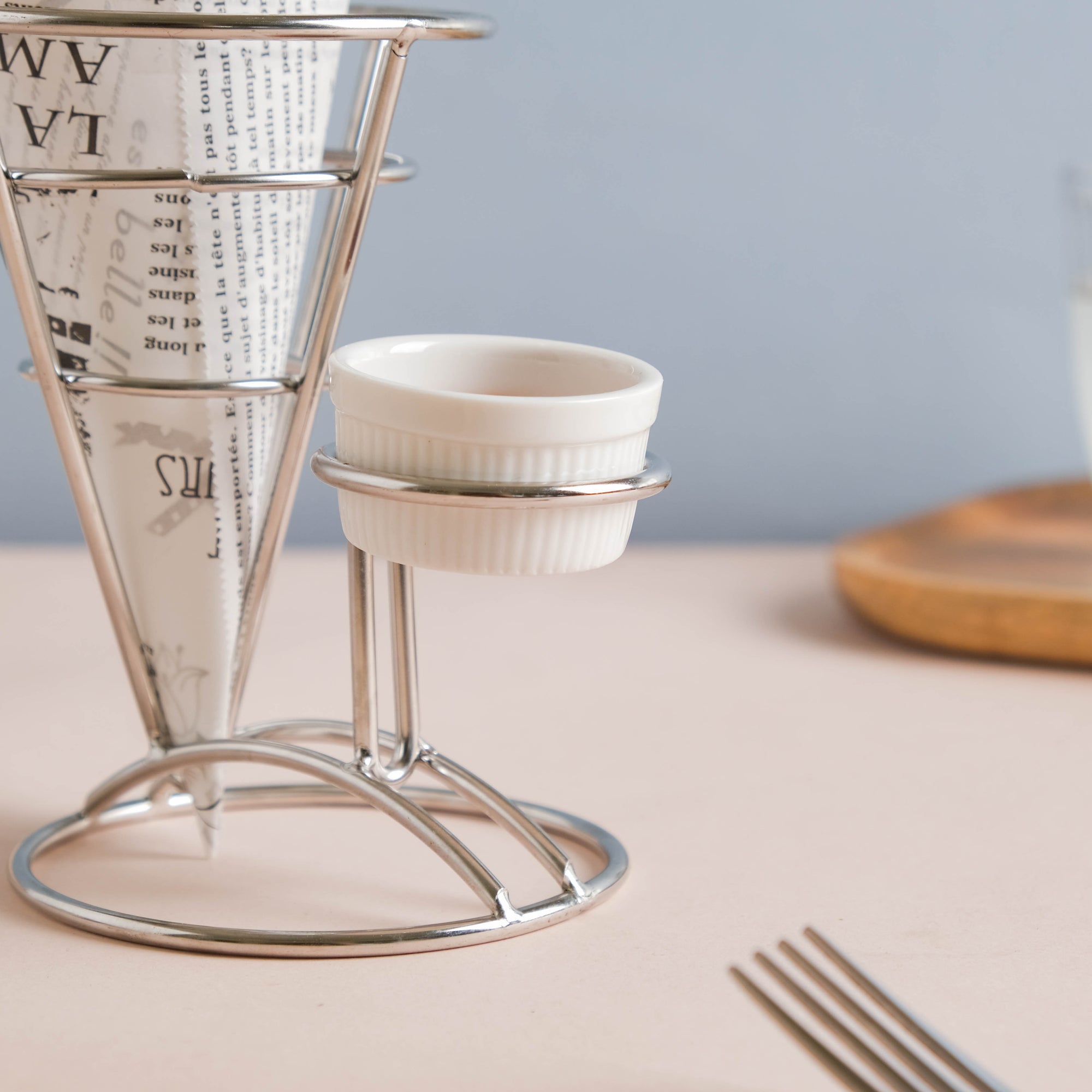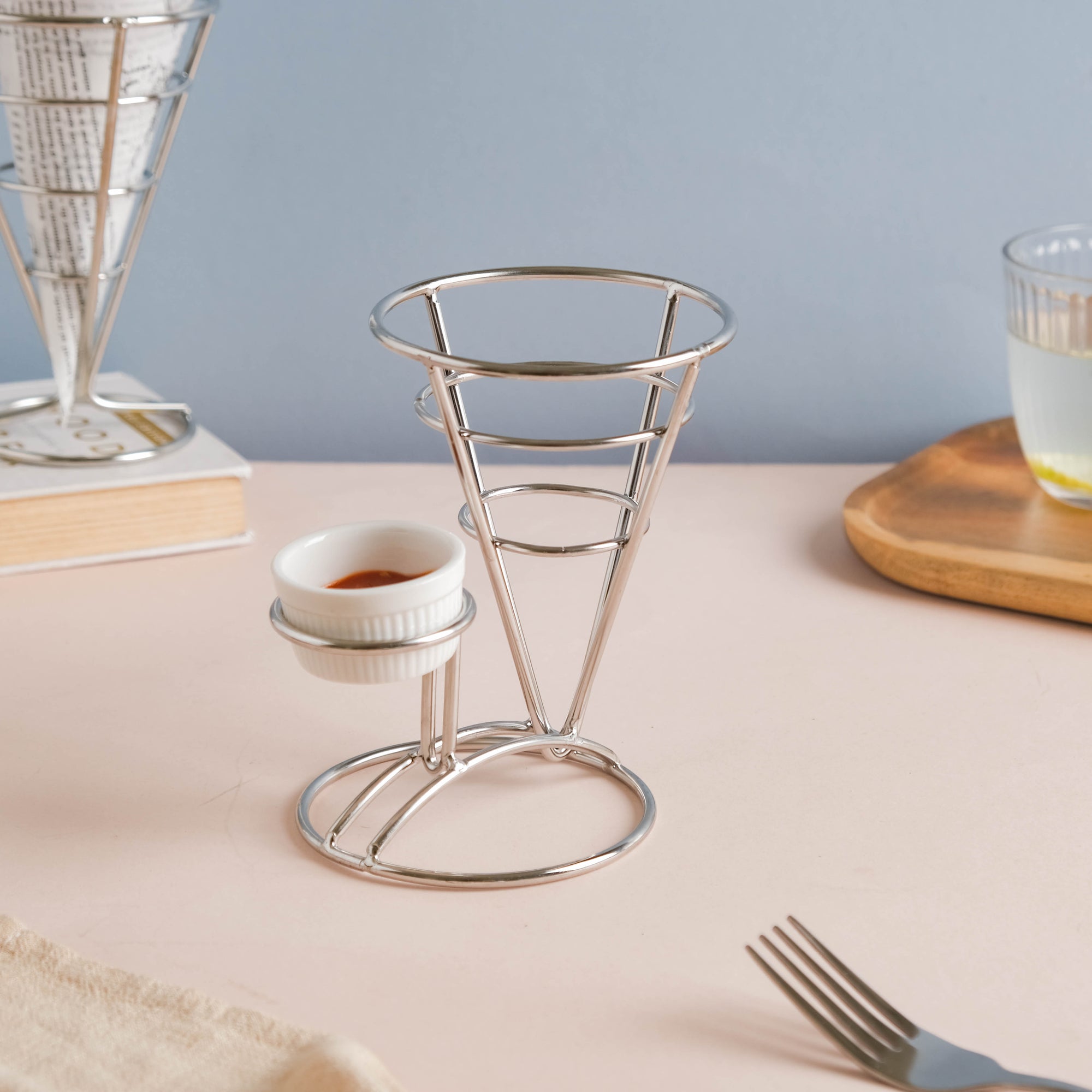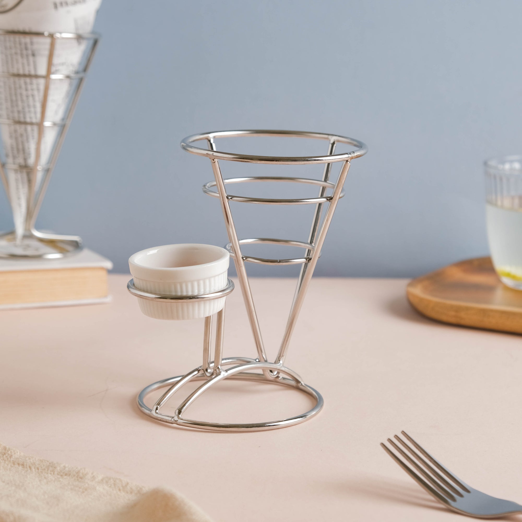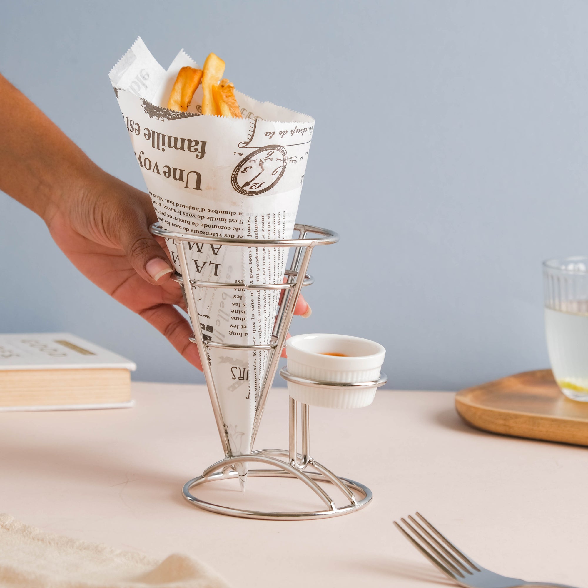Give your fries serving style a quick makeover with our French fries serving conical basket made of premium quality stainless steel. The basket can be utilized for making a single serving as well as placing it on the coffee table for people to share and eat while exchanging stories over a cup of tea. The conical snack serving stand features a cavity on one side to hold sauce or chutney cups along with the munchies. Place a conical piece of butter paper in the basket to directly pour in some freshly fried French fries, potato wedges, or nuggets. The innovative snack serving adds a modern touch to any serving and dining experience.