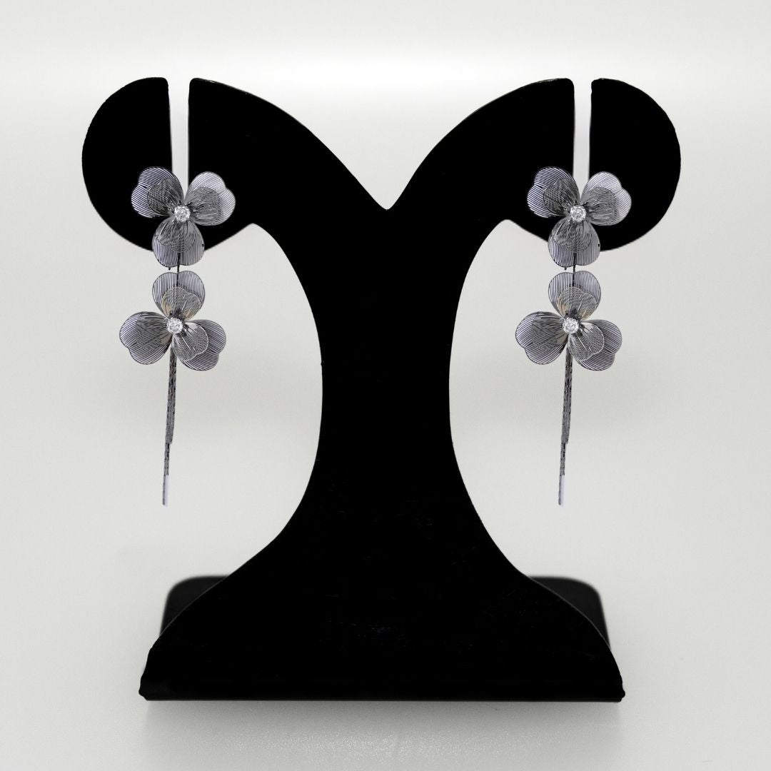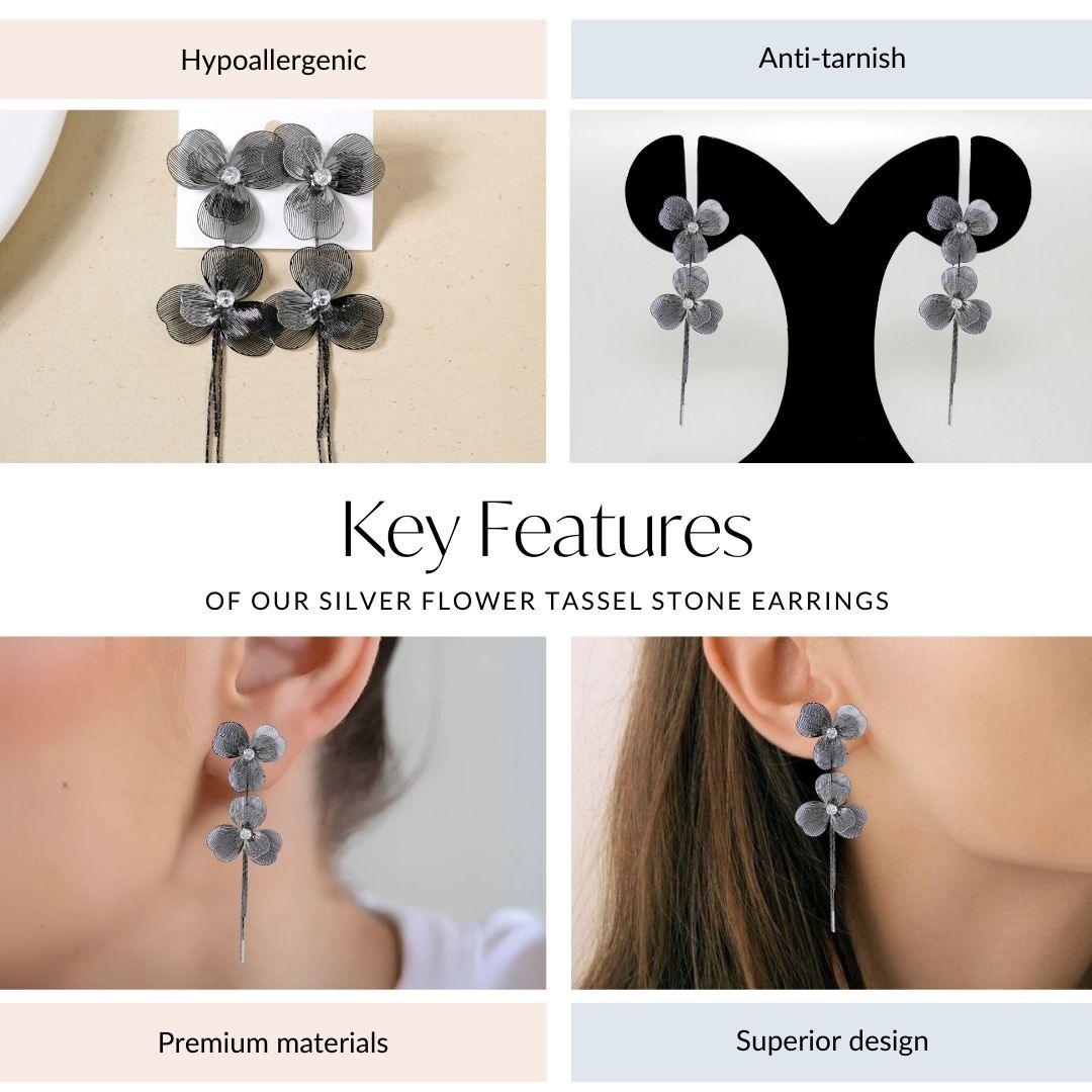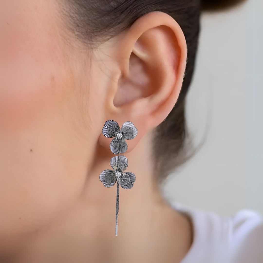 The silver metal thread earrings feature a delicate floral design that starts with a beautiful flower at the top, adorned with a stone in the center. The thread gracefully continues, with another flower placed in the middle, creating an elegant flow that captures both intricate detail and timeless beauty.