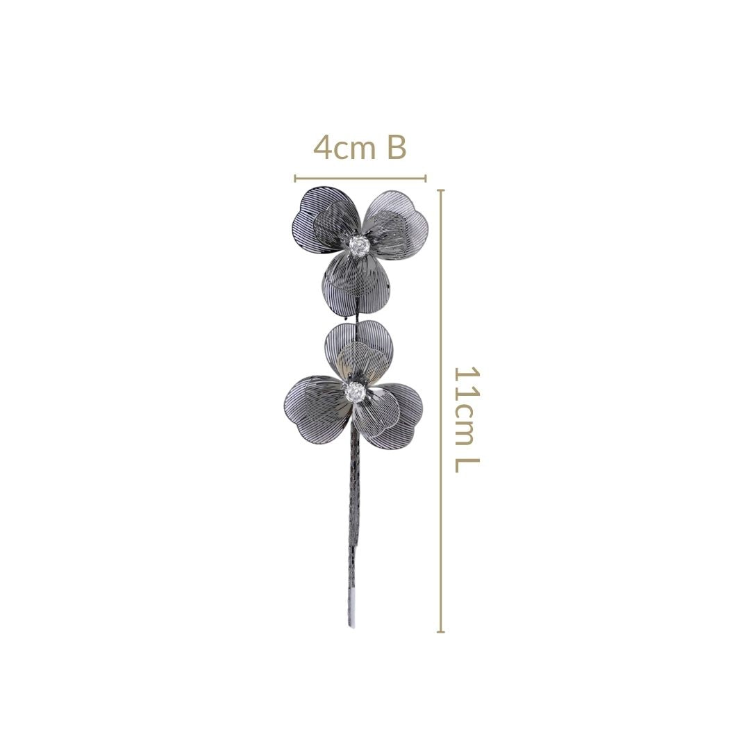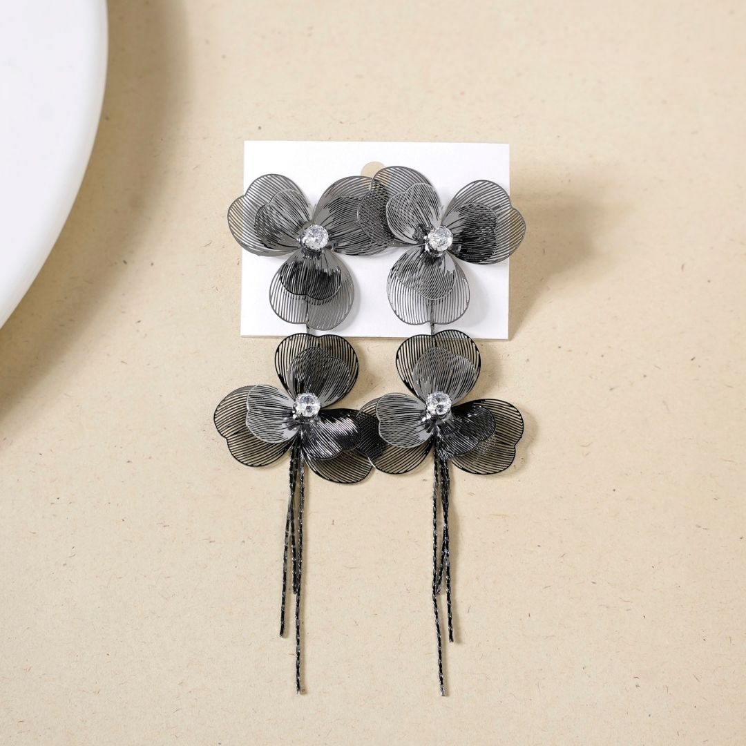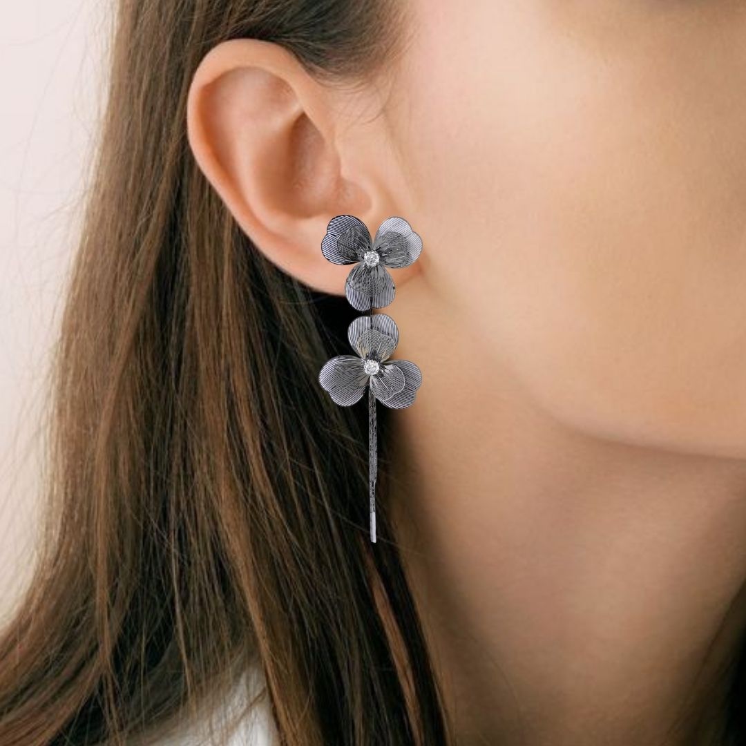 The silver metal thread earrings feature a delicate floral design that starts with a beautiful flower at the top, adorned with a stone in the center. The thread gracefully continues, with another flower placed in the middle, creating an elegant flow that captures both intricate detail and timeless beauty.
