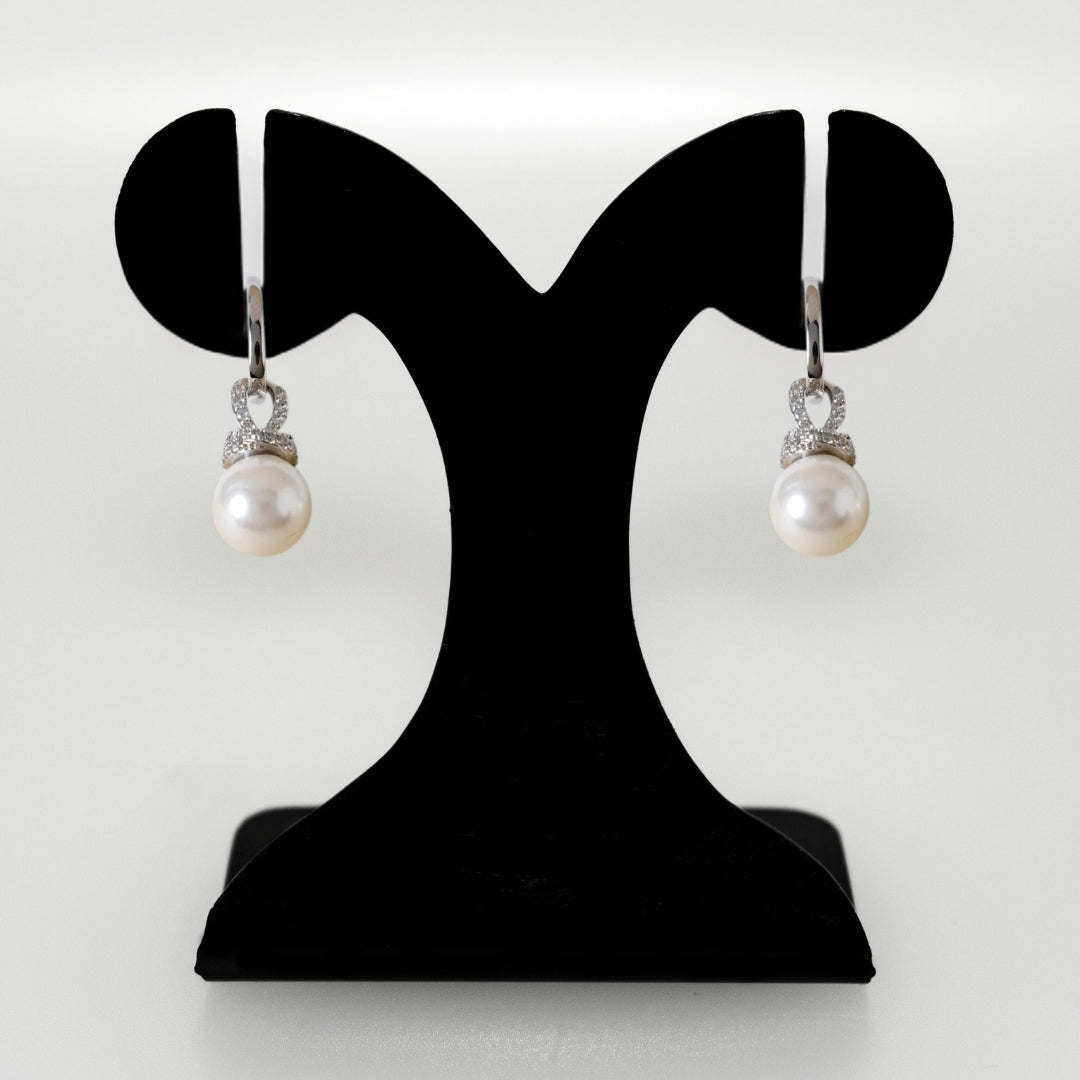 A symphony of curves and brilliance, these pearl drop earrings are a testament to refined craftsmanship. The sleek J-shaped metal arc forms a striking silhouette, effortlessly guiding the eye to a dazzling, stone-studded ring that glistens with every turn. Suspended delicately below, a lustrous pearl completes the design, swaying like a droplet of liquid elegance. The interplay of structured metal, radiant stones, and the organic beauty of the pearl creates a mesmerizing balance between modern artistry and classic sophistication.