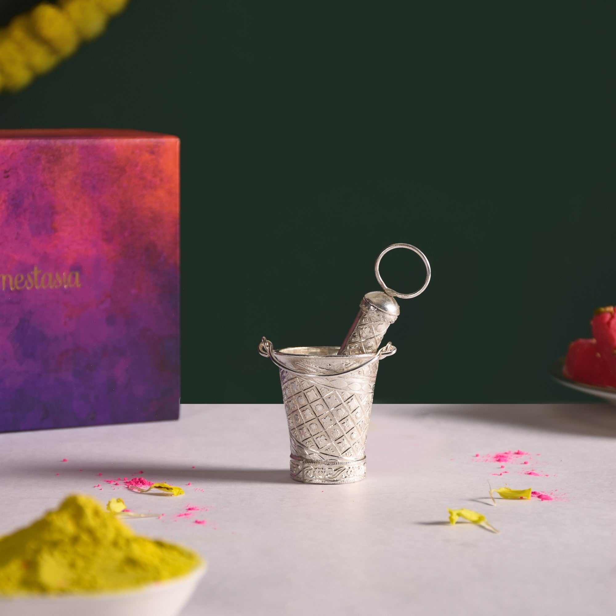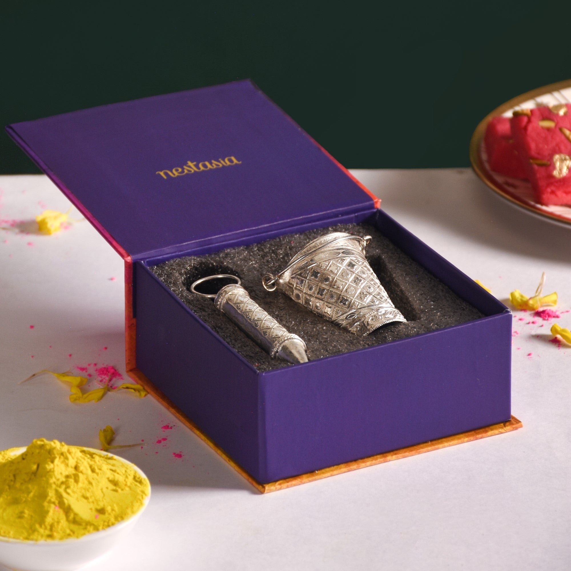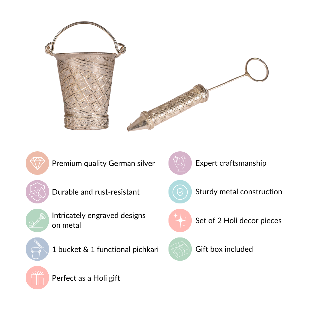 These exquisite Holi decor pieces are meticulously crafted from premium quality German silver. German silver is a copper alloy, renowned for its durability and lustrous finish, ensuring that these pieces not only stand the test of time but also retain their elegance throughout years of use.