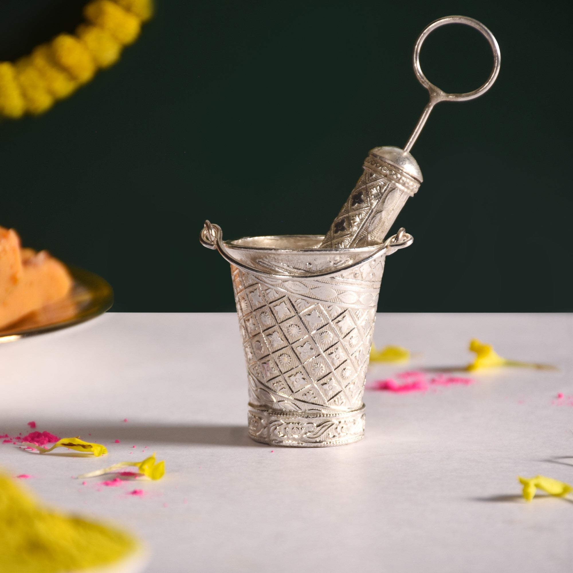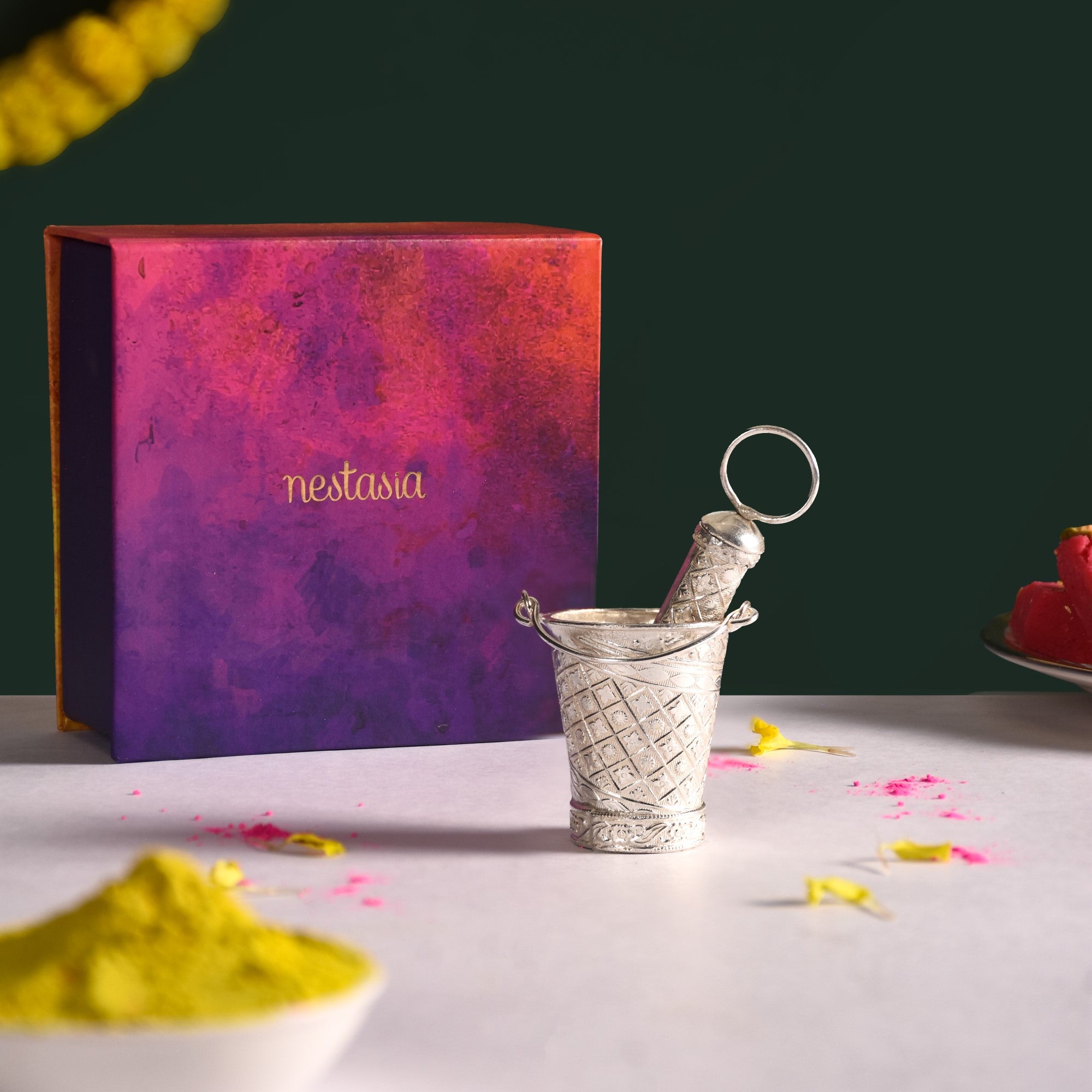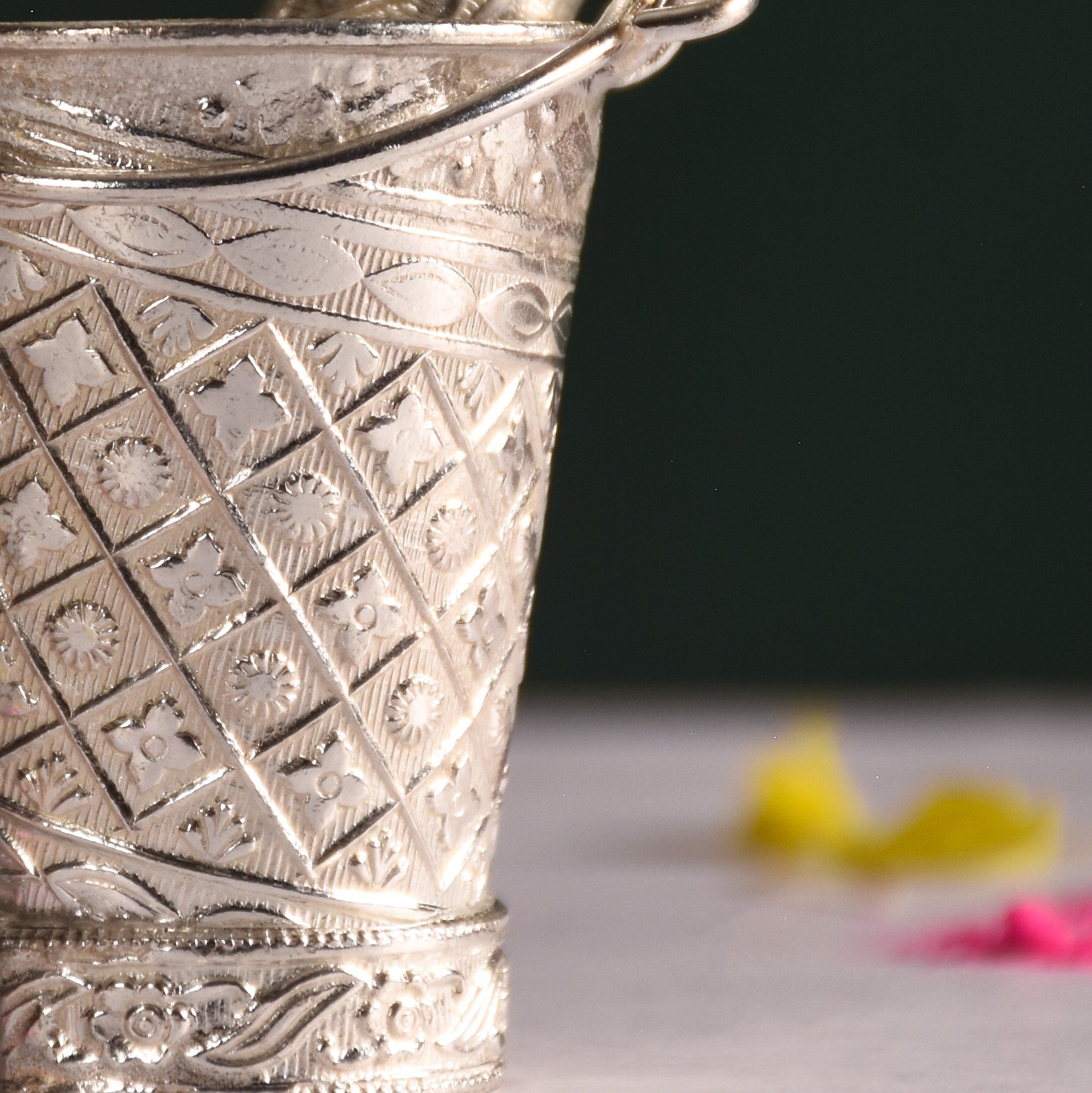 These exquisite Holi decor pieces are meticulously crafted from premium quality German silver. German silver is a copper alloy, renowned for its durability and lustrous finish, ensuring that these pieces not only stand the test of time but also retain their elegance throughout years of use.