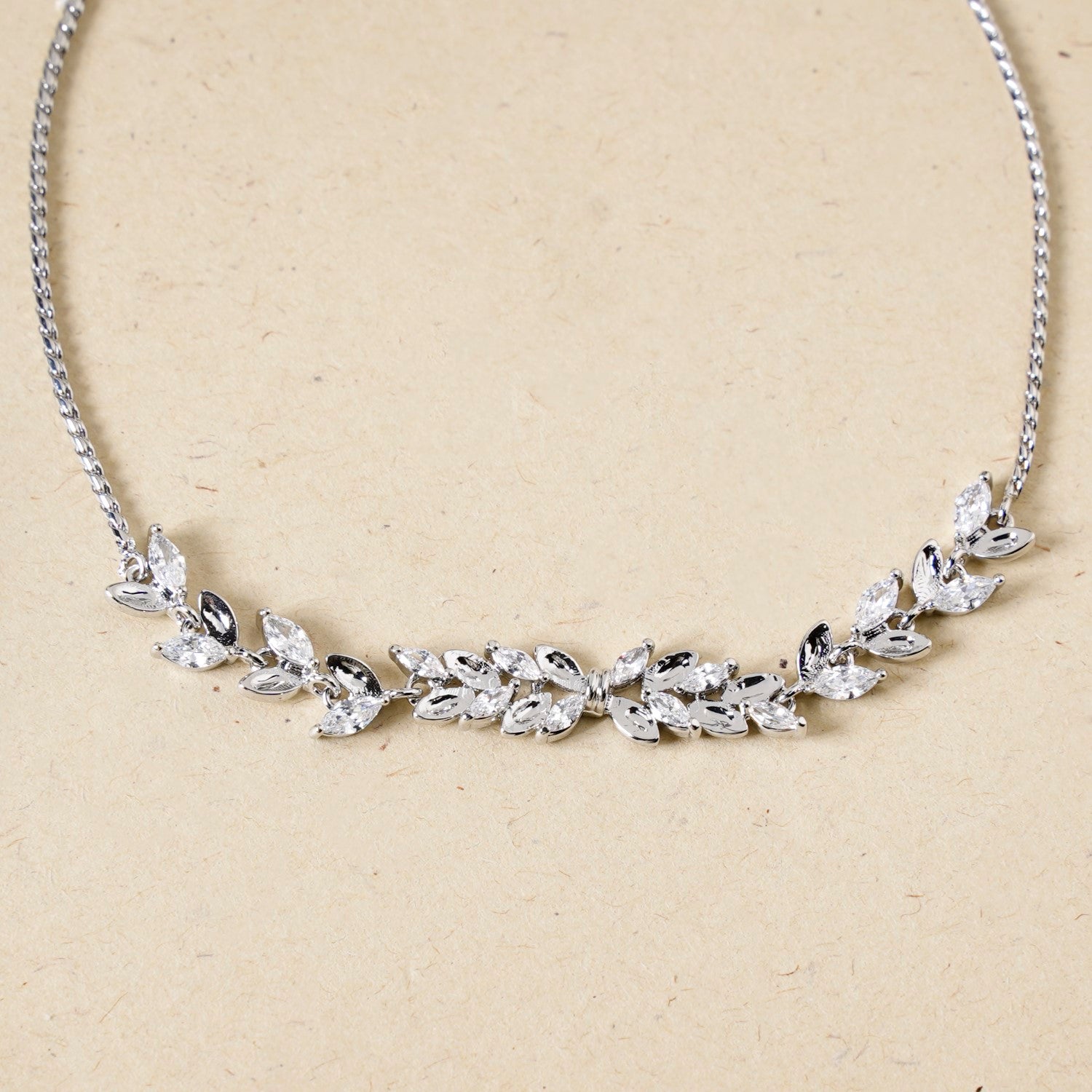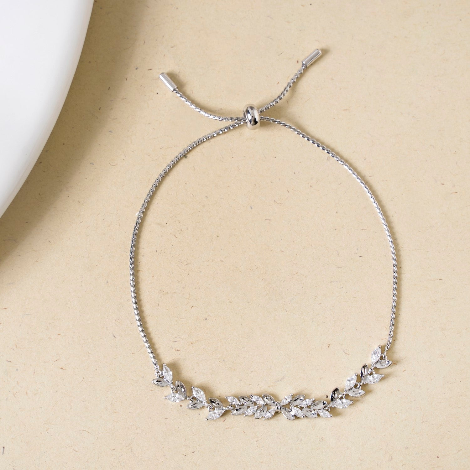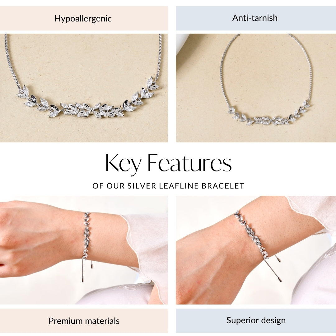 Drawing inspiration from nature's delicate charm, this leafline bracelet is a perfect balance of sophistication and versatility. The sleek silver chain elegantly holds a duo of contrasting leaves. One is encrusted with glistening stones that shimmer with an iridescent glow, while the other features a polished silver-plated leaf, adding a touch of modern minimalism. Designed with a sliding knot closure for an adjustable fit, this bracelet is ideal for effortless layering or as a standalone piece that radiates understated elegance.