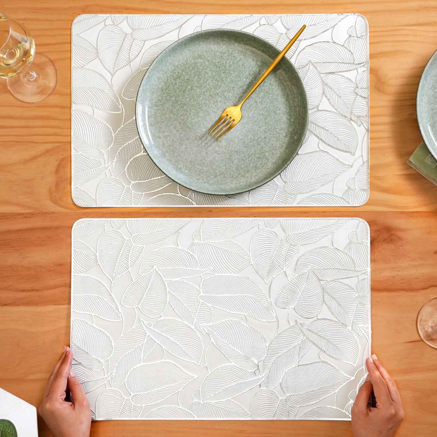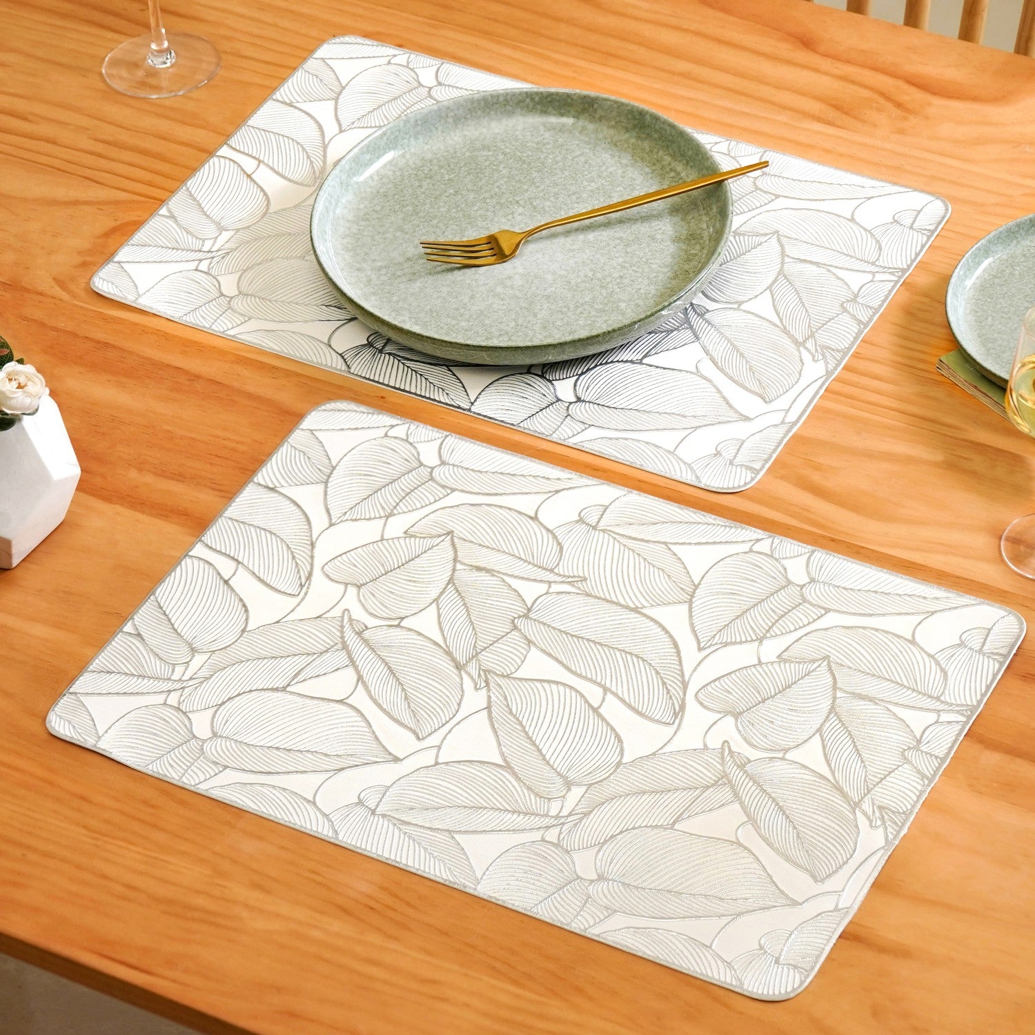 Benefits: Crafted from PVC, they're water-resistant, durable, and easy to clean. The rectangular shape offers wide coverage for plates and cutlery. The anti-slip texture keeps dishes steady and prevents clatter. These dining mats help avoid spills and scratches on your table. The leaf design adds visual appeal without overpowering your setup.