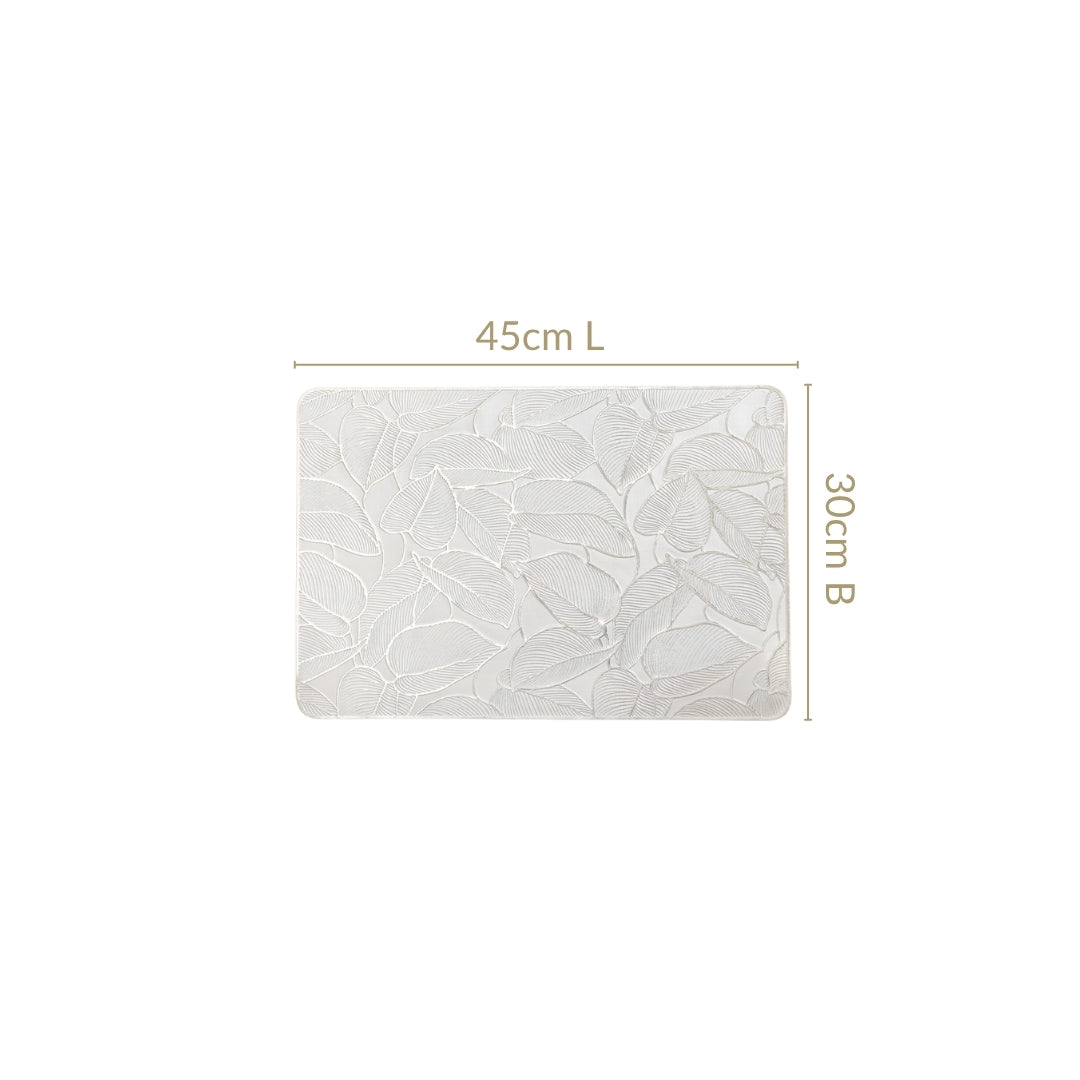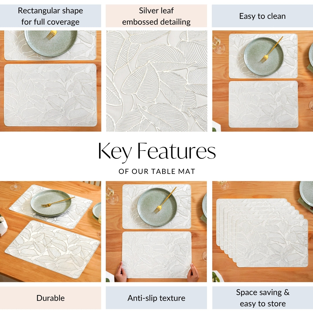 Design: Each table mat is crafted in a sleek rectangular shape that fits most table settings with ease. The white PVC base provides a clean canvas for the stunning silver leaf embossing. The leaf pattern features intricate textured detailing that adds a tactile charm. Smooth, rounded edges soften the overall look while enhancing safety. The mats have a slightly raised surface that subtly catches light. Their minimalist yet nature-inspired design blends beautifully with modern and classic décor styles.