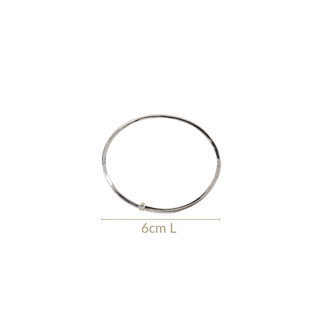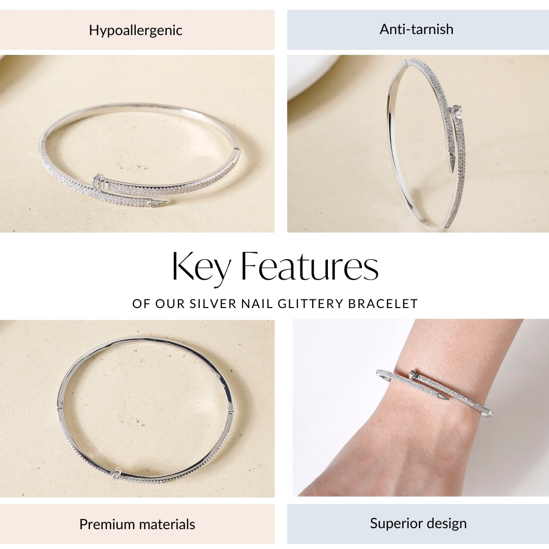 Introducing the silver nail bracelet - which is the perfect fusion of industrial chic and refined elegance. Crafted to emulate the sleek form of a nail, this bracelet features a base end and a pointed end that elegantly bypass each other, creating a seamless and secure fit. The bracelet opens and closes effortlessly with a screw-like clasp, ensuring both style and functionality. Adorned with shimmering stone studs that cover the entire front, this bracelet adds a touch of sparkle to any attire.