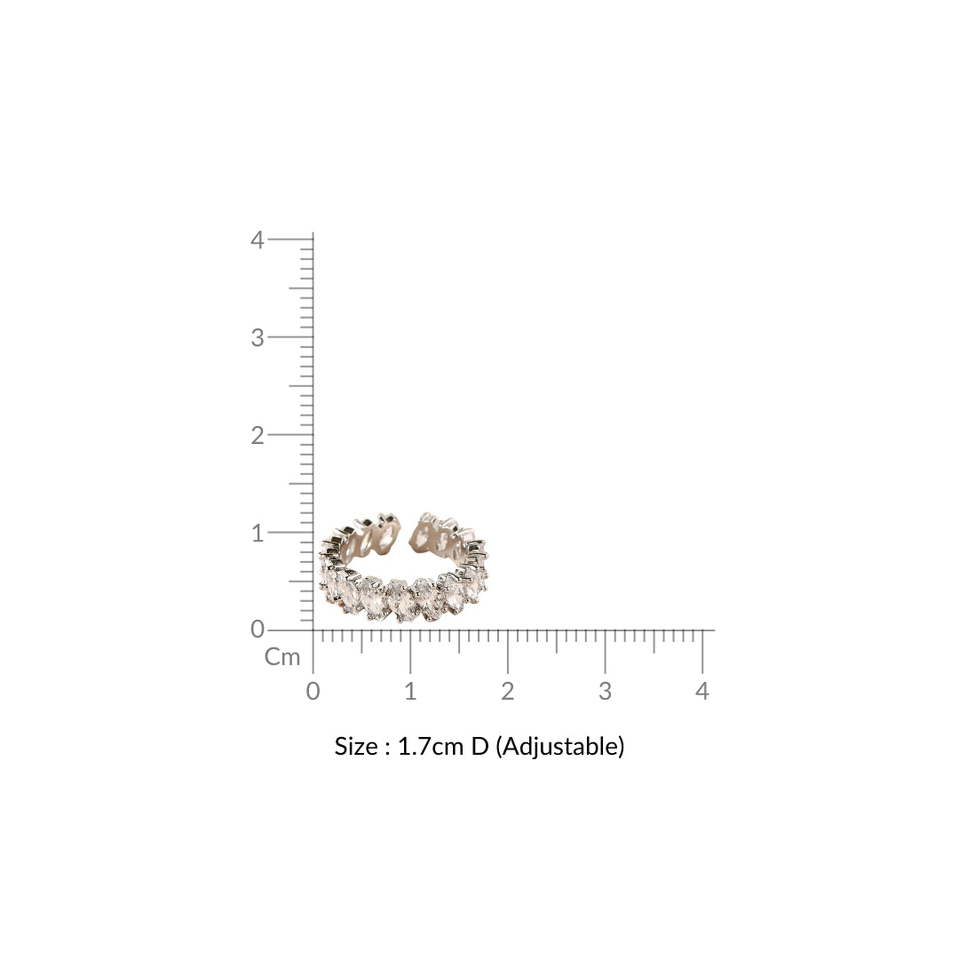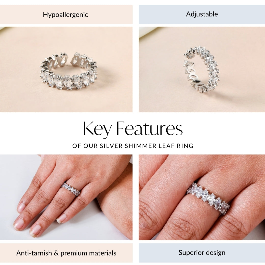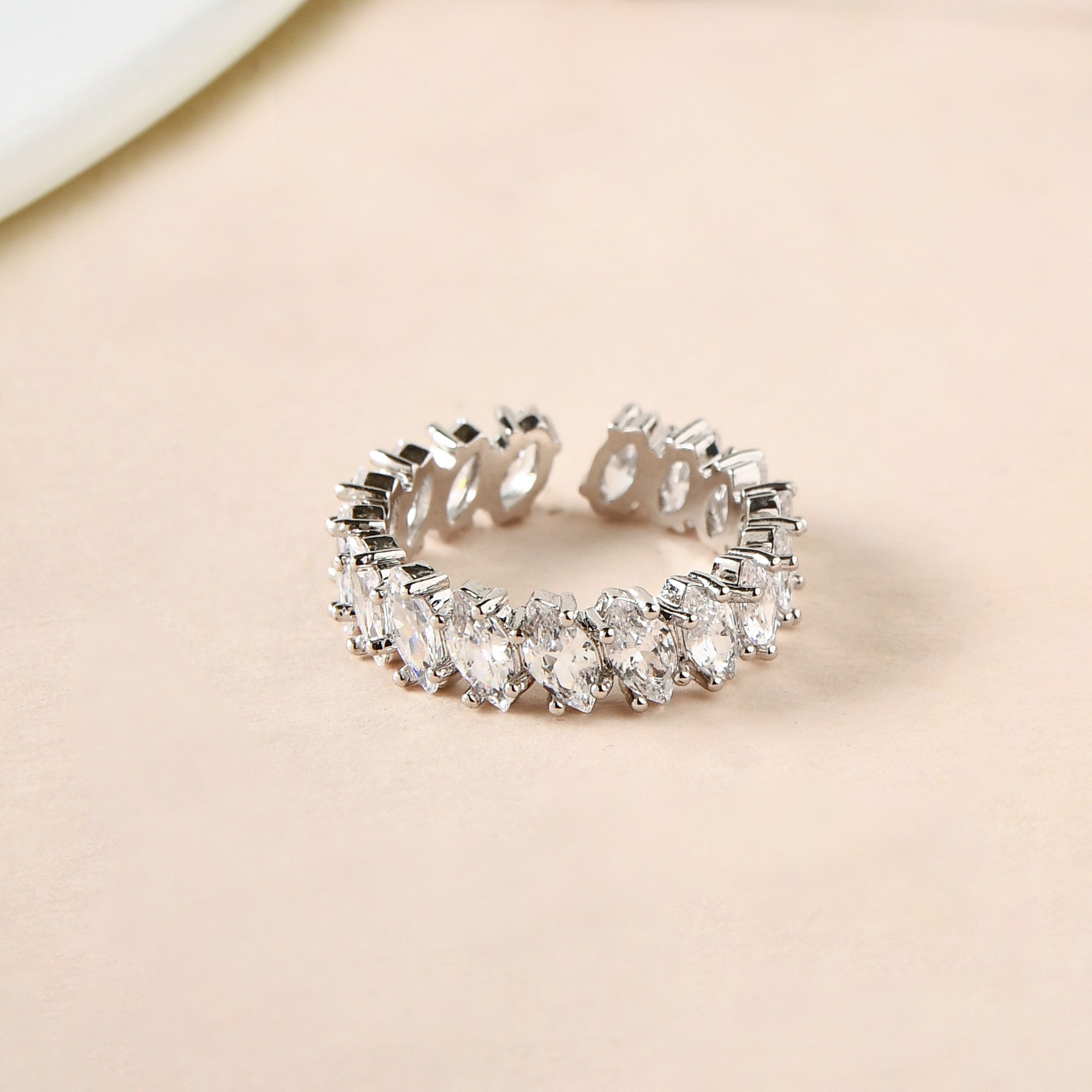 A symphony of shimmer and grace, this silver ring is designed to captivate. Crafted with a silver-toned metal base, this ring is entirely encrusted with dazzling stones, arranged in a delicate leaf-like structure. The slightly slanted placement of the stones creates a dynamic, flowing appearance—like leaves caught in a gentle breeze.