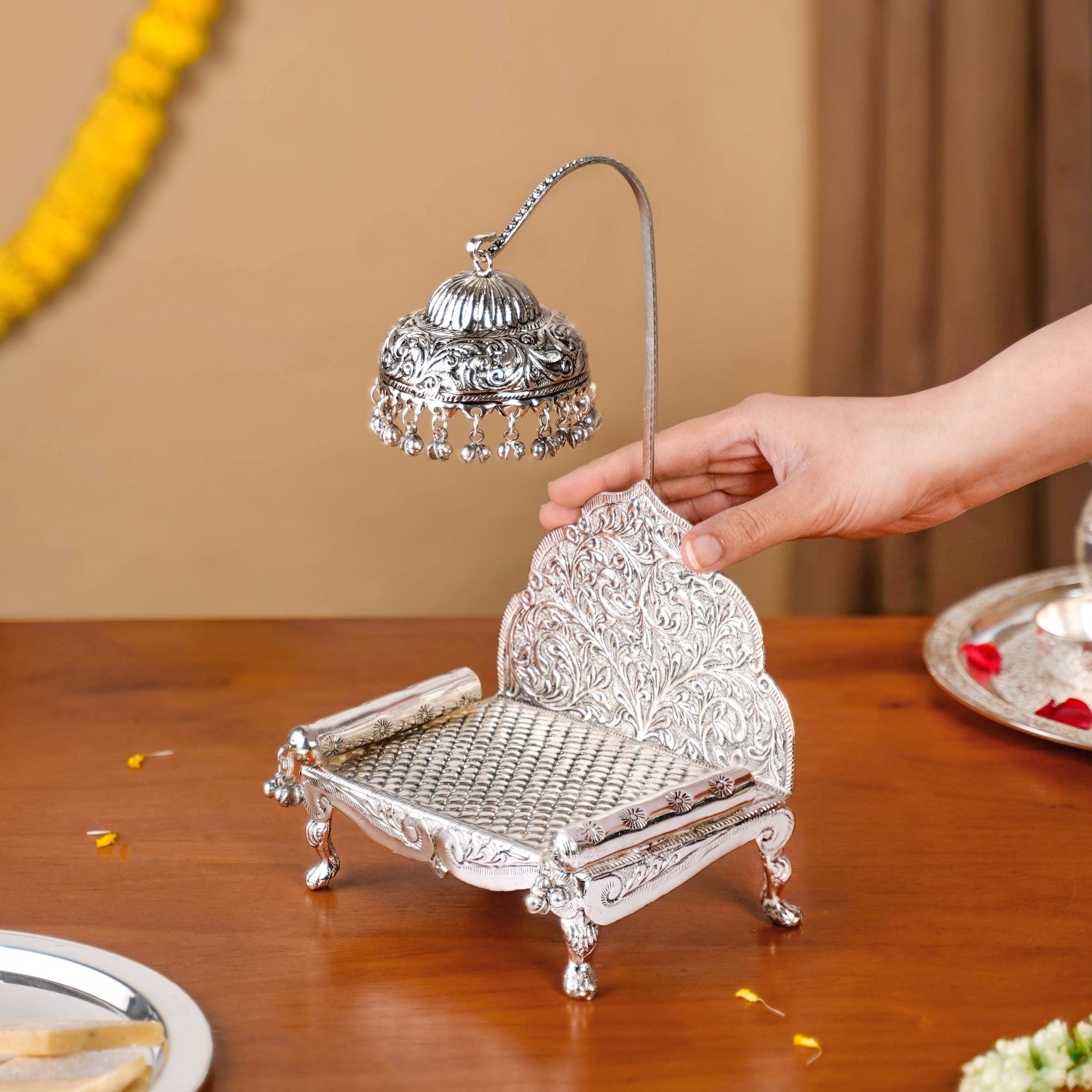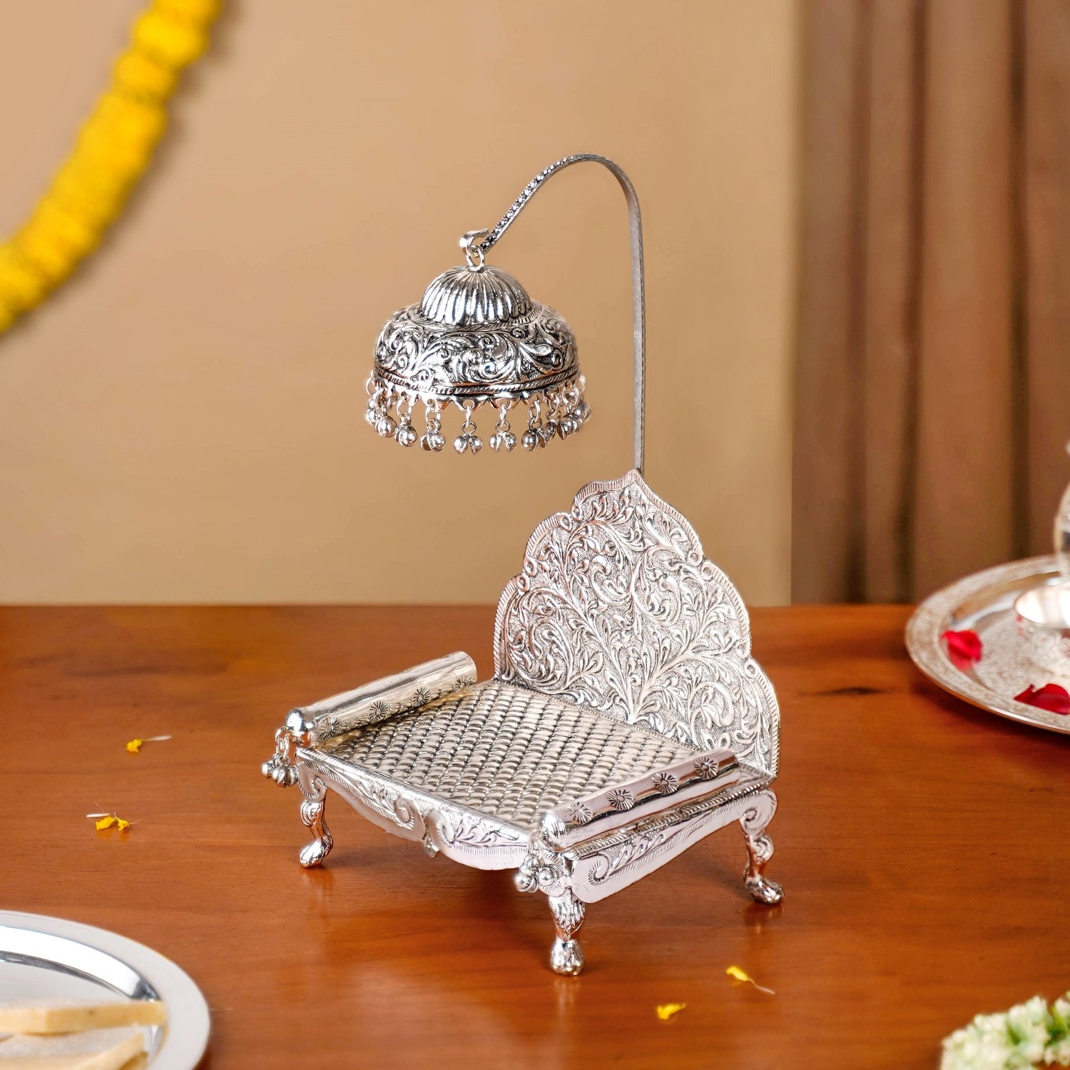 A puja space is not just an area, it's a sacred corner that holds deep emotional and spiritual significance. This handcrafted silver-toned singhasan is made to respectfully house your revered deity. Rooted in tradition and designed with care, it becomes a serene centrepiece for daily worship and special rituals.