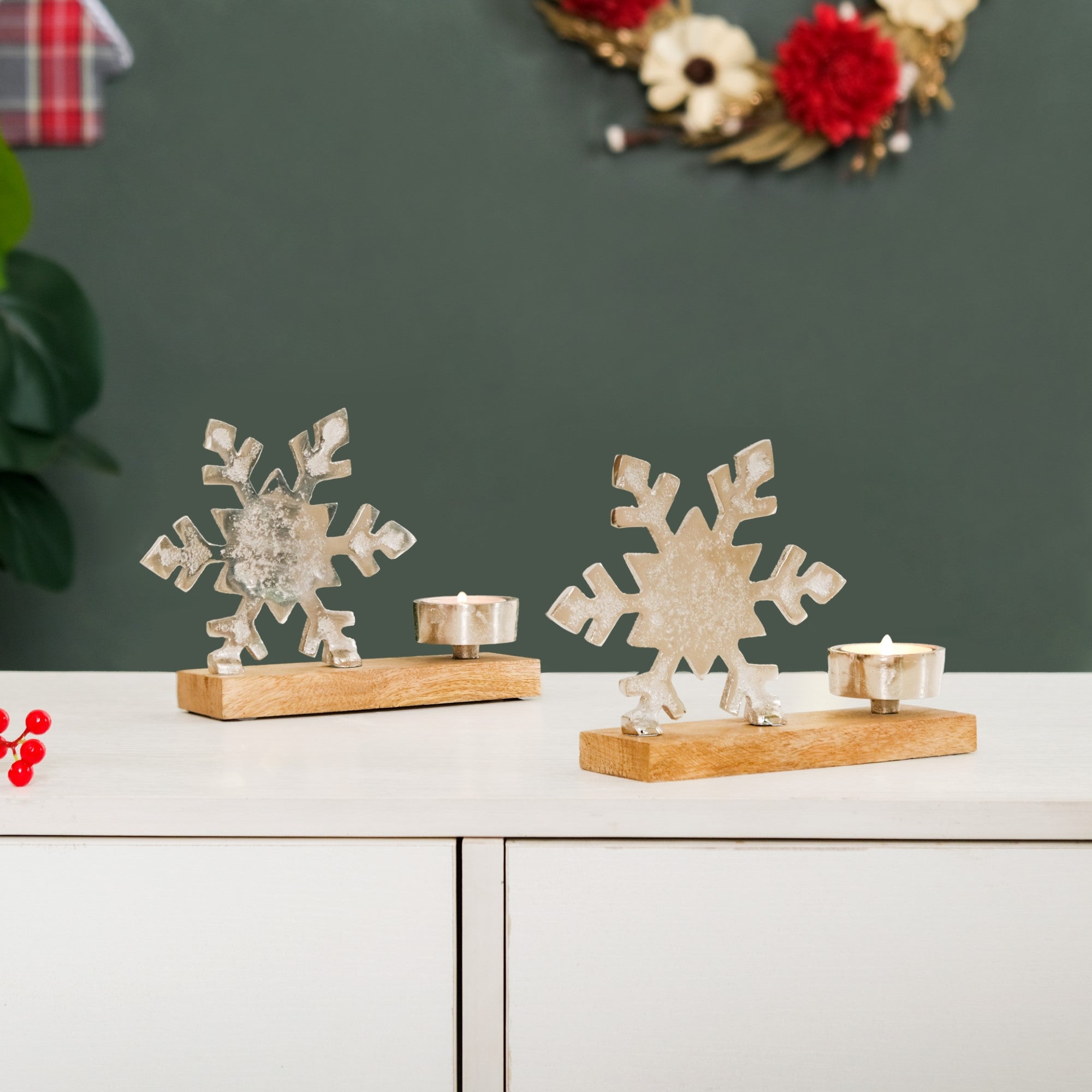 These snowflake tea light holders are best suited for indoor settings due to their lightweight construction and anti-skid features, providing stability on indoor surfaces. However, you can use them as centerpieces in gatherings outdoors as long as they are sheltered from weather elements that could damage the finish. The furniture pads at the base of the mango wood ensure anti-skid properties, providing stability on various surfaces.