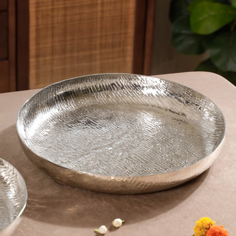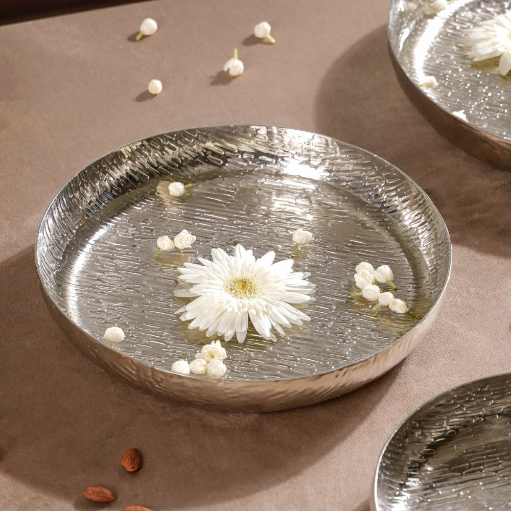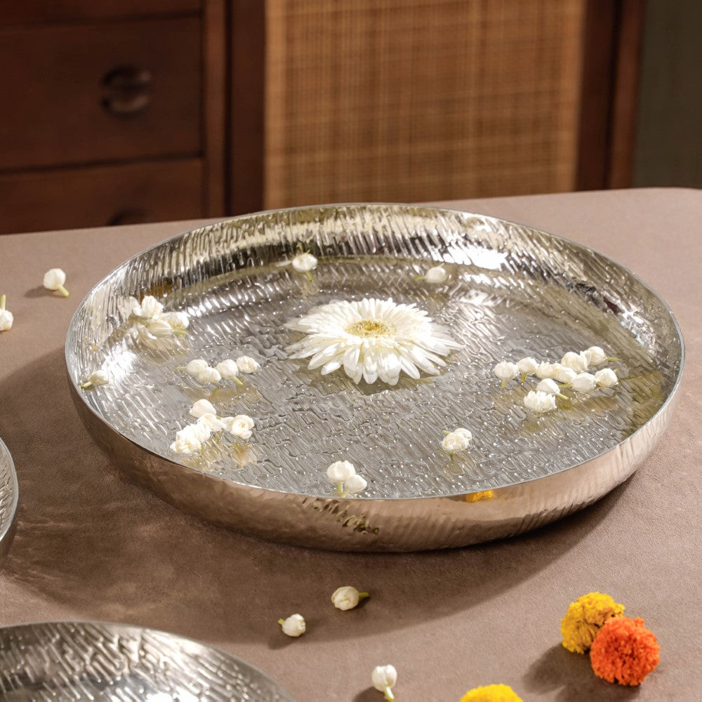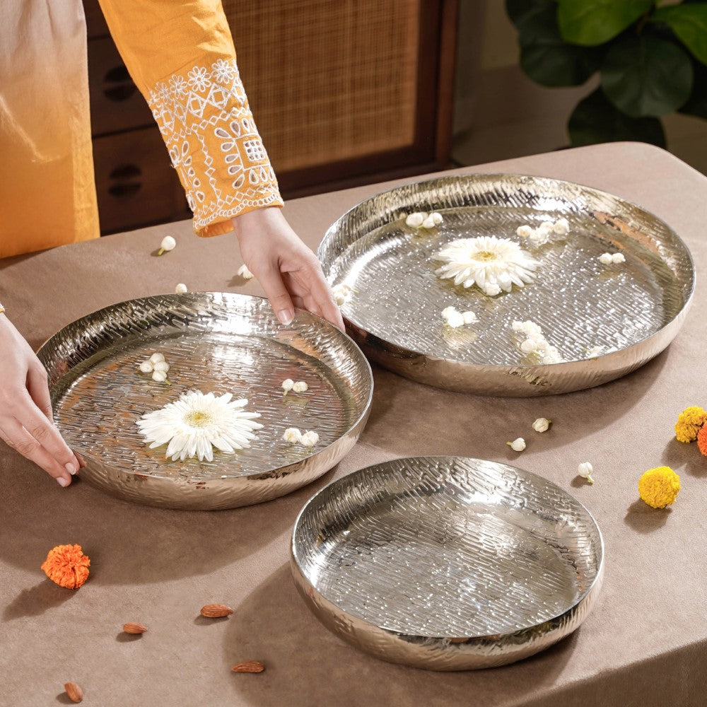 Crafted with utmost care and precision, this set combines timeless elegance with contemporary design. Made from premium quality aluminium material, each Urli plate showcases a stunning textured inner surface, adding a touch of sophistication to any space. Whether used as striking centerpieces, stylish décor accents, or functional serving pieces, these Urli plates are perfect for elevating your home décor. Create mesmerizing tablescapes, adorn them with candles or vibrant flower arrangements, or use them to serve delectable treats. Versatile and visually captivating, our silver Urli plate set of 3 is a must-have for those who appreciate impeccable craftsmanship and a touch of luxury.