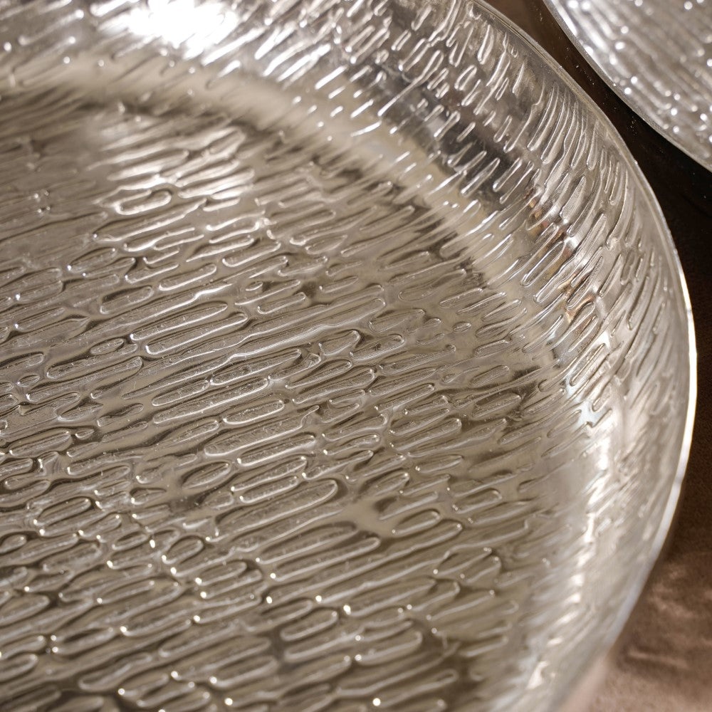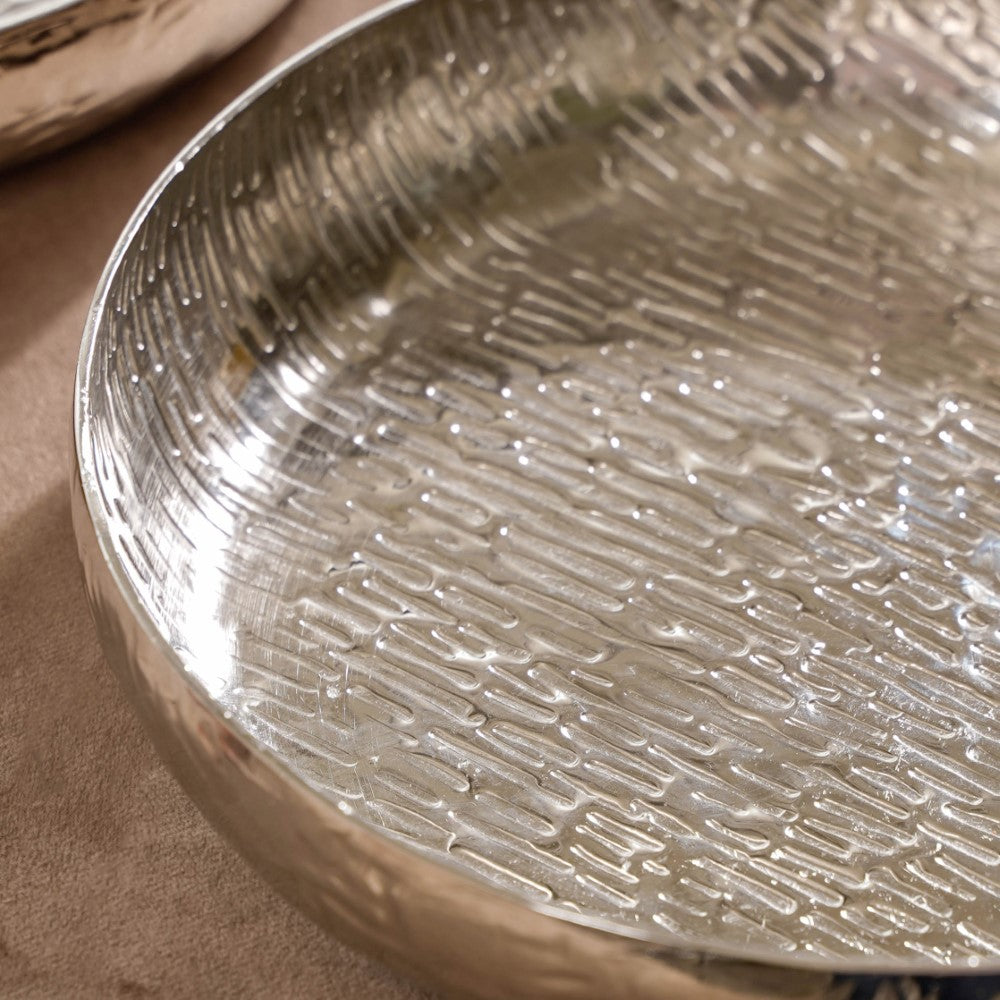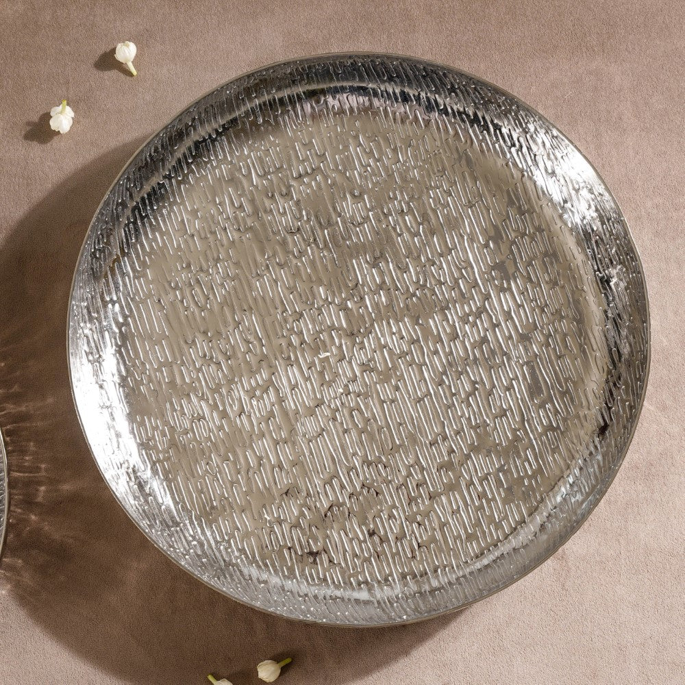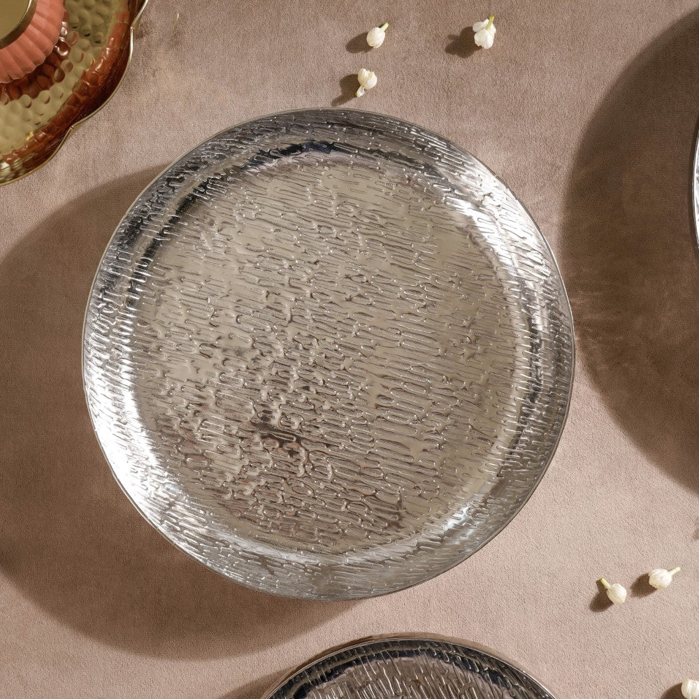 Crafted with utmost care and precision, this set combines timeless elegance with contemporary design. Made from premium quality aluminium material, each Urli plate showcases a stunning textured inner surface, adding a touch of sophistication to any space. Whether used as striking centerpieces, stylish décor accents, or functional serving pieces, these Urli plates are perfect for elevating your home décor. Create mesmerizing tablescapes, adorn them with candles or vibrant flower arrangements, or use them to serve delectable treats. Versatile and visually captivating, our silver Urli plate set of 3 is a must-have for those who appreciate impeccable craftsmanship and a touch of luxury.