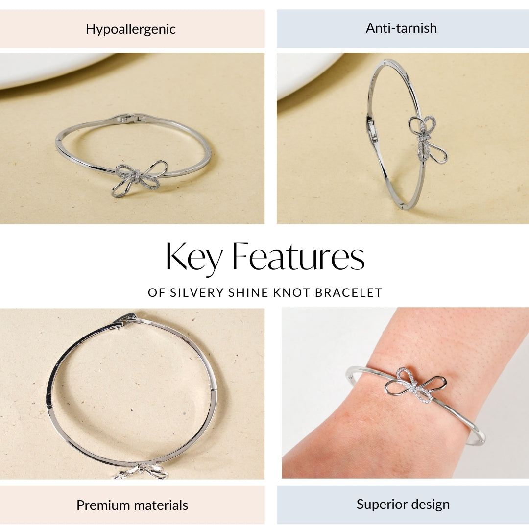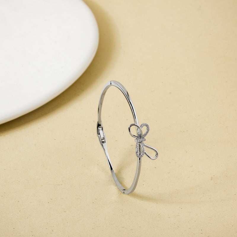 Elegance meets subtle contrast in this beautiful silver bracelet, which is a delicate yet eye-catching piece that blends shimmer with sleek sophistication. At its center, a beautifully sculpted bow takes shape—one ribbon encrusted with dazzling silver stones, the other polished to a smooth, luminous finish. This harmonious balance of texture and shine makes it a timeless accessory, perfect for adding a touch of grace and charm to any outfit.