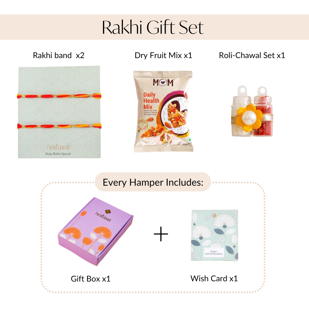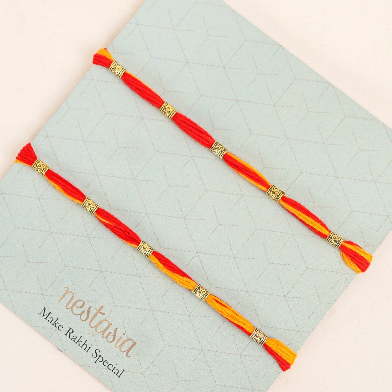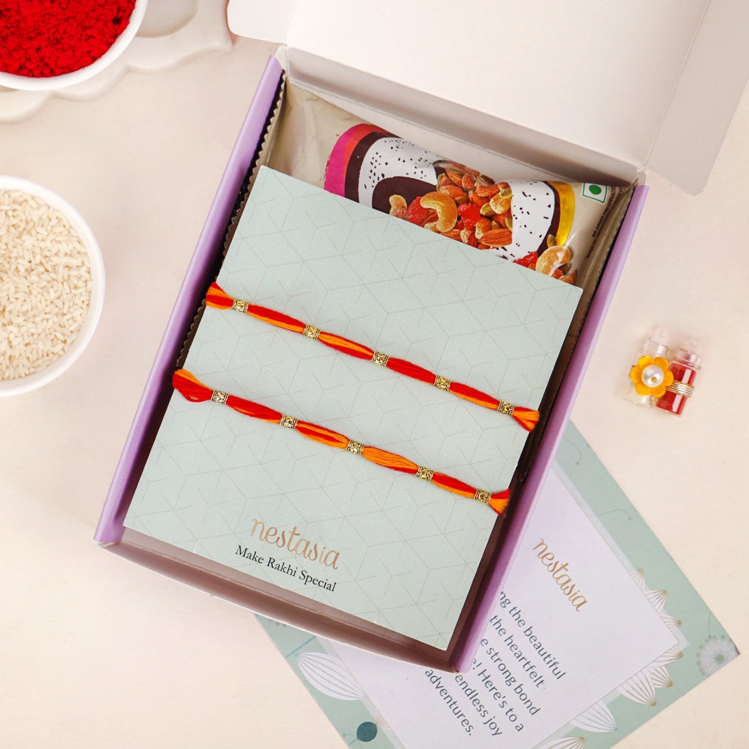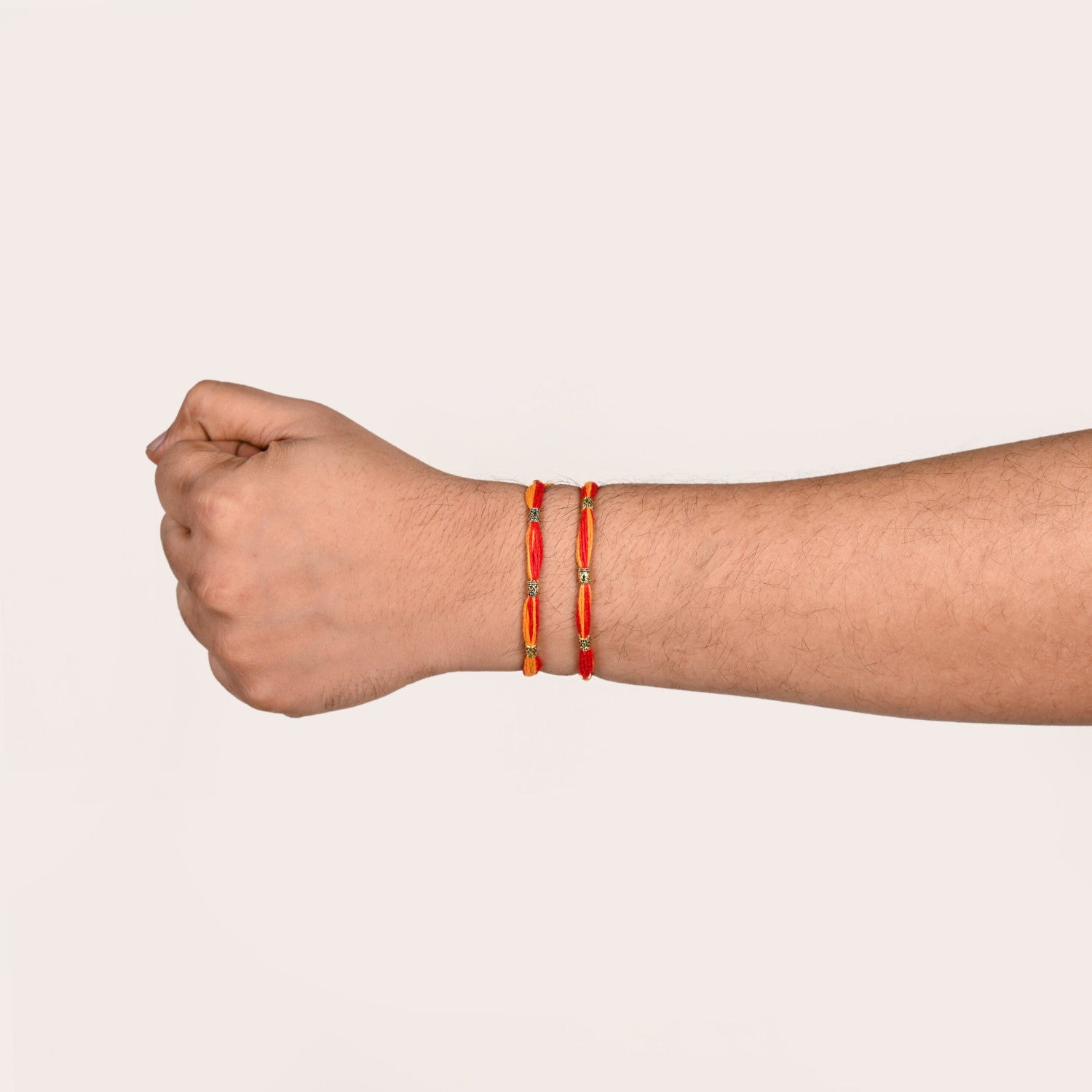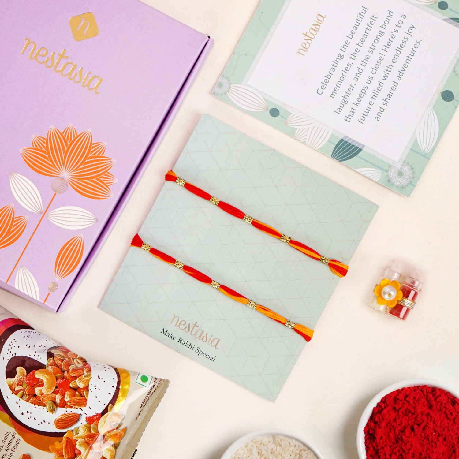 This stunning rakhi is a testament to traditional craftsmanship, where red and orange threads are woven together with precision. Delicate gold ring details add a touch of sophistication, symbolising the eternal sibling bond. For those who appreciate the beauty of tradition but prefer a more understated approach, this rakhi offers a simple yet meaningful way to celebrate the occasion. Its minimalist design ensures that it won't overwhelm, making it an ideal choice for those who want to honour the tradition without going for a heavy, maximalist look. The subtle blend of red and orange hues, complemented by gold accents, creates a harmonious balance that exudes warmth and affection. The set includes 2 rakhis, 1 roli-chawal bottle, and 1 packet of dry fruits, ensuring a complete and thoughtful festive gift.