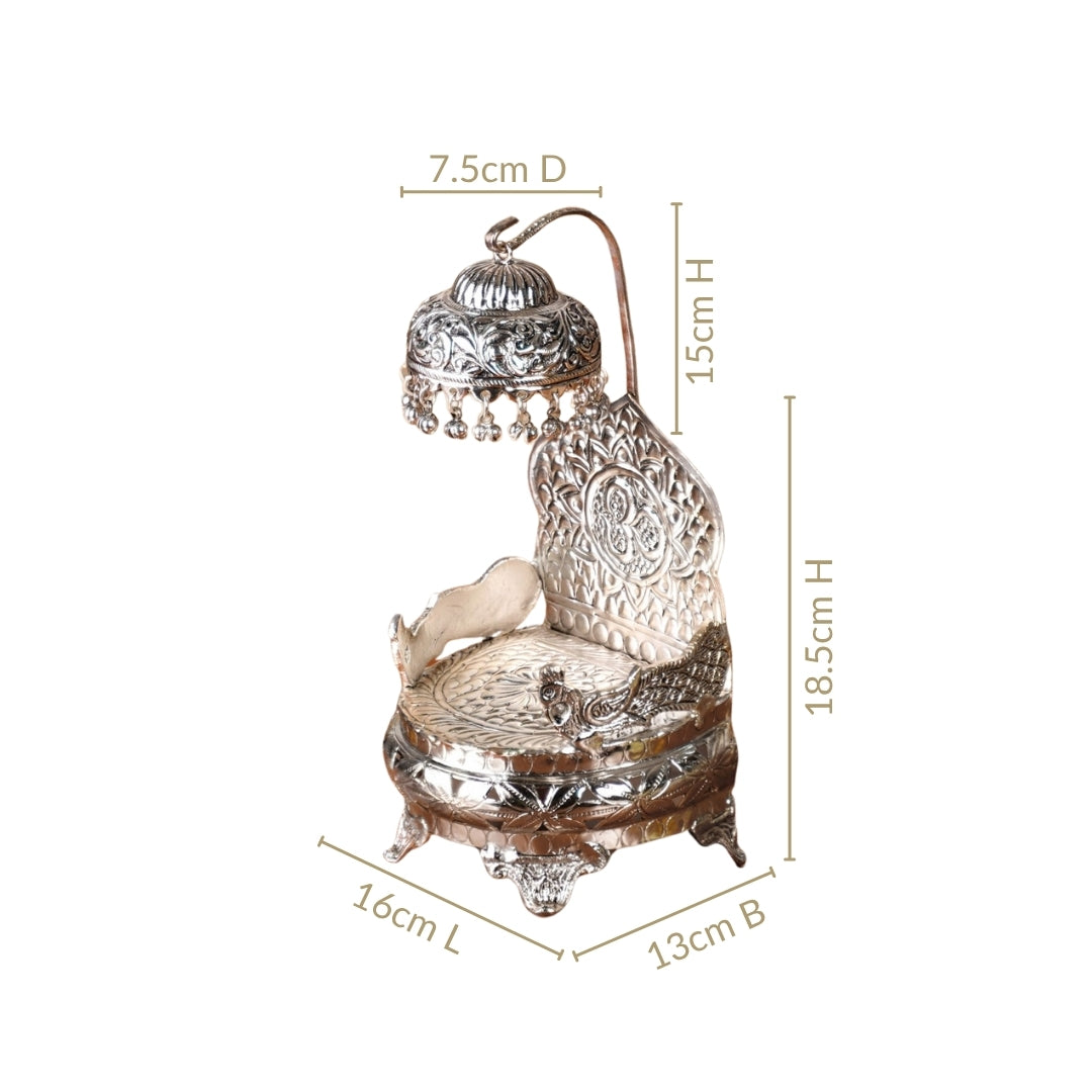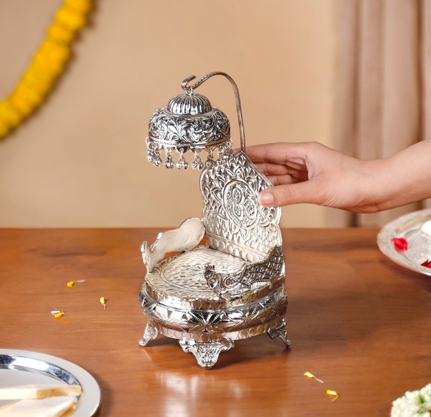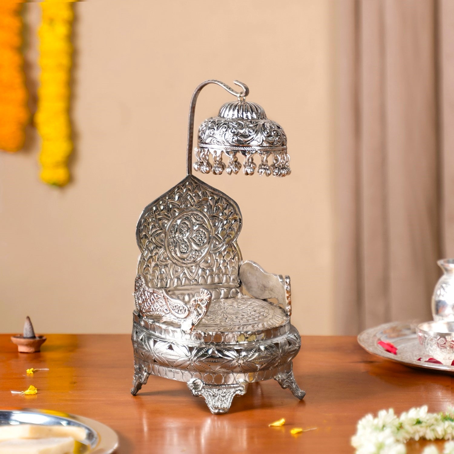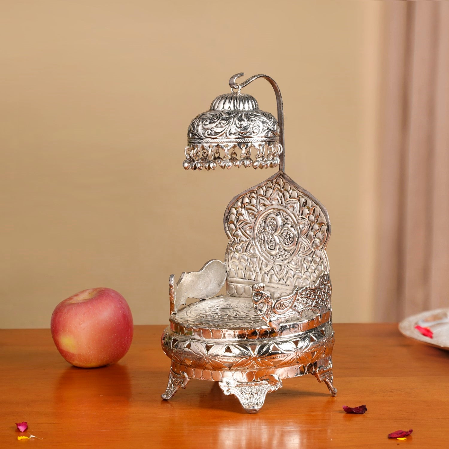 Design: The Singhasan is made from sturdy brass with a silver-toned finish that lends it a serene and devotional appearance. The seat features soft floral engravings, carved with attention to symmetry and balance. Its backrest showcases the sacred ‘Om’ symbol in the centre, surrounded by etched petals, a design element often associated with peace and divinity. Each armrest holds a miniature peacock motif, detailed with feathered textures to subtly represent beauty and grace. The detachable Chatra is styled with delicate filigree and completed with tiny hanging bells, adding traditional charm. The entire structure stands on four sculpted legs, each etched with motifs that match the rest of the design. Overall, the structure is well-proportioned and suitable for compact temple settings.